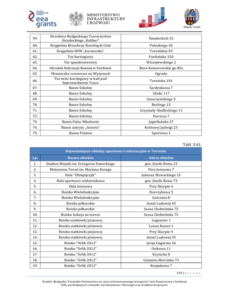60. Strzelnica Bydgoskiego Towarzystwa Strzeleckiego „Kaliber” Kręgielnia Broadway Bowling & Club 61. Kręgielnia HSW „Łuczniczka” Toruńskiej 59 62. Tor kartingowy Fordońska 150 63. Tor speedrowerowy Wiszniewskiego 2 64. Ośrodek Rekreacji Konnej w Fordonie Bora-Komorowskie go 85a 65. Ogrody 67. Miasteczko rowerowe na Wyżynach Tor mini-kartingowy w hali pod hipermarketem Tesco Basen Szkolny Sardynkowa 7 68. Basen Szkolny Glinki 117 69. Basen Szkolny Goszczyńskiego 3 70. Basen Szkolny Berlinga 13 71. Basen Szkolny Grzymały-Siedleckiego 11 72. Basen Szkolny Duracza 7 73. Basen Pałac Młodzieży Jagiellońska 27 74. Basen zakryty „Astoria” Królowej Jadwigi 23 75. Basen Polonia Sportowa 1 59. 66. Śniadeckich 32 Pułaskiego 45 Toruńska 101 Tabl. 3.41. Najważniejsze obiekty sportowe i rekreacyjne w Toruniu Lp. Nazwa obiektu Adres obiektu 1. Stadion Miejski im. Grzegorza Duneckiego gen. Józefa Bema 23 2. Motoarena Toruń im. Mariana Rosego Pera Jonssona 7 3. Hala "Olimpijczyk" Juliusza Słowackiego 15 4. Hala sportowo-widowiskowa gen. Józefa Bema 73 5. Hala tenisowa Przy Skarpie 4 6. Boisko Wielofunkcyjne Storczykowa 5 7. Boisko Wielofunkcyjne Gościnna 8 8. Boisko piłkarskie Armii Ludowej 45 9. Boisko piłkarskie Szosa Chełmińska 75 10. Boisko hokeja na trawie Szosa Chełmińska 75 11. Boisko siatkówki plażowej Legionów 1 12. Boisko siatkówki plażowej Leona Raszei 1 13. Boisko siatkówki plażowej Przy Skarpie 4 14. Boisko siatkówki plażowej Armii Ludowej 45 15. Boisko "Orlik 2012" Jurija Gagarina 36 16. Boisko "Orlik 2012" Osikowa 11 17. Boisko "Orlik 2012" Krynicka 8 18. Boisko "Orlik 2012" Gustawa Morcinka 73 19. Boisko "Orlik 2012" Rzepakowa 7 159 | S t r o n a Projekt „Bydgosko-Toruńskie Partnerstwo na rzecz zrównoważonego transportu” jest finansowany z funduszy EOG, pochodzących z Islandii, Liechtensteinu i Norwegii oraz środków krajowych