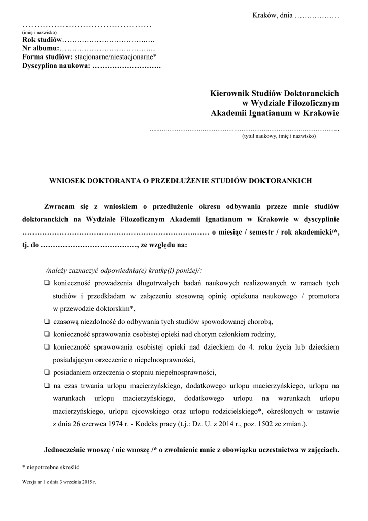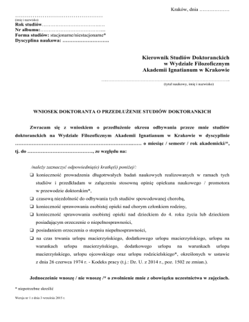 Kraków, dnia ……………… ……………………………………… (imię i nazwisko) Rok studiów…………………………….…. Nr albumu:……………………………….... Forma studiów: stacjonarne/niestacjonarne* Dyscyplina naukowa: ………………………. Kierownik Studiów Doktoranckich w Wydziale Filozoficznym Akademii Ignatianum w Krakowie …..…………………………………………………………………………………….. (tytuł naukowy, imię i nazwisko) WNIOSEK DOKTORANTA O PRZEDŁUŻENIE STUDIÓW DOKTORANKICH Zwracam się z wnioskiem o przedłużenie okresu odbywania przeze mnie studiów doktoranckich na Wydziale Filozoficznym Akademii Ignatianum w Krakowie w dyscyplinie …………………………………………………………….…… o miesiąc / semestr / rok akademicki/*, tj. do …………………………………, ze względu na: /należy zaznaczyć odpowiednią(e) kratkę(i) poniżej/: q konieczność prowadzenia długotrwałych badań naukowych realizowanych w ramach tych studiów i przedkładam w załączeniu stosowną opinię opiekuna naukowego / promotora w przewodzie doktorskim*, q czasową niezdolność do odbywania tych studiów spowodowanej chorobą, q konieczność sprawowania osobistej opieki nad chorym członkiem rodziny, q konieczność sprawowania osobistej opieki nad dzieckiem do 4. roku życia lub dzieckiem posiadającym orzeczenie o niepełnosprawności, q posiadaniem orzeczenia o stopniu niepełnosprawności, q na czas trwania urlopu macierzyńskiego, dodatkowego urlopu macierzyńskiego, urlopu na warunkach urlopu macierzyńskiego, dodatkowego urlopu na warunkach urlopu macierzyńskiego, urlopu ojcowskiego oraz urlopu rodzicielskiego*, określonych w ustawie z dnia 26 czerwca 1974 r. - Kodeks pracy (t.j.: Dz. U. z 2014 r., poz. 1502 ze zmian.). Jednocześnie wnoszę / nie wnoszę /* o zwolnienie mnie z obowiązku uczestnictwa w zajęciach. * niepotrzebne skreślić Wersja nr 1 z dnia 3 września 2015 r. Z uwagi na podaną(e) wyżej przyczynę(y), wniosek swój uzasadniam: ……………………………………………………………………………………………………………… ……………………………………………………………………………………………………………… ……………………………………………………………………………………………………………… ……………………………………………………………………………………………………………… ……………………………………………………………………………………………………………… ……………………………………………………………………………………………………………… ……………………………………………………………………………………………………………… ……………………………………………………………………………………………………………… ……………………………………………………………………………………………………………… ……………………………………………………………………………………………………………… ……………………………………………………………………………………………………………… ……………………………………………………………………………………………………………… ……………………………………………………………………………………………………………… ……………………………………………………………………………………………………………… ……………………………………………………………………………………………………………… ……………………………………………………………………………………………………………… Załączniki: ……………………………………………………………………………………………………………… ……………………………………………………………………………………………………………… ……………………………………………………………………………………………………………… ……………………………………………………………………………………………………………… ………………………….. (podpis doktoranta) Decyzja Kierownika Studiów Doktoranckich: Wyrażam zgodę / nie wyrażam zgody na uwzględnienie powyższego wniosku. Wnoszę o przygotowanie w sprawie projektu stosownej decyzji Kierownika Studiów Doktoranckich. ………….…………………….. (data, pieczęć i podpis Kierownika Studiów Doktoranckich) * niepotrzebne skreślić Wersja nr 1 z dnia 3 września 2015 r.