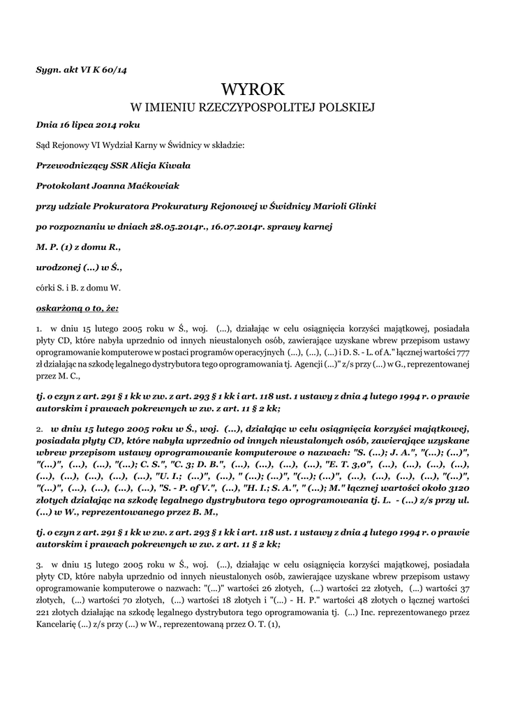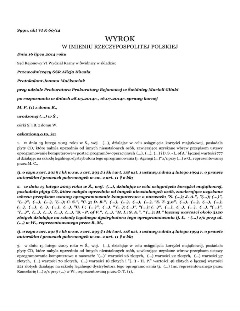 Sygn. akt VI K 60/14 WYROK W IMIENIU RZECZYPOSPOLITEJ POLSKIEJ Dnia 16 lipca 2014 roku Sąd Rejonowy VI Wydział Karny w Świdnicy w składzie: Przewodniczący SSR Alicja Kiwała Protokolant Joanna Maćkowiak przy udziale Prokuratora Prokuratury Rejonowej w Świdnicy Marioli Glinki po rozpoznaniu w dniach 28.05.2014r., 16.07.2014r. sprawy karnej M. P. (1) z domu R., urodzonej (...) w Ś., córki S. i B. z domu W. oskarżoną o to, że: 1. w dniu 15 lutego 2005 roku w Ś., woj. (...), działając w celu osiągnięcia korzyści majątkowej, posiadała płyty CD, które nabyła uprzednio od innych nieustalonych osób, zawierające uzyskane wbrew przepisom ustawy oprogramowanie komputerowe w postaci programów operacyjnych (...), (...), (...) i D. S. - L. of A." łącznej wartości 777 zł działając na szkodę legalnego dystrybutora tego oprogramowania tj. Agencji (...)" z/s przy (...) w G., reprezentowanej przez M. C., tj. o czyn z art. 291 § 1 kk w zw. z art. 293 § 1 kk i art. 118 ust. 1 ustawy z dnia 4 lutego 1994 r. o prawie autorskim i prawach pokrewnych w zw. z art. 11 § 2 kk; 2. w dniu 15 lutego 2005 roku w Ś., woj. (...), działając w celu osiągnięcia korzyści majątkowej, posiadała płyty CD, które nabyła uprzednio od innych nieustalonych osób, zawierające uzyskane wbrew przepisom ustawy oprogramowanie komputerowe o nazwach: "S. (...); J. A.", "(...); (...)", "(...)", (...), (...), "(...); C. S.", "C. 3; D. B.", (...), (...), (...), (...), "E. T. 3,0", (...), (...), (...), (...), (...), (...), (...), (...), (...), "U. I.; (...)", (...), " (...); (...)", "(...); (...)", (...), (...), (...), (...), "(...)", "(...)", (...), (...), (...), (...), "S. - P. of V.", (...), "H. I.; S. A.", " (...); M." łącznej wartości około 3120 złotych działając na szkodę legalnego dystrybutora tego oprogramowania tj. L. - (...) z/s przy ul. (...) w W., reprezentowanego przez B. M., tj. o czyn z art. 291 § 1 kk w zw. z art. 293 § 1 kk i art. 118 ust. 1 ustawy z dnia 4 lutego 1994 r. o prawie autorskim i prawach pokrewnych w zw. z art. 11 § 2 kk; 3. w dniu 15 lutego 2005 roku w Ś., woj. (...), działając w celu osiągnięcia korzyści majątkowej, posiadała płyty CD, które nabyła uprzednio od innych nieustalonych osób, zawierające uzyskane wbrew przepisom ustawy oprogramowanie komputerowe o nazwach: "(...)" wartości 26 złotych, (...) wartości 22 złotych, (...) wartości 37 złotych, (...) wartości 70 złotych, (...) wartości 18 złotych i "(...) - H. P." wartości 48 złotych o łącznej wartości 221 złotych działając na szkodę legalnego dystrybutora tego oprogramowania tj. (...) Inc. reprezentowanego przez Kancelarię (...) z/s przy (...) w W., reprezentowaną przez O. T. (1), tj. o czyn z art. 291 § 1 kk w zw. z art. 293 § 1 kk i art. 118 ust. 1 ustawy z dnia 4 lutego 1994 r. o prawie autorskim i prawach pokrewnych w zw. z art. 11 § 2 kk; W. W. (2), urodzonego (...) w G., syna T. i K. z domu K. oskarżonego o to, że: 4. w dniu 15 lutego 2005 roku w Ś., woj. (...), działając w celu osiągnięcia korzyści majątkowej, posiadał na jednostce centralnej komputera, które uprzednio nabył od innych nieustalonych osób, zainstalowane nielegalnie rozpowszechnione programy komputerowe w postaci programu operacyjnego "(...)" wartości 1490 złotych, pakietu biurowego "M. (...) P." wartości 3490 złotych, programu graficznego "(...)" wartości 3867 złotych, i gry (...) wartości 260 złotych o łącznej wartości nie mniejszej niż 9.107 złotych działając na szkodę legalnego dystrybutora tego oprogramowania tj. Agencji (...)" z/s przy (...) w G., reprezentowanej przez M. C., tj. o czyn z art. 291 § 1 kk w zw. z art. 293 § 1 kk; 5. w dniu 15 lutego 2005 roku w Ś., woj. (...), działając w celu osiągnięcia korzyści majątkowej, posiadał płyty CD, które nabył uprzednio od innych nieustalonych osób, zawierające uzyskane wbrew przepisom ustawy oprogramowanie komputerowe w postaci programów operacyjnych: (...) P. (...)", (...) i (...), programów edukacyjnych: "(...)", "I. L. C. (...)", (...), i (...) i (...) , pakietu biurowego: "M. (...)", programu graficznego "A. (...).0" i gry: "D. S.; (...)" łącznej wartości nie mniejszej niż 10.574 zł działając na szkodę legalnego dystrybutora tego oprogramowania tj. Agencji (...)" z/s przy (...) w G., reprezentowanej przez M. C., tj. o czyn z art. 291 § 1 kk w zw. z art. 293 § 1 kk i art. 118 ust. 1 ustawy z dnia 4 lutego 1994 r. o prawie autorskim i prawach pokrewnych (Dz.U. z 2006 roku nr 90, poz. 631) w zw. z art. 11 § 2 kk; 6. w dniu 15 lutego 2005 roku w Ś., woj. (...), działając w celu osiągnięcia korzyści majątkowej, posiadał na jednostce centralnej komputera, które uprzednio nabył od innych nieustalonych osób, zainstalowane nielegalnie rozpowszechnione programy komputerowe w postaci programów komputerowych o nazwach : (...), "W. 40.000; (...)", (...), "G. (...).50", (...), (...), "(...) U. E.", (...), "R. O.; R. on S. E.", (...), "S.; W. (...) A.", "S. M.'s P.", (...), "(...) (...)(...)", (...) łącznej wartości nie mniejszej niż 1920 złotych działając na szkodę legalnego dystrybutora tego oprogramowania tj. L. - (...) z/s przy ul. (...) w W., reprezentowanego przez B. M., tj. o czyn z art. 291 § 1 kk w zw. z art. 293 § 1 kk; 7. w dniu 15 lutego 2005 roku w Ś., woj. (...), działając w celu osiągnięcia korzyści majątkowej, posiadał płyty CD, które nabył uprzednio od innych nieustalonych osób, zawierające uzyskane wbrew przepisom ustawy oprogramowanie w postaci programów komputerowych o nazwach: (...), (...), (...), (...), (...), (...), (...), (...), "N.; (...) (...) I.", (...), (...), (...), (...), "A. (...) W.; S. M.", "(...) B. (...)", " (...) (...) D. 3", "S.; W. of A.", "(...) (...) and (...) (...)", (...), (...), (...), "W. (...): D. (...)", (...), "S. (...); L. the L.", (...), (...), "R.; T. (...)", (...), "R. O.; R. of S. E.", "(...) M. (...)", D. S.