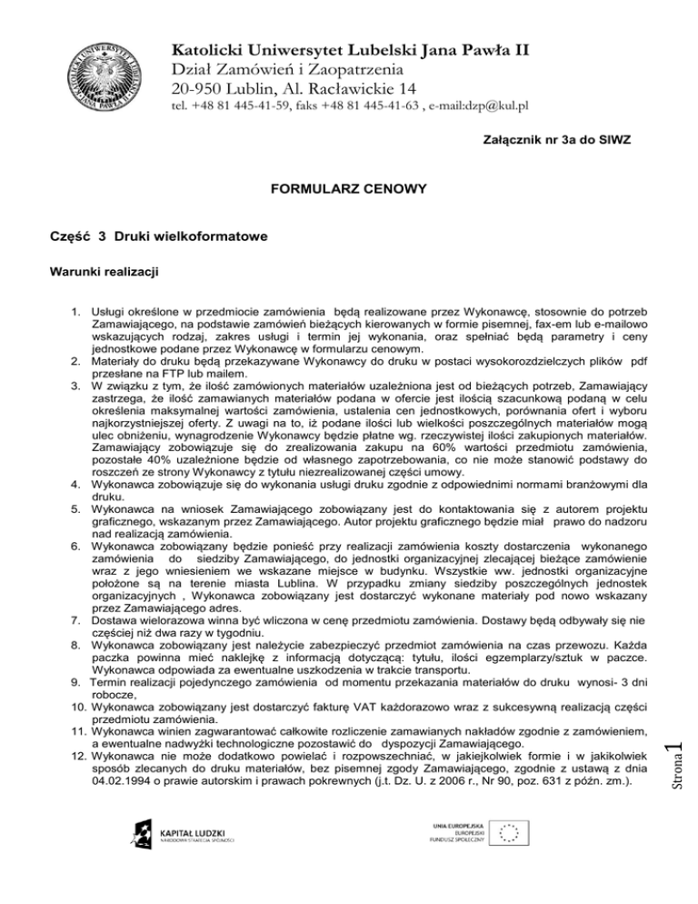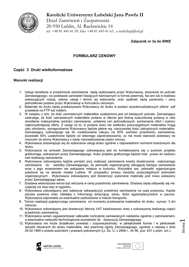 Katolicki Uniwersytet Lubelski Jana Pawła II Dział Zamówień i Zaopatrzenia 20-950 Lublin, Al. Racławickie 14 tel. +48 81 445-41-59, faks +48 81 445-41-63 , e-mail:[email protected] Załącznik nr 3a do SIWZ FORMULARZ CENOWY Część 3 Druki wielkoformatowe Strona 1. Usługi określone w przedmiocie zamówienia będą realizowane przez Wykonawcę, stosownie do potrzeb Zamawiającego, na podstawie zamówień bieżących kierowanych w formie pisemnej, fax-em lub e-mailowo wskazujących rodzaj, zakres usługi i termin jej wykonania, oraz spełniać będą parametry i ceny jednostkowe podane przez Wykonawcę w formularzu cenowym. 2. Materiały do druku będą przekazywane Wykonawcy do druku w postaci wysokorozdzielczych plików pdf przesłane na FTP lub mailem. 3. W związku z tym, że ilość zamówionych materiałów uzależniona jest od bieżących potrzeb, Zamawiający zastrzega, że ilość zamawianych materiałów podana w ofercie jest ilością szacunkową podaną w celu określenia maksymalnej wartości zamówienia, ustalenia cen jednostkowych, porównania ofert i wyboru najkorzystniejszej oferty. Z uwagi na to, iż podane ilości lub wielkości poszczególnych materiałów mogą ulec obniżeniu, wynagrodzenie Wykonawcy będzie płatne wg. rzeczywistej ilości zakupionych materiałów. Zamawiający zobowiązuje się do zrealizowania zakupu na 60% wartości przedmiotu zamówienia, pozostałe 40% uzależnione będzie od własnego zapotrzebowania, co nie może stanowić podstawy do roszczeń ze strony Wykonawcy z tytułu niezrealizowanej części umowy. 4. Wykonawca zobowiązuje się do wykonania usługi druku zgodnie z odpowiednimi normami branżowymi dla druku. 5. Wykonawca na wniosek Zamawiającego zobowiązany jest do kontaktowania się z autorem projektu graficznego, wskazanym przez Zamawiającego. Autor projektu graficznego będzie miał prawo do nadzoru nad realizacją zamówienia. 6. Wykonawca zobowiązany będzie ponieść przy realizacji zamówienia koszty dostarczenia wykonanego zamówienia do siedziby Zamawiającego, do jednostki organizacyjnej zlecającej bieżące zamówienie wraz z jego wniesieniem we wskazane miejsce w budynku. Wszystkie ww. jednostki organizacyjne położone są na terenie miasta Lublina. W przypadku zmiany siedziby poszczególnych jednostek organizacyjnych , Wykonawca zobowiązany jest dostarczyć wykonane materiały pod nowo wskazany przez Zamawiającego adres. 7. Dostawa wielorazowa winna być wliczona w cenę przedmiotu zamówienia. Dostawy będą odbywały się nie częściej niż dwa razy w tygodniu. 8. Wykonawca zobowiązany jest należycie zabezpieczyć przedmiot zamówienia na czas przewozu. Każda paczka powinna mieć naklejkę z informacją dotyczącą: tytułu, ilości egzemplarzy/sztuk w paczce. Wykonawca odpowiada za ewentualne uszkodzenia w trakcie transportu. 9. Termin realizacji pojedynczego zamówienia od momentu przekazania materiałów do druku wynosi- 3 dni robocze, 10. Wykonawca zobowiązany jest dostarczyć fakturę VAT każdorazowo wraz z sukcesywną realizacją części przedmiotu zamówienia. 11. Wykonawca winien zagwarantować całkowite rozliczenie zamawianych nakładów zgodnie z zamówieniem, a ewentualne nadwyżki technologiczne pozostawić do dyspozycji Zamawiającego. 12. Wykonawca nie może dodatkowo powielać i rozpowszechniać, w jakiejkolwiek formie i w jakikolwiek sposób zlecanych do druku materiałów, bez pisemnej zgody Zamawiającego, zgodnie z ustawą z dnia 04.02.1994 o prawie autorskim i prawach pokrewnych (j.t. Dz. U. z 2006 r., Nr 90, poz. 631 z późn. zm.). 1 Warunki realizacji Katolicki Uniwersytet Lubelski Jana Pawła II Dział Zamówień i Zaopatrzenia 20-950 Lublin, Al. Racławickie 14 tel. +48 81 445-41-59, faks +48 81 445-41-63 , e-mail:[email protected] Zadanie 1. PLAKATY Format A0 Papier Ilość kolorów Papier fotograficzny 4+0 Termin Na życzenie Nakład w sztukach 2 PLAKATY 1 Format A0 Papier papier 170g Ilość kolorów 4+0 Termin Na życzenie 1 Format B1 Papier Ilość kolorów Kreda 200g 4+0 Termin Na życzenie 130- 10 szt. Nakład w sztukach 2 PLAKATY 1 Ilość kolorów B1 Kreda 200g 4+0 Termin Na życzenie 130- 1 szt. Nakład w sztukach 2 PLAKATY 1 Format Papier 1 szt. Nakład w sztukach 2 PLAKATY Format Papier 18 szt. Ilość kolorów A1 Kreda 200g 4+0 Termin Na życzenie 130- 3 szt. Cena jednostkowa Wartość brutto brutto za sztukę 4 5 2x3x4 1 Liczba nakładów 3 Cena jednostkowa Wartość brutto brutto za sztukę 4 5 2x3x4 15 Liczba nakładów 3 Cena jednostkowa Wartość brutto brutto za sztukę 4 5 2x3x4 3 Liczba nakładów 3 Cena jednostkowa Wartość brutto brutto za sztukę 4 5 2x3x4 10 Liczba nakładów 3 Cena jednostkowa Wartość brutto brutto za sztukę 4 5 2x3x4 30 2 1 Liczba nakładów 3 Strona Nakład w sztukach 2 PLAKATY Katolicki Uniwersytet Lubelski Jana Pawła II Dział Zamówień i Zaopatrzenia 20-950 Lublin, Al. Racławickie 14 tel. +48 81 445-41-59, faks +48 81 445-41-63 , e-mail:[email protected] Format Papier Ilość kolorów A1 Kreda 200g 4+0 Termin Na życzenie 130- Nakład w sztukach 2 PLAKATY 1 Format Papier Ilość kolorów A1 Kreda 200g 4+0 Termin Na życzenie 130- 1 Ilość kolorów A1 Kreda 200g 4+0 Termin Na życzenie 130- 1 Ilość kolorów B2 Kreda 200g 4+0 Termin Na życzenie 130- 20 szt. Nakład w sztukach 2 PLAKATY 1 Format Papier 5 szt. Nakład w sztukach 2 PLAKATY Format Papier 1 szt. Nakład w sztukach 2 PLAKATY Format Papier 15 szt. Ilość kolorów A2 Kreda 200g 4+0 Termin Na życzenie 130- 10 szt. Cena jednostkowa Wartość brutto brutto za sztukę 4 5 2x3x4 4 Liczba nakładów 3 Cena jednostkowa Wartość brutto brutto za sztukę 4 5 2x3x4 9 Liczba nakładów 3 Cena jednostkowa Wartość brutto brutto za sztukę 4 5 2x3x4 5 Liczba nakładów 3 Cena jednostkowa Wartość brutto brutto za sztukę 4 5 2x3x4 3 Liczba nakładów 3 Cena jednostkowa Wartość brutto brutto za sztukę 4 5 2x3x4 3 3 1 Liczba nakładów 3 Strona Nakład w sztukach 2
