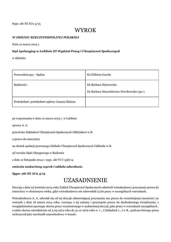 Sygn. akt III AUa 4/15 WYROK W IMIENIU RZECZYPOSPOLITEJ POLSKIEJ Dnia 12 marca 2015 r. Sąd Apelacyjny w Lublinie III Wydział Pracy i Ubezpieczeń Społecznych w składzie: Przewodniczący - Sędzia SA Elżbieta Gawda Sędziowie: SA Barbara Hejwowska SA Barbara Mazurkiewicz-Nowikowska (spr.) Protokolant: protokolant sądowy Joanna Malena po rozpoznaniu w dniu 12 marca 2015 r. w Lublinie sprawy A. A. przeciwko Zakładowi Ubezpieczeń Społecznych Oddziałowi w R. o prawo do emerytury na skutek apelacji pozwanego Zakładu Ubezpieczeń Społecznych Oddziału w R. od wyroku Sądu Okręgowego w Radomiu z dnia 12 listopada 2014 r. sygn. akt VI U 538/14 zmienia zaskarżony wyrok i oddala odwołanie. Sygn. akt III AUa 4/15 UZASADNIENIE Decyzją z dnia 23 kwietnia 2014 roku Zakład Ubezpieczeń Społecznych odmówił wnioskodawcy przyznania prawa do emerytury w obniżonym wieku, gdyż wnioskodawca nie udowodnił 15 lat pracy w szczególnych warunkach. Wnioskodawca A. A. odwołał się od tej decyzji odmawiającej przyznania mu prawa do wcześniejszej emerytury na wniosek z dnia 18 marca 2014 roku, wnosząc o jej zmianę i przyznanie prawa do dochodzonego świadczenia, z uwzględnieniem spornego okresu pracy wymienionego w zaskarżonej decyzji, jako pracy w warunkach szczególnych , a także okresu zatrudnienia od 3.05.1975 roku do 31.10.1979 roku w (...) Zakładach (...) w R., podczas którego pracę wykonywał jako mechanik samochodowy w kanale. W odpowiedzi na odwołanie Zakład Ubezpieczeń Społecznych wniósł o jego oddalenie. W uzasadnieniu organ rentowy wskazał, iż wnioskodawca na dzień 1 stycznia 1999 roku posiada udokumentowany ogólny staż pracy w wymiarze ponad 25 lat, jednakże nie udowodnił żadnego okresu pracy w warunkach szczególnych. Do stażu pracy w warunkach szczególnych nie zaliczono okresu zatrudnienia od 8.11.1979 roku do 09.02.1993 r. w Społecznym Przedsiębiorstwie (...) w R., ponieważ przedłożone świadectwo pracy w warunkach szczególnych nie spełnia wymagań formalnych tj. charakter wykonywanej pracy nie został określony ściśle według wykazu, działu i pozycji rozporządzenia Rady Ministrów z dnia 7 lutego 1983 roku w sprawie wieku emerytalnego pracowników zatrudnionych w szczególnych warunkach lub w szczególnym charakterze, a także niezgodnie z zarządzeniem resortowym, pod które podlegał zakład pracy (odpowiedź na odwołanie – k.4). Wyrokiem z dnia 12 listopada 2014 roku Sąd Okręgowy w Radomiu zmienił zaskarżoną decyzję w ten sposób, że przyznał wnioskodawcy A. A. prawo do emerytury od dnia 1 marca 2014 roku w punkcie I, a w punkcie II zasądził od ZUS na rzecz wnioskodawcy kwotę 120 zł tytułem zwrotu kosztów procesu za II instancję. Swoje rozstrzygnięcie Sąd Okręgowy oparł na następujących ustaleniach faktycznych i ich ocenie prawnej. A. A. urodzony dnia (...) złożył w Zakładzie Ubezpieczeń Społecznych Oddziale w R. w dniu 18 marca 2014 roku wniosek o przyznanie mu prawa do emerytury. Nie pracuje. Jest uprawniony do świadczenia przedemerytalnego. Nie należy do żadnego z Otwartych Funduszy Emerytalnych. Sąd Okręgowy stwierdził, że organ rentowy ustalił, iż wnioskodawca na dzień 1 stycznia 1999 roku udowodnił ogólny okres ubezpieczenia w wymiarze 26 lat 7 miesięcy i 17 dni, czego skarżący nie kwestionuje. W ocenie organu rentowego A. A. początkowo nie udowodnił wymaganego 15-letniego okresu pracy w warunkach szczególnych. Zakład Ubezpieczeń Społecznych do stażu pracy w warunkach szczególnych nie zaliczył wnioskodawcy okresu zatrudnienia na stanowisku mechanika samochodowego od 08.11.1979 r. do 09.02.1993 r. w Społecznym Przedsiębiorstwie (...) w R. (decyzja z dn. 23.04.2013 r. - akta ZUS). Po przeprowadzeniu ponownego postępowania wyjaśniającego, w wyniku przedłożonych przez wnioskodawcę nowych dowodów, w szczególności świadectwa wykonywania pracy w warunkach szczególnych z dnia 14 maja 2014 roku, organ rentowy zaliczył wnioskodawcy okres w ilości 13 lat 2 miesięcy i 26 dni) do stażu pracy w warunkach szczególnych. Wnioskodawca podnosił, iż pracę w warunkach szczególnych wykonywał również w (...) Zakładach (...) w R. w okresie od 03.05.1975 r. do 31.10.1979 r. na stanowisku mechanika samochodowego w kanale. Sąd Okręgowy stwierdził, że A. A. był zatrudniony w (...) Zakładach (...) w R. w okresie od 3 maja 1975 r. do 31 października 1979 r. w pełnym wymiarze czasu pracy na podstawie umowy o pracę zawartej wpierw na okres próbny, a po jego upływie na czas nieokreślony na stanowisku mechanika napraw pojazdów samochodowych. Zatrudniony został w Wydziale PZ (tj. wydział podzespołów). Pracował w brygadzie Demontażu Podzespołów (w skład jej wchodziło 4-5 mechaników oraz spawacz). Zajmował się demontażem autobusów marki (...). Praca jego polegała wpierw na spuszczeniu olejów z tylnego mostu skrzyni biegów i przekładni kierowniczej, paliwa (oleju napędowego) ze zbiornika, płynu hamulcowego, a następnie wymontowaniu podzespołów (silniki demontował inny pracownik). Demontował wszystkie podzespoły: przednie zawieszenie, tylny most, skrzynię biegów, zbiorniki powietrza, zawory powietrzne, całą instalację pneumatyczną wspomagania hamulców, pedał gazu, hamulca, zbiornik paliwa, przewody powietrza, pompę hamulcową, zbiornik na płyn hamulcowy, serwo - siłowniki hamulcowe, wały napędowe, instalację elektryczną. Odbywało się to w ten sposób, że samochód wstawiano na podnośniki, potem na wózki technologiczne; jeden stał przed przednią osią, drugi za tylnym mostem. Wózki technologiczne znajdowały się na dwóch szynach, nie były poniżej poziomu podłogi. Jak ustawiono na nich samochód, to wówczas stał on na wysokości 1,40 m, był bez kół i bez silnika. By zdemontować jakąś część nadwozia wymagane było, by wnioskodawca wszedł pod samochód na klęczkach i w pozycji klęczącej lub pół-klęczącej prac