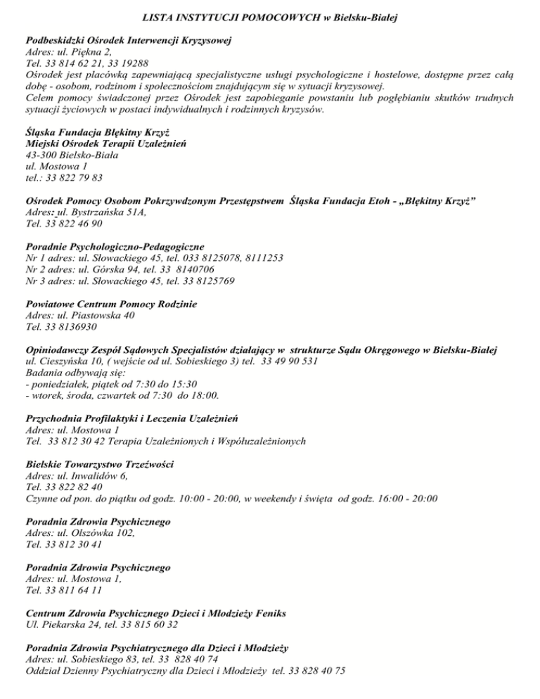 LISTA INSTYTUCJI POMOCOWYCH w Bielsku-Białej Podbeskidzki Ośrodek Interwencji Kryzysowej Adres: ul. Piękna 2, Tel. 33 814 62 21, 33 19288 Ośrodek jest placówką zapewniającą specjalistyczne usługi psychologiczne i hostelowe, dostępne przez całą dobę - osobom, rodzinom i społecznościom znajdującym się w sytuacji kryzysowej. Celem pomocy świadczonej przez Ośrodek jest zapobieganie powstaniu lub pogłębianiu skutków trudnych sytuacji życiowych w postaci indywidualnych i rodzinnych kryzysów. Śląska Fundacja Błękitny Krzyż Miejski Ośrodek Terapii Uzależnień 43-300 Bielsko-Biała ul. Mostowa 1 tel.: 33 822 79 83 Ośrodek Pomocy Osobom Pokrzywdzonym Przestępstwem Śląska Fundacja Etoh - „Błękitny Krzyż” Adres: ul. Bystrzańska 51A, Tel. 33 822 46 90 Poradnie Psychologiczno-Pedagogiczne Nr 1 adres: ul. Słowackiego 45, tel. 033 8125078, 8111253 Nr 2 adres: ul. Górska 94, tel. 33 8140706 Nr 3 adres: ul. Słowackiego 45, tel. 33 8125769 Powiatowe Centrum Pomocy Rodzinie Adres: ul. Piastowska 40 Tel. 33 8136930 Opiniodawczy Zespół Sądowych Specjalistów działający w strukturze Sądu Okręgowego w Bielsku-Białej ul. Cieszyńska 10, ( wejście od ul. Sobieskiego 3) tel. 33 49 90 531 Badania odbywają się: - poniedziałek, piątek od 7:30 do 15:30 - wtorek, środa, czwartek od 7:30 do 18:00. Przychodnia Profilaktyki i Leczenia Uzależnień Adres: ul. Mostowa 1 Tel. 33 812 30 42 Terapia Uzależnionych i Współuzależnionych Bielskie Towarzystwo Trzeźwości Adres: ul. Inwalidów 6, Tel. 33 822 82 40 Czynne od pon. do piątku od godz. 10:00 - 20:00, w weekendy i święta od godz. 16:00 - 20:00 Poradnia Zdrowia Psychicznego Adres: ul. Olszówka 102, Tel. 33 812 30 41 Poradnia Zdrowia Psychicznego Adres: ul. Mostowa 1, Tel. 33 811 64 11 Centrum Zdrowia Psychicznego Dzieci i Młodzieży Feniks Ul. Piekarska 24, tel. 33 815 60 32 Poradnia Zdrowia Psychiatrycznego dla Dzieci i Młodzieży Adres: ul. Sobieskiego 83, tel. 33 828 40 74 Oddział Dzienny Psychiatryczny dla Dzieci i Młodzieży tel. 33 828 40 75 Prokuratura Rejonowa Bielsko-Biała – Południe Adres: ul. Sobieskiego 9, Tel. 33 475 85 00 Sąd Okręgowy Adres: ul. Cieszyńska 10, Tel. 33 499 04 99 Sąd Rejonowy Adres: ul. Mickiewicza 22, Tel. 33 499 78 00 Miejski Ośrodek Pomocy Społecznej Adres: ul. Miarki 11, Tel. 33 499 56 00 Pieniądze jako pomoc finansowa, książki, zapomogi Dział Opieki nad Dzieckiem i Rodzina - umieszczanie dziecka w Pogotowiu Opiekuńczym, w Rodzinie Zastępczej, izolowanie od sprawcy Pracownik socjalny - praca socjalna Konsultant do spraw uzależnień Pogotowie Opiekuńcze Adres: ul. Lompy 7 Tel. 33 811 73 43 Bez decyzji sądu można umieścić dziecko na 24 godziny w PO. Diecezjalny Ośrodek Wspierania Rodziny Adres: ul. Bystrzańska 55C, Tel. 33 810 12 55 Poradnictwo rodzinne (również mediacje), poradnictwo prawne, psychologiczne, pomoc materialna, konsultacje. Śląski Ośrodek Fundacji Prasterno 43-300 Bielsko - Biała, ul. Pl. Fabryczny 3, Tel. 33 816 59 16 Grupy wsparcia dla młodzieży i rodziców. Wojewódzki Ośrodek Adopcyjny Filia w Bielsku-Białej Adres: Ul. Potok 6 Tel. 33 815 09 84 Policyjna Izba Dziecka ds. Nieletnich Ul. Długa 12 Te. 33 812 13 42 Biuro Poselskie Jacka Falfusa Adres: ul. Mostowa 1 Tel. 33 828 39 60 Bezpłatne porady prawne Niebieska Linia - 22 668 70 00 - Ogólnopolskie Pogotowie dla Ofiar Przemocy w Rodzinie Pomarańczowa Linia- 801 140 068 - Informacje i konsultacje dla rodziców i młodzieży, którym picie alkoholu, zażywanie narkotyków lub inne zachowania o cechach uzależnienia utrudniają funkcjonowanie i porozumiewanie się ze sobą.