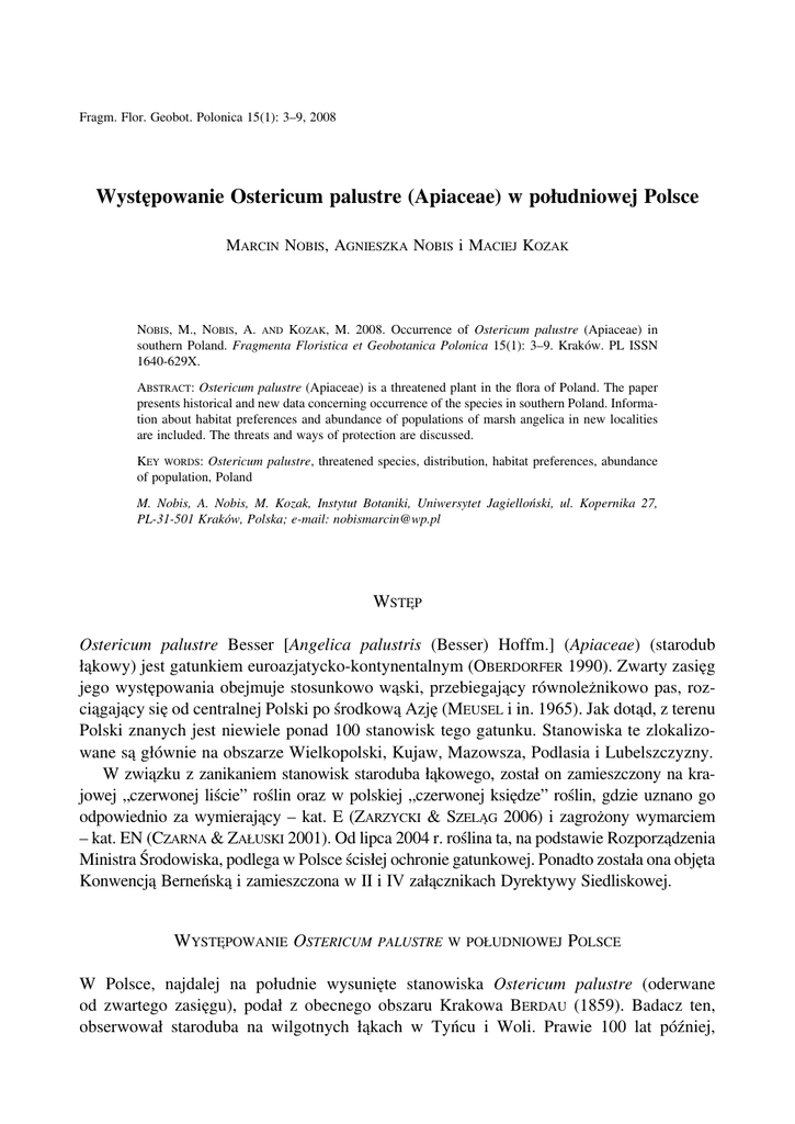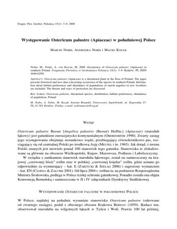 Fragm. Flor. Geobot. Polonica 15(1): 3–9, 2008 Występowanie Ostericum palustre (Apiaceae) w południowej Polsce MARCIN NOBIS, AGNIESZKA NOBIS i MACIEJ KOZAK NOBIS, M., NOBIS, A. AND KOZAK, M. 2008. Occurrence of Ostericum palustre (Apiaceae) in southern Poland. Fragmenta Floristica et Geobotanica Polonica 15(1): 3–9. Kraków. PL ISSN 1640-629X. ABSTRACT: Ostericum palustre (Apiaceae) is a threatened plant in the flora of Poland. The paper presents historical and new data concerning occurrence of the species in southern Poland. Information about habitat preferences and abundance of populations of marsh angelica in new localities are included. The threats and ways of protection are discussed. KEY WORDS: Ostericum palustre, threatened species, distribution, habitat preferences, abundance of population, Poland M. Nobis, A. Nobis, M. Kozak, Instytut Botaniki, Uniwersytet Jagielloński, ul. Kopernika 27, PL-31-501 Kraków, Polska; e-mail: [email protected] WSTĘP Ostericum palustre Besser [Angelica palustris (Besser) Hoffm.] (Apiaceae) (starodub łąkowy) jest gatunkiem euroazjatycko-kontynentalnym (OBERDORFER 1990). Zwarty zasięg jego występowania obejmuje stosunkowo wąski, przebiegający równoleżnikowo pas, rozciągający się od centralnej Polski po środkową Azję (MEUSEL i in. 1965). Jak dotąd, z terenu Polski znanych jest niewiele ponad 100 stanowisk tego gatunku. Stanowiska te zlokalizowane są głównie na obszarze Wielkopolski, Kujaw, Mazowsza, Podlasia i Lubelszczyzny. W związku z zanikaniem stanowisk staroduba łąkowego, został on zamieszczony na krajowej „czerwonej liście” roślin oraz w polskiej „czerwonej księdze” roślin, gdzie uznano go odpowiednio za wymierający – kat. E (ZARZYCKI & SZELĄG 2006) i zagrożony wymarciem – kat. EN (CZARNA & ZAŁUSKI 2001). Od lipca 2004 r. roślina ta, na podstawie Rozporządzenia Ministra Środowiska, podlega w Polsce ścisłej ochronie gatunkowej. Ponadto została ona objęta Konwencją Berneńską i zamieszczona w II i IV załącznikach Dyrektywy Siedliskowej. WYSTĘPOWANIE OSTERICUM PALUSTRE W POŁUDNIOWEJ POLSCE W Polsce, najdalej na południe wysunięte stanowiska Ostericum palustre (oderwane od zwartego zasięgu), podał z obecnego obszaru Krakowa BERDAU (1859). Badacz ten, obserwował staroduba na wilgotnych łąkach w Tyńcu i Woli. Prawie 100 lat później, 4 Fragm. Flor. Geobot. Polonica 15(1), 2008 5 września 1941 r. roślinę tę „na mokrych łąkach w Rakowicach pod Krakowem” zbierał Bogumił Pawłowski. W zielniku Instytutu Botaniki PAN w Krakowie znajdują się dwa, spięte razem, a opisane jedną etykietą i jednym numerem arkusze zielnikowe (KRAM 329182), zebrane i oznaczone przez B. Pawłowskiego jako Angelica sylvestris. Jednak na arkuszach naklejone są 2 gatunki, tj. Angelica sylvestris (arkusz A) oraz Ostericum palustre (arkusz B – rev. et det. M. Nobis i M. Kozak 2007). W ostatnim dziesięcioleciu, okazy Ostericum palustre zbierane były na terenie Krakowa także przez A. Pacynę (npbl.) – na łąkach w okolicach Kostrza. Danych dotyczących rozmieszczenia staroduba łąkowego w południowej Polsce dostarczają także zbiory Józefa Krupy, który zbierał Ostericum palustre w sierpniu 1876 r. w Zwierzyńcu Tenczyńskim, na zachód od Krakowa (okolice Zabierzowa; KRAM 150949). Jednak z geobotanicznego punktu widzenia, najbardziej interesujące jest stanowisko O. palustre zbieranego w lipcu 1878 r. w okolicach Żywca (KRAM 151136) – materiał błędnie oznaczony przez J. Krupę jako Angelica sylvestris. Jest to pierwsze i zarazem jedyne stanowisko tego gatunku w polskich Karpatach. Niestety na etykiecie zielnikowej Krupa nie zamieścił ani dokładniejszej lokalizacji stanowiska, ani też żadnych danych o siedlisku, z którego roślina ta została zebrana. W latach 70. XX w. Ostericum palustre notowany był na stanowiskach położonych w granicach obecnego województwa podkarpackiego – między wsiami Rozbóż, Jagiełła i Chałupki koło Przeworska. Stanowiska te udokumentowane zostały okazami zielnikowymi (10.09.1970, leg. J. Kornaś, zielnik A. i J. Kornasiów) i opublikowane przez OCHYRĘ (1974). Według tego autora, na terenie rozległych łąk w okolicach wspomnianych wsi starodub występował wówczas pospolicie. W dotychczasowych opracowaniach i mapach rozmieszczenia badanego gatunku na obszarze Polski, żadne z przedstawionych wyżej danych (z wyjątkiem tych publikowanych przez BERDAUA 1859) nie były uwzględniane. NOWE STANOWISKA Podczas badań prowadzonych w lipcu 2006 r. w ramach kartowania roślinności Krakowa, autorzy odnaleźli kilka stosunkowo obfitych (liczących średnio po kilkadziesiąt osobników) populacji Ostericum palustre. Populacje te znajdują się w północno-wschodniej części miasta, w pobliżu osiedla Potok Kościelnicki – pomiędzy dawnymi wsiami Kościelniki (na N od parku przypałacowego) oraz Górka Kościelnicka (na W od ulicy J. CalińskiegoSawy) – EF6101 i FE6102 – sieć ATPOL 2 × 2 km (ZAJĄC 1978) (Ryc. 1). W obserwowanych populacjach występują zarówno rośliny kwitnące, jak i osobniki płonne. W miejscach występowania O. palustre wykonano zdjęcia fitosocjologiczne (Tab. 1). W tej części Krakowa, siedliskiem staroduba łąkowego są najczęściej wilgotne łąki reprezentujące związek Calthion. W wielu przypadkach są one już wyraźnie przesuszone, przez co zaznacza się w ich obrębie udział gatunków typowych dla siedlisk świeżych (rząd Arrhenatheretalia). W większości przypadków łąki te nie są już użytkowane. Tylko niewielkie ich fragmenty bywają sporadycznie koszone. Brak użytkowania jest przyczyną silnego rozrastania się M. Nobis i in.: Ostericum palustre w południowej Polsce 5 Ryc. 1. Mapy rozmieszczenia Ostericum palustre Besser. A – w NE części Krakowa; B – w okolicach Przeworska; C – w Polsce; – nowe stanowisko; – aktualnie istniejące stanowisko; – stanowisko niepotwierdzone; 