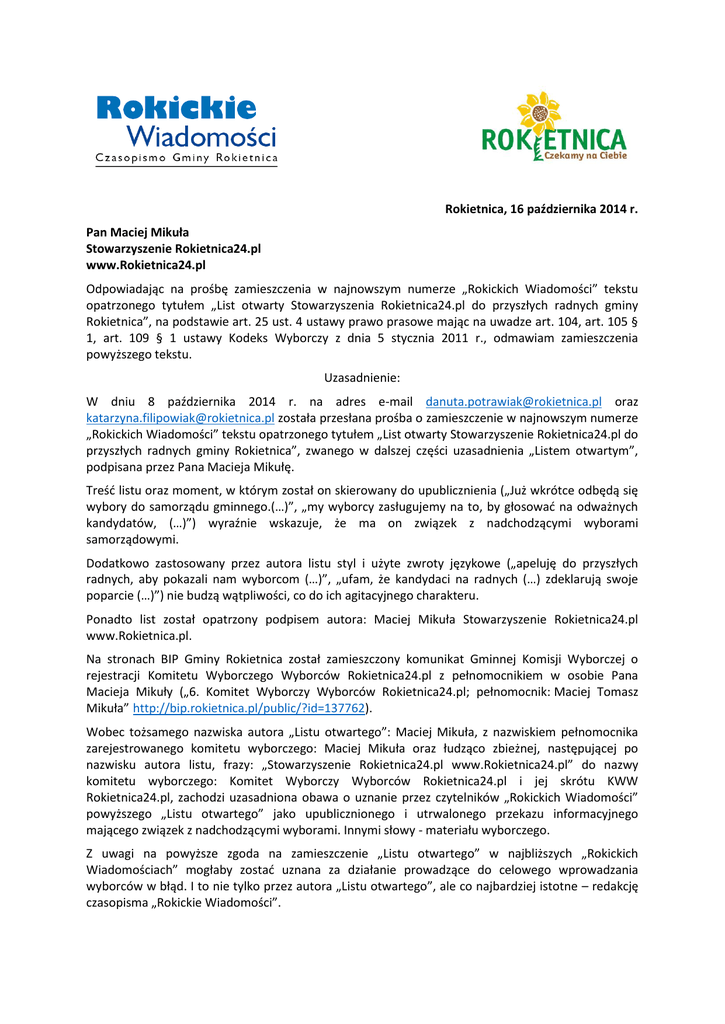 Rokietnica, 16 października 2014 r. Pan Maciej Mikuła Stowarzyszenie Rokietnica24.pl www.Rokietnica24.pl Odpowiadając na prośbę zamieszczenia w najnowszym numerze „Rokickich Wiadomości” tekstu opatrzonego tytułem „List otwarty Stowarzyszenia Rokietnica24.pl do przyszłych radnych gminy Rokietnica”, na podstawie art. 25 ust. 4 ustawy prawo prasowe mając na uwadze art. 104, art. 105 § 1, art. 109 § 1 ustawy Kodeks Wyborczy z dnia 5 stycznia 2011 r., odmawiam zamieszczenia powyższego tekstu. Uzasadnienie: W dniu 8 października 2014 r. na adres e-mail [email protected] oraz [email protected] została przesłana prośba o zamieszczenie w najnowszym numerze „Rokickich Wiadomości” tekstu opatrzonego tytułem „List otwarty Stowarzyszenie Rokietnica24.pl do przyszłych radnych gminy Rokietnica”, zwanego w dalszej części uzasadnienia „Listem otwartym”, podpisana przez Pana Macieja Mikułę. Treść listu oraz moment, w którym został on skierowany do upublicznienia („Już wkrótce odbędą się wybory do samorządu gminnego.(…)”, „my wyborcy zasługujemy na to, by głosować na odważnych kandydatów, (…)”) wyraźnie wskazuje, że ma on związek z nadchodzącymi wyborami samorządowymi. Dodatkowo zastosowany przez autora listu styl i użyte zwroty językowe („apeluję do przyszłych radnych, aby pokazali nam wyborcom (…)”, „ufam, że kandydaci na radnych (…) zdeklarują swoje poparcie (…)”) nie budzą wątpliwości, co do ich agitacyjnego charakteru. Ponadto list został opatrzony podpisem autora: Maciej Mikuła Stowarzyszenie Rokietnica24.pl www.Rokietnica.pl. Na stronach BIP Gminy Rokietnica został zamieszczony komunikat Gminnej Komisji Wyborczej o rejestracji Komitetu Wyborczego Wyborców Rokietnica24.pl z pełnomocnikiem w osobie Pana Macieja Mikuły („6. Komitet Wyborczy Wyborców Rokietnica24.pl; pełnomocnik: Maciej Tomasz Mikuła” http://bip.rokietnica.pl/public/?id=137762). Wobec tożsamego nazwiska autora „Listu otwartego”: Maciej Mikuła, z nazwiskiem pełnomocnika zarejestrowanego komitetu wyborczego: Maciej Mikuła oraz łudząco zbieżnej, następującej po nazwisku autora listu, frazy: „Stowarzyszenie Rokietnica24.pl www.Rokietnica24.pl” do nazwy komitetu wyborczego: Komitet Wyborczy Wyborców Rokietnica24.pl i jej skrótu KWW Rokietnica24.pl, zachodzi uzasadniona obawa o uznanie przez czytelników „Rokickich Wiadomości” powyższego „Listu otwartego” jako upublicznionego i utrwalonego przekazu informacyjnego mającego związek z nadchodzącymi wyborami. Innymi słowy - materiału wyborczego. Z uwagi na powyższe zgoda na zamieszczenie „Listu otwartego” w najbliższych „Rokickich Wiadomościach” mogłaby zostać uznana za działanie prowadzące do celowego wprowadzania wyborców w błąd. I to nie tylko przez autora „Listu otwartego”, ale co najbardziej istotne – redakcję czasopisma „Rokickie Wiadomości”. Mając na uwadze troskę o działanie w granicach określonych przepisami prawa oraz z zasadami współżycia społecznego i związany z tym fakt, że to redaktor naczelny odpowiada za treść przygotowywanych przez redakcję materiałów prasowych, a także wskazując na otwartą możliwość zwrócenia się z przedstawionym apelem do radnych już wyłonionych w akcie wyborczym (np. podczas ogólnodostępnych posiedzeń komisji tematycznych czy obrad sesji Rady Gminy), zmuszona jestem odmówić publikacji „Listu otwartego” w czasopiśmie „Rokickie Wiadomości”. Danuta Potrawiak Redaktor naczelny „Rokickich Wiadomości”