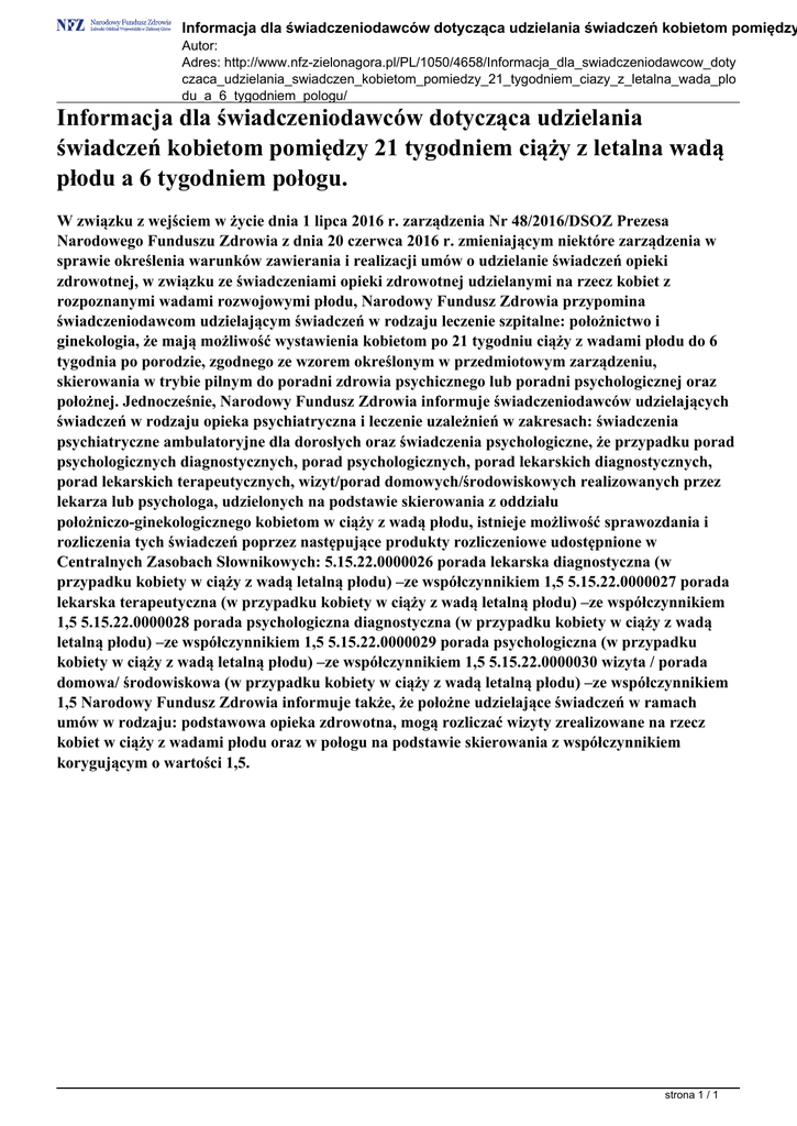 Informacja dla świadczeniodawców dotycząca udzielania świadczeń kobietom pomiędzy Autor: Adres: http://www.nfz-zielonagora.pl/PL/1050/4658/Informacja_dla_swiadczeniodawcow_doty czaca_udzielania_swiadczen_kobietom_pomiedzy_21_tygodniem_ciazy_z_letalna_wada_plo du_a_6_tygodniem_pologu/ Informacja dla świadczeniodawców dotycząca udzielania świadczeń kobietom pomiędzy 21 tygodniem ciąży z letalna wadą płodu a 6 tygodniem połogu. W związku z wejściem w życie dnia 1 lipca 2016 r. zarządzenia Nr 48/2016/DSOZ Prezesa Narodowego Funduszu Zdrowia z dnia 20 czerwca 2016 r. zmieniającym niektóre zarządzenia w sprawie określenia warunków zawierania i realizacji umów o udzielanie świadczeń opieki zdrowotnej, w związku ze świadczeniami opieki zdrowotnej udzielanymi na rzecz kobiet z rozpoznanymi wadami rozwojowymi płodu, Narodowy Fundusz Zdrowia przypomina świadczeniodawcom udzielającym świadczeń w rodzaju leczenie szpitalne: położnictwo i ginekologia, że mają możliwość wystawienia kobietom po 21 tygodniu ciąży z wadami płodu do 6 tygodnia po porodzie, zgodnego ze wzorem określonym w przedmiotowym zarządzeniu, skierowania w trybie pilnym do poradni zdrowia psychicznego lub poradni psychologicznej oraz położnej. Jednocześnie, Narodowy Fundusz Zdrowia informuje świadczeniodawców udzielających świadczeń w rodzaju opieka psychiatryczna i leczenie uzależnień w zakresach: świadczenia psychiatryczne ambulatoryjne dla dorosłych oraz świadczenia psychologiczne, że przypadku porad psychologicznych diagnostycznych, porad psychologicznych, porad lekarskich diagnostycznych, porad lekarskich terapeutycznych, wizyt/porad domowych/środowiskowych realizowanych przez lekarza lub psychologa, udzielonych na podstawie skierowania z oddziału położniczo-ginekologicznego kobietom w ciąży z wadą płodu, istnieje możliwość sprawozdania i rozliczenia tych świadczeń poprzez następujące produkty rozliczeniowe udostępnione w Centralnych Zasobach Słownikowych: 5.15.22.0000026 porada lekarska diagnostyczna (w przypadku kobiety w ciąży z wadą letalną płodu) –ze współczynnikiem 1,5 5.15.22.0000027 porada lekarska terapeutyczna (w przypadku kobiety w ciąży z wadą letalną płodu) –ze współczynnikiem 1,5 5.15.22.0000028 porada psychologiczna diagnostyczna (w przypadku kobiety w ciąży z wadą letalną płodu) –ze współczynnikiem 1,5 5.15.22.0000029 porada psychologiczna (w przypadku kobiety w ciąży z wadą letalną płodu) –ze współczynnikiem 1,5 5.15.22.0000030 wizyta / porada domowa/ środowiskowa (w przypadku kobiety w ciąży z wadą letalną płodu) –ze współczynnikiem 1,5 Narodowy Fundusz Zdrowia informuje także, że położne udzielające świadczeń w ramach umów w rodzaju: podstawowa opieka zdrowotna, mogą rozliczać wizyty zrealizowane na rzecz kobiet w ciąży z wadami płodu oraz w połogu na podstawie skierowania z współczynnikiem korygującym o wartości 1,5. strona 1 / 1 Powered by TCPDF (www.tcpdf.org)