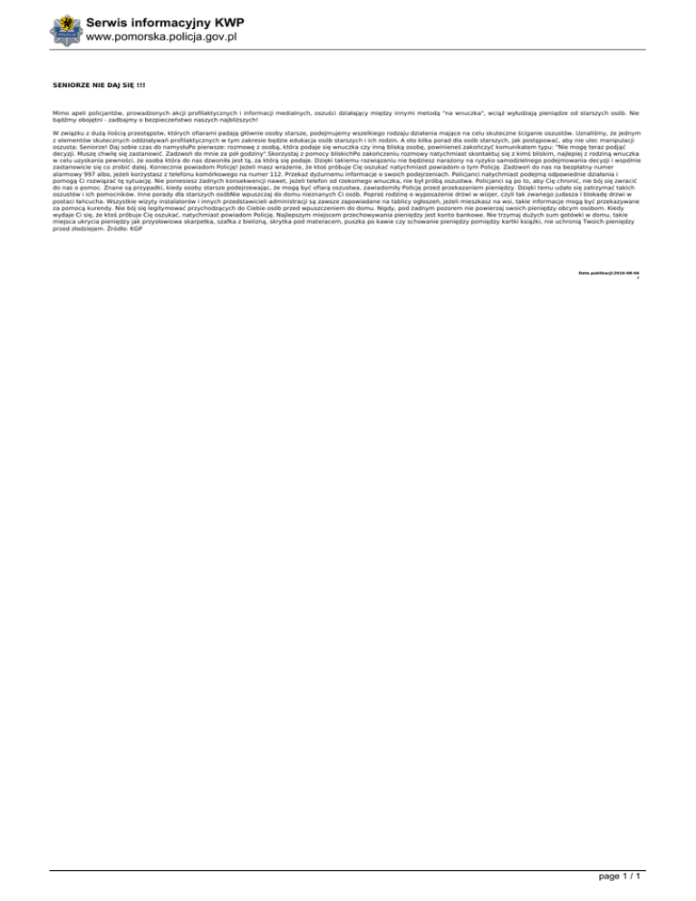 Serwis informacyjny KWP www.pomorska.policja.gov.pl SENIORZE NIE DAJ SIĘ !!! Mimo apeli policjantów, prowadzonych akcji profilaktycznych i informacji medialnych, oszuści działający między innymi metodą "na wnuczka", wciąż wyłudzają pieniądze od starszych osób. Nie bądźmy obojętni - zadbajmy o bezpieczeństwo naszych najbliższych! W związku z dużą ilością przestępstw, których ofiarami padają głównie osoby starsze, podejmujemy wszelkiego rodzaju działania mające na celu skuteczne ściganie oszustów. Uznaliśmy, że jednym z elementów skutecznych oddziaływań profilaktycznych w tym zakresie będzie edukacja osób starszych i ich rodzin. A oto kilka porad dla osób starszych, jak postępować, aby nie ulec manipulacji oszusta: Seniorze! Daj sobie czas do namysłuPo pierwsze: rozmowę z osobą, która podaje się wnuczka czy inną bliską osobę, powinieneś zakończyć komunikatem typu: "Nie mogę teraz podjąć decyzji. Muszę chwilę się zastanowić. Zadzwoń do mnie za pół godziny".Skorzystaj z pomocy bliskichPo zakończeniu rozmowy natychmiast skontaktuj się z kimś bliskim, najlepiej z rodziną wnuczka w celu uzyskania pewności, że osoba która do nas dzwoniła jest tą, za którą się podaje. Dzięki takiemu rozwiązaniu nie będziesz narażony na ryzyko samodzielnego podejmowania decyzji i wspólnie zastanowicie się co zrobić dalej. Koniecznie powiadom Policję! Jeżeli masz wrażenie, że ktoś próbuje Cię oszukać natychmiast powiadom o tym Policję. Zadzwoń do nas na bezpłatny numer alarmowy 997 albo, jeżeli korzystasz z telefonu komórkowego na numer 112. Przekaż dyżurnemu informacje o swoich podejrzeniach. Policjanci natychmiast podejmą odpowiednie działania i pomogą Ci rozwiązać tę sytuację. Nie poniesiesz żadnych konsekwencji nawet, jeżeli telefon od rzekomego wnuczka, nie był próbą oszustwa. Policjanci są po to, aby Cię chronić, nie bój się zwracić do nas o pomoc. Znane są przypadki, kiedy osoby starsze podejrzewając, że mogą być ofiarą oszustwa, zawiadomiły Policję przed przekazaniem pieniędzy. Dzięki temu udało się zatrzymać takich oszustów i ich pomocników. Inne porady dla starszych osóbNie wpuszczaj do domu nieznanych Ci osób. Poproś rodzinę o wyposażenie drzwi w wizjer, czyli tak zwanego judasza i blokadę drzwi w postaci łańcucha. Wszystkie wizyty instalatorów i innych przedstawicieli administracji są zawsze zapowiadane na tablicy ogłoszeń, jeżeli mieszkasz na wsi, takie informacje mogą być przekazywane za pomocą kurendy. Nie bój się legitymować przychodzących do Ciebie osób przed wpuszczeniem do domu. Nigdy, pod żadnym pozorem nie powierzaj swoich pieniędzy obcym osobom. Kiedy wydaje Ci się, że ktoś próbuje Cię oszukać, natychmiast powiadom Policję. Najlepszym miejscem przechowywania pieniędzy jest konto bankowe. Nie trzymaj dużych sum gotówki w domu, takie miejsca ukrycia pieniędzy jak przysłowiowa skarpetka, szafka z bielizną, skrytka pod materacem, puszka po kawie czy schowanie pieniędzy pomiędzy kartki książki, nie uchronią Twoich pieniędzy przed złodziejem. Źródło: KGP Data publikacji:2016-08-04 r page 1 / 1 Powered by TCPDF (www.tcpdf.org)