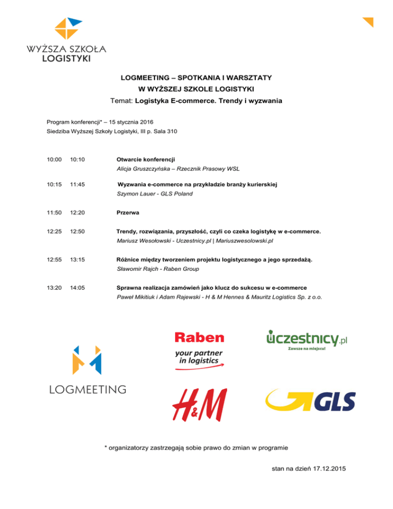 LOGMEETING – SPOTKANIA I WARSZTATY W WYŻSZEJ SZKOLE LOGISTYKI Temat: Logistyka E-commerce. Trendy i wyzwania Program konferencji* – 15 stycznia 2016 Siedziba Wyższej Szkoły Logistyki, III p. Sala 310 10:00 10:10 Otwarcie konferencji Alicja Gruszczyńska – Rzecznik Prasowy WSL 10:15 11:45 Wyzwania e-commerce na przykładzie branży kurierskiej Szymon Lauer - GLS Poland 11:50 12:20 Przerwa 12:25 12:50 Trendy, rozwiązania, przyszłość, czyli co czeka logistykę w e-commerce. Mariusz Wesołowski - Uczestnicy.pl | Mariuszwesolowski.pl 12:55 13:15 Różnice między tworzeniem projektu logistycznego a jego sprzedażą. Sławomir Rajch - Raben Group 13:20 14:05 Sprawna realizacja zamówień jako klucz do sukcesu w e-commerce Paweł Mikitiuk i Adam Rajewski - H & M Hennes & Mauritz Logistics Sp. z o.o. * organizatorzy zastrzegają sobie prawo do zmian w programie stan na dzień 17.12.2015
