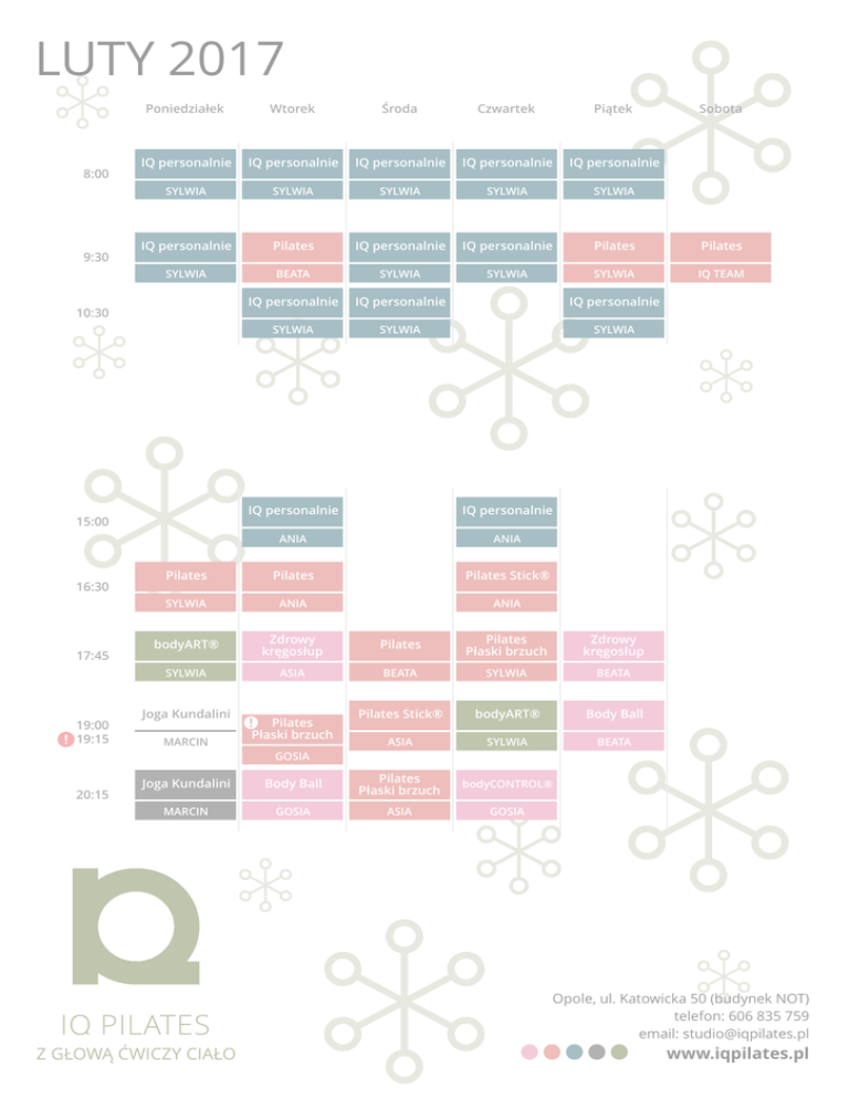 LUTY 2017 8:00 9:30 Poniedziałek Wtorek Środa Czwartek Piątek IQ personalnie IQ personalnie IQ personalnie IQ personalnie IQ personalnie SYLWIA SYLWIA SYLWIA SYLWIA SYLWIA IQ personalnie Pilates IQ personalnie IQ personalnie Pilates Pilates SYLWIA BEATA SYLWIA SYLWIA SYLWIA IQ TEAM IQ personalnie IQ personalnie IQ personalnie SYLWIA SYLWIA SYLWIA 10:30 IQ personalnie IQ personalnie ANIA ANIA Pilates Pilates Pilates Stick® SYLWIA ANIA ANIA bodyART® Zdrowy kręgosłup Pilates Pilates Płaski brzuch Zdrowy kręgosłup SYLWIA ASIA BEATA SYLWIA BEATA Pilates Stick® bodyART® Body Ball ASIA SYLWIA BEATA 15:00 16:30 17:45 19:00 19:15 Joga Kundalini MARCIN Pilates Płaski brzuch Sobota GOSIA 20:15 Joga Kundalini Body Ball Pilates Płaski brzuch bodyCONTROL® MARCIN GOSIA ASIA GOSIA Opole, ul. Katowicka 50 (budynek NOT) telefon: 606 835 759 email: [email protected] www.iqpilates.pl