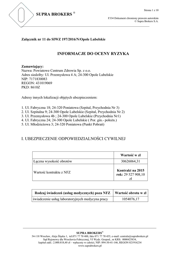 Strona 1 z 10 SUPRA BROKERS ® F334 Dokument chroniony prawem autorskim © Supra Brokers S.A. _____________________________________________________________________________ Załącznik nr 11 do SIWZ 197/2016/N/Opole Lubelskie INFORMACJE DO OCENY RYZYKA Zamawiający: Nazwa: Powiatowe Centrum Zdrowia Sp. z o.o. Adres siedziby: Ul. Przemysłowa 4 A; 24-300 Opole Lubelskie NIP: 7171830083 REGON: 431019069 PKD: 8610Z Adresy innych lokalizacji objętych ubezpieczeniem: 1. Ul. Fabryczna 18; 24-320 Poniatowa (Szpital, Przychodnia Nr 3) 2. Ul. Szpitalna 9; 24-300 Opole Lubelskie (Szpital, Przychodnia Nr 2) 3. Ul. Przemysłowa 4b ; 24-300 Opole Lubelskie (Przychodnia Nr1) 4. Ul. Fabryczna 24; 24-300 Opole Lubelskie ( Por. gin.- położn.) 5. Ul. Młodzieżowa 3; 24-320 Poniatowa (Punkt Pobrań) I. UBEZPIECZENIE ODPOWIEDZIALNOŚCI CYWILNEJ Wartość w zł Łączna wysokość obrotów 30626064,31 Wartość kontraktu z NFZ Kontrakt na 2015 rok: 29 527 908,10 zł Rodzaj świadczeń (usług medycznych) poza NFZ świadczenie usług laboratoryjnych medycyna pracy Wartość obrotu w zł 1054076,17 SUPRA BROKERS® 54-118 Wrocław, Aleja Śląska 1, tel.071 77 70 400, faks 071 77 70 455, e-mail: [email protected] Sąd Rejonowy dla Wrocławia-Fabrycznej, VI Wydz. Gospod., nr KRS: 0000425834, kapitał zakł.: 2.000.818,40 zł – wpłacony w całości, NIP: 894-30-41-146, REGON 021916234 www.suprabrokers.pl Strona 2 z 10 SUPRA BROKERS ® F334 Dokument chroniony prawem autorskim © Supra Brokers S.A. _____________________________________________________________________________ Liczba 292 120 113 135 Pracownicy ogółem Lekarze ogółem Lekarze „kontraktowi” Pielęgniarki ogółem Liczba przyjętych w ostatnim roku pacjentów 70 838 (ambulatoryjna opieka specjalistyczna, opieka psychiatryczna, izba przyjęć, nocna i świąteczna opieka lekarska, podstawowa opieka zdrowotna, rehabilitacja lecznicza: fizjoterapia ambulatoryjna, ośrodek dzienny) 7 181 (oddziały szpitalne, w tym także Oddział Medycyny Paliatywnej, Oddział Rehabilitacyjny i Zakład OpiekuńczoLeczniczy) Lecznictwo otwarte Lecznictwo zamknięte Oddział Chirurgiczny z Pododdziałem Ginekologii Operacyjnej Medycyny Paliatywnej Chorób Wewnętrznych z Pododdziałem Kardiologii Dziecięcy Otolaryngologii i Onkologii Laryngologicznej Rehabilitacyjny Ortopedii i Traumatologii Narządu Ruchu Liczba lekarzy kontraktowych Liczba łóżek 7 24 20 Zakład Opiekuńczo- Leczniczy 7 69 6 20 5 18 1 23 33 18 1 25 OCENA RYZYKA ZAKAŻEŃ SZPITALNYCH SUPRA BROKERS® 54-118 Wrocław, Aleja Śląska 1, tel.071 77 70 400, faks 071 77 70 455, e-mail: [email protected] Sąd Rejonowy dla Wrocławia-Fabrycznej, VI Wydz. Gospod., nr KRS: 0000425834, kapitał zakł.: 2.000.818,40 zł – wpłacony w całości, NIP: 894-30-41-146, REGON 021916234 www.suprabrokers.pl Strona 3 z 10 SUPRA BROKERS ® F334 Dokument chroniony prawem autorskim © Supra Brokers S.A. _____________________________________________________________________________ 1 2 3 4 5 6 7 8 9 10 11 12 13 14 W podmiocie leczniczym działa Zespół d/s. Zakażeń Szpitalnych W podmiocie leczniczym rejestrowane są zakażenia szpitalne wszystkie wybiórczo Liczba stwierdzanych rocznie zakażeń szpitalnych krwiopochodnych (wzw B, wzw C, hiv) gronkowca innych Podmiot leczniczy zgłasza do Sanepid zakażenia szpitalne/choroby zakaźne wszystkie krwiopochodne Podmiot leczniczy posiada centralną sterylizatornię W podmiocie leczniczym używane są sterylizatory narzędzi na suche, gorące powietrze Prowadzona jest wewnętrzna kontrola procesów sterylizacji Testy używane do kontroli procesów sterylizacji i pracy sterylizatorów: wskaźniki fizyczne wydruk komputerowy testy Bowie-Dicka testy paskowe testy zintegrowane testy biologiczne Używane są puszki Schimmelbuscha jako opakowania do sterylizacji Inne opakowania używane do sterylizacji puszki kontenerowe rękawy papierowo – foliowe inne Do mycia rąk używane jest mydło w: dozownikach kostkach Do dezynfekcji rąk używany jest środek dezynfekcyjny w dozownikach Cały personel poddawany jest szkoleniom z zakresu zapobiegania infekcjom szkolenie tylko przy przyjęciu do pracy systematycznie W podmiocie leczniczym opracowane są następujące procedury postępowania mycia i dezynfekcji rąk SUPRA BROKERS® 54-118 Wrocław, Aleja Śląska 1, tel.071 77 70 400, faks 071 77 70 455, e-mail: [email protected] Sąd Rejonowy dla Wrocławia-Fabrycznej, VI Wydz. Gospod., nr KRS: 0000425834, kapitał zakł.: 2.000.818,40 zł – wpłacony w całości, NIP: 894-30-41-146, REGON 021916234 www.suprabrokers.pl TAK NIE TAK TAK NIE 1 9 TAK TAK NIE TAK TAK TAK TAK TAK TAK TAK NIE NIE TAK TAK TAK NIE TAK TAK TAK TAK Strona 4 z 10 SUPRA BROKERS ® F334 Dokument chroniony prawem autorskim © Supra Brokers S.A. _____________________________________________________________________________ w czasie pobierania krwi 15 16 17 18 przy wykonywaniu iniekcji podczas dezynfekcji podczas sterylizacji ze sprzętem endoskopowym z zużytym sprzętem jednorazowym ze skażonym mat. biologicznym Przestrzeganie procedur jest systematycznie kontrolowane Możliwa jest izolacja pacjentów chorych zakaźnie Podmiot leczniczy posiada myjnię do endoskopów półautomatyczną automatyczną sterylizator Cały personel narażony na zakażenie wzw jest zaszczepiony przeciwko żółtaczce typu B (na podstawie dokumentacji w Zakł. Leczniczym) Zakres świadczonych usług medycznych Lecznictwo zamknięte Poradnie specjalistyczne Podstawowa Opieka Zdrowotna Zakład pielęgnacyjno – opiekuńczy Zakład opieki paliatywno – hospicyjnej Zakład rehabilitacji Diagnostyka specjalistyczna Zespoły wyjazdowe (2) Apteka szpitalna Transport chorych Zakres świadczonych usług pozamedycznych Wynajem pomieszczeń SUPRA BROKERS® 54-118 Wrocław, Aleja Śląska 1, tel.071 77 70 400, faks 071 77 70 455, e-mail: [email protected] Sąd Rejonowy dla Wrocławia-Fabrycznej, VI Wydz. Gospod., nr KRS: 0000425834, kapitał za