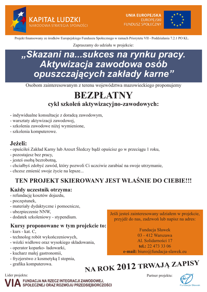 Projekt finansowany ze środków Europejskiego Funduszu Społecznego w ramach Priorytetu VII - Poddziałania 7.2.1 PO KL. Zapraszamy do udziału w projekcie: „Skazani na...sukces na rynku pracy. Aktywizacja zawodowa osób opuszczających zakłady karne” Osobom zainteresowanym z terenu województwa mazowieckiego proponujemy BEZPŁATNY cykl szkoleń aktywizacyjno-zawodowych: - indywidualne konsultacje z doradcą zawodowym, - warsztaty aktywizacji zawodowej, - szkolenia zawodowe niżej wymienione, - szkolenia komputerowe. Jeżeli: - opuściłeś Zakład Karny lub Areszt Śledczy bądź opuścisz go w przeciągu 1 roku, - pozostajesz bez pracy, - jesteś osobą bezrobotną, - chciałbyś zdobyć zawód, który pozwoli Ci uczciwie zarabiać na swoje utrzymanie, - chcesz zmienić swoje życie na lepsze... Ten projekt skierowany jest właśnie do CIEBIE!!! Każdy uczestnik otrzyma: - refundację kosztów dojazdu, - poczęstunek, - materiały dydaktyczne i pomocnicze, - ubezpieczenie NNW, - dodatek szkoleniowy - stypendium. Kursy proponowane w tym projekcie to: - kurs - kat. C, - technolog robót wykończeniowych, - wózki widłowe oraz wysokiego składowania, - operator koparko- ładowarki, - kucharz małej gastronomii, - fryzjerstwo z kosmetyką I stopnia, - grafika komputerowa. Lider projektu: Jeśli jesteś zainteresowany udziałem w projekcie, przyjdź do nas, zadzwoń lub napisz na adres: Fundacja Sławek 03 - 412 Warszawa Al. Solidarności 17 tel.: 22 473 33 06 e-mail: [email protected] Y ZAPIS Ą J A RW T 2 1 0 2 Na rok Partner projektu: