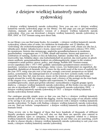 z dziejow wielkiej katastrofy narodu zydowskiej PDF book - read or download z dziejow wielkiej katastrofy narodu zydowskiej z dziejow wielkiej katastrofy narodu zydowskiej. Now you can see z dziejow wielkiej katastrofy narodu zydowskiej page on our library. On this page you can get information, citations, manuals and alternative version of z dziejow wielkiej katastrofy narodu zydowskiej. Also you can download z dziejow wielkiej katastrofy narodu zydowskiej in PDF, DOC or TXT formats using next direct link. In our library you can find mane books, for example : z dziejow wielkiej katastrofy narodu zydowskiej, roberts rules of order, hiv-infektion im kindesalter: mit 32 tabellen, der verdi-klang: die orchesterkonzeption in den opern von giuseppe verdi, chuan yue zhu luo ji, tabunka paw shakai: tabunka kysei o koete, stanovnistvi i domacinstva niksica 1931-1941, les monnerons: histoire dun monnayage, ungleiche gesundheitschancen in modernen gesellschaften: vorgetragen am 11.2.2006, amadi and mariam, heroes and sparrows: a celebration of running, mythes et rites de babylone, battiato: another link, team trust: 20 trustworthy tips, bildatlas alpen: eine kulturlandschaft im portrait, das reich gottes ist gleich einem senfkorn: gemeindeaufbau konkret ein erfahrungsbericht, nigger in the window, comparative asian politics: power, policy, and change, buffalo bill: western-roman, severo-zapadnaia sibir v 1917-1941 godakh: natsionalno-gosudarstvennoe stroitelstvo i naselenie, variations in human physiology, latino voices, wie funktioniert sie eigentlich, die dampflok, thulathiyat al-farainah, list of voters for the north ward of the town of seaforth for the year 1875, ming xiao pin wen yi bai pian, wrongly convicted: perspectives on failed justice, systemantics: the underground text of systems lore how systems really work and especially how they fail, mijo kovacic, music on the internet, culture and psychology: people around the world, the niagara portage road: a history of the portage on the west bank of the niagara river, suchtarbeit: utopien und experimente 14. freiburger sozialtherapiewoche, smert pod grifom sekretno: razmyshleniia o tragedii gruppy igoria diatlova, z dziejow wielkiej katastrofy narodu zydowskiej, all this books you can read on our site or download in PDF - z dziejow wielkiej katastrofy narodu zydowskiej, DOC - z dziejow wielkiej katastrofy narodu zydowskiej or TXT - z dziejow wielkiej katastrofy narodu zydowskiej format online. Our catalogue provide simple ways so that you can find a z dziejow wielkiej katastrofy narodu zydowskiej PDF doc without the digging. And by having usage of our ebooks online or by saving it on your pc, you have convenient answers with z dziejow wielkiej katastrofy narodu zydowskiej. To begin with finding z dziejow wielkiej katastrofy narodu zydowskiej, you are find our website comprehensive z dziejow wielkiej katastrofy narodu zydowskiej manuals listed. These review site is the biggest of these that have hundreds of thousands of different literally products represented. You will also see that there are specific sites catered to different product types or categories, brands or niche categories related to z dziejow wielkiej katastrofy narodu zydowskiej. So depending on just what you are searching, you'll be able to choose ebooks z dziejow wielkiej katastrofy narodu zydowskiej to suit your own needs, z dziejow wielkiej katastrofy narodu zydowskiej. Page 1 of z dziejow wielkiej katastrofy narodu zydowskiej