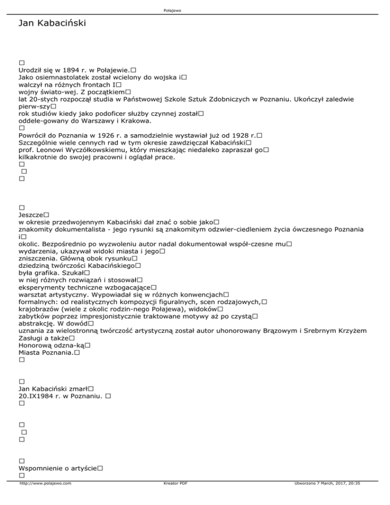 Połajewo Jan Kabaciński Urodził się w 1894 r. w Połajewie. Jako osiemnastolatek został wcielony do wojska i walczył na różnych frontach I wojny świato-wej. Z początkiem lat 20-stych rozpoczął studia w Państwowej Szkole Sztuk Zdobniczych w Poznaniu. Ukończył zaledwie pierw-szy rok studiów kiedy jako podoficer służby czynnej został oddele-gowany do Warszawy i Krakowa. Powrócił do Poznania w 1926 r. a samodzielnie wystawiał już od 1928 r. Szczególnie wiele cennych rad w tym okresie zawdzięczał Kabaciński prof. Leonowi Wyczółkowskiemu, który mieszkając niedaleko zapraszał go kilkakrotnie do swojej pracowni i oglądał prace. Jeszcze w okresie przedwojennym Kabaciński dał znać o sobie jako znakomity dokumentalista - jego rysunki są znakomitym odzwier-ciedleniem życia ówczesnego Poznania i okolic. Bezpośrednio po wyzwoleniu autor nadal dokumentował współ-czesne mu wydarzenia, ukazywał widoki miasta i jego zniszczenia. Główną obok rysunku dziedziną twórczości Kabacińskiego była grafika. Szukał w niej różnych rozwiązań i stosował eksperymenty techniczne wzbogacające warsztat artystyczny. Wypowiadał się w różnych konwencjach formalnych: od realistycznych kompozycji figuralnych, scen rodzajowych, krajobrazów (wiele z okolic rodzin-nego Połajewa), widoków zabytków poprzez impresjonistycznie traktowane motywy aż po czystą abstrakcję. W dowód uznania za wielostronną twórczość artystyczną został autor uhonorowany Brązowym i Srebrnym Krzyżem Zasługi a także Honorową odzna-ką Miasta Poznania. Jan Kabaciński zmarł 20.IX1984 r. w Poznaniu. Wspomnienie o artyście http://www.polajewo.com Kreator PDF Utworzono 7 March, 2017, 20:35 Połajewo Jana Kabacińskiego znałem od wielu lat. Nieraz spotykaliśmy się na różnych wernisażach. Do dziś pamiętam Jego suchoryty oglą-dane na jednej z pierwszych powojennych wystaw poznańskich artystów plastyków. Były tam wówczas również rysunki zniszczone-go w czasie działań wojennych Poznania. Kochał to miasto, jego architekturę i zieleń, Pasjonował się wszelkimi technikami graficznymi, w których też sam najczęściej się wypowiadał. Wielokrotnie dyskutowaliśmy o sztuce i życiu, bywałem też w Jego gościnnym domu. Podziwiałem wiele różnych form i przedmiotów wykonywanych przez niego samego, oglądałem rysunki i grafiki drukowane na własnoręcznie skonstruowanej prasie. Wśród tych rysunków (i akwarel) były także motywy z rodzinnych stron Janka z Połajewa. Gdy w ostatnich latach (niestety już po śmierci artysty) zdarzyło mi się kilka razy przejeżdżać przez tę dużą, piękną wieś, nieodparcie przypominały mi się pejzaże stamtąd a także inne prace artysty jak choćby akwarelowy portret matki czy wizerunek papie-ża, ostatnie dzieło Jana Kabacińskiego. Obraz ten umieszczony był na honorowym miejscu w mieszkaniu, zanim zgodnie z wolą zmarłego został przez córkę Marię przekazany do kościoła parafialnego w Połajewie gdzie zdobi jego wnętrze wraz z czterema innymi obrazami autora. Wydaje mi się, że nie można - szczególnie w przypadku Janka - oddzielić artysty od człowieka. Bo przecież właśnie za pośrednictwem sztuki artysta - człowiek rozmawia z drugim człowiekiem, przekazuje swój stosunek do świata, ojczyzny, rodziny. Kreśląc tych kilka myśli - wspomnień sądzę, że Jan Kabaciński nestor grafików poznańskich" (tak go nazywaliśmy przed pięciu laty) umarł młody duchem - choć dożył lat dziewięćdziesięciu, i że można o nim powiedzieć: Non omnis moriar". http://www.polajewo.com Kreator PDF Utworzono 7 March, 2017, 20:35 Połajewo Andrzej Kandziora Źródło: Jan Kabaciński 1894-1984", Biuro Wystaw Artystycznych Poznań Stary Rynek - Arsenał", Styczeń 1989. http://www.polajewo.com Kreator PDF Utworzono 7 March, 2017, 20:35