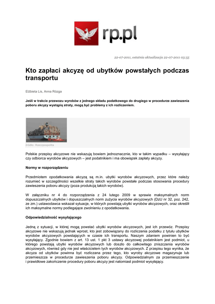 22-07-2011, ostatnia aktualizacja 22-07-2011 03:55 Kto zapłaci akcyzę od ubytków powstałych podczas transportu Elżbieta Lis, Anna Rózga Jeśli w trakcie przewozu wyrobów z jednego składu podatkowego do drugiego w procedurze zawieszenia poboru akcyzy wystąpią straty, mogą być problemy z ich rozliczeniem. źródło: Rzeczpospolita Polskie przepisy akcyzowe nie wskazują bowiem jednoznacznie, kto w takim wypadku – wysyłający czy odbiorca wyrobów akcyzowych – jest podatnikiem i ma obowiązek zapłaty akcyzy. Normy w rozporządzeniu Przedmiotem opodatkowania akcyzą są m.in. ubytki wyrobów akcyzowych, przez które należy rozumieć w szczególności wszelkie straty takich wyrobów powstałe podczas stosowania procedury zawieszenia poboru akcyzy (poza produkcją takich wyrobów). W załączniku nr 4 do rozporządzenia z 24 lutego 2009 w sprawie maksymalnych norm dopuszczalnych ubytków i dopuszczalnych norm zużycia wyrobów akcyzowych (DzU nr 32, poz. 242, ze zm.) ustawodawca wskazał sytuacje, w których powstają ubytki wyrobów akcyzowych, oraz określił ich maksymalne normy podlegające zwolnieniu z opodatkowania. Odpowiedzialność wysyłającego Jedną z sytuacji, w której mogą powstać ubytki wyrobów akcyzowych, jest ich przewóz. Przepisy akcyzowe nie wskazują jednak wprost, kto jest zobowiązany do rozliczenia podatku z tytułu ubytków wyrobów akcyzowych powstających w czasie ich transportu. Naszym zdaniem powinien to być wysyłający. Zgodnie bowiem z art. 13 ust. 1 pkt 3 ustawy akcyzowej podatnikiem jest podmiot, u którego powstają ubytki wyrobów akcyzowych lub doszło do całkowitego zniszczenia wyrobów akcyzowych, również gdy nie jest właścicielem tych wyrobów akcyzowych. Z przepisu tego wynika, że akcyza od ubytków powinna być rozliczana przez tego, kto wyroby akcyzowe magazynuje lub przemieszcza w procedurze zawieszenia poboru akcyzy. Odpowiedzialnym za przemieszczenie i prawidłowe zakończenie procedury poboru akcyzy jest natomiast podmiot wysyłający. Kiedy obowiązek wygasa... W myśl art. 41 ust. 5 pkt 1 ustawy o akcyzie przy przemieszczaniu wyrobów akcyzowych z zastosowaniem procedury zawieszenia poboru akcyzy wygasa powstały w wyniku dokonania określonej czynności podlegającej opodatkowaniu obowiązek podatkowy ciążący na podatniku, z chwilą otrzymania przez niego m.in. dokumentu potwierdzającego odbiór wyrobów akcyzowych – w części objętej tym potwierdzeniem. To oznacza, że obowiązek podatkowy wygasa w momencie otrzymania przez wysyłającego potwierdzenia odbioru wyrobów akcyzowych (np. komunikat nr 818 w systemie EMCS). Obowiązek podatkowy wysyłającego wygaśnie jednak wyłącznie w stosunku do ilości wyrobów akcyzowych, których odbiór został potwierdzony w raporcie o odbiorze. W części nieobjętej potwierdzeniem zastosowanie znajdzie art. 42 ust. 1 pkt 6 ustawy akcyzowej, zgodnie z którym zakończenie procedury zawieszenia poboru akcyzy następuje w przypadku ubytków wyrobów akcyzowych lub całkowitego zniszczenia wyrobów akcyzowych, o których mowa w art. 2 ust. 1 pkt 20 tej ustawy – z dniem powstania ubytków wyrobów akcyzowych lub ich całkowitego zniszczenia, a gdy nie można ustalić tego dnia – z dniem stwierdzenia przez uprawniony organ ubytków wyrobów akcyzowych lub ich całkowitego zniszczenia. ...a kiedy nadal ciąży W przypadku ubytków dochodzi zatem do zakończenia procedury zawieszenia akcyzy, ale bez wygaśnięcia obowiązku podatkowego, który nadal ciąży na wysyłającym. Jest on bowiem zobowiązany do rozliczenia procedury zawieszenia poboru akcyzy. Przy czym nie jest istotne dla oceny prawnej takiej sytuacji, kto organizować będzie transport wyrobów akcyzowych pomiędzy składami podatkowymi. Oznacza to, że podmiotem zobowiązanym do rozliczenia akcyzy z tytułu ubytków wyrobów akcyzowych powstałych podczas ich przewozu jest wysyłający. Potwierdza to interpretacja Izby Skarbowej w Warszawie z 10 sierpnia 2010 (IPPP3/443-446/10-2/ JK): „Z uwagi na fakt, iż procedura zawieszenia kończy się dla składu podatkowego wysyłającego wyroby w procedurze zawieszenia poboru akcyzy z chwilą otrzymania dokumentu ADT, odpowiedzialnym za ewentualnie powstałe ubytki będzie wysyłający skład podatkowy". Identyczne stanowisko ta sama izba zajęła też w interpretacji z 13 sierpnia 2009 (IPPP3/443-413/09-2/JK). Należy dodać, że opodatkowanie ubytków powstałych podczas transportu wyrobów akcyzowych przez odbierającego prowadziłoby w praktyce do ryzyka podwójnego opodatkowania powstałych strat – raz przez wysyłającego i ponownie przez odbierającego. Taka sytuacja byłaby niezgodna z zasadą jednofazowości podatku akcyzowego. Elżbieta Lis jest doktorem nauk prawnych, doradcą podatkowym w kancelarii KSP Legal & Tax Advice stowarzyszonej z kancelarią Salans Anna Rózga jest doradcą podatkowym