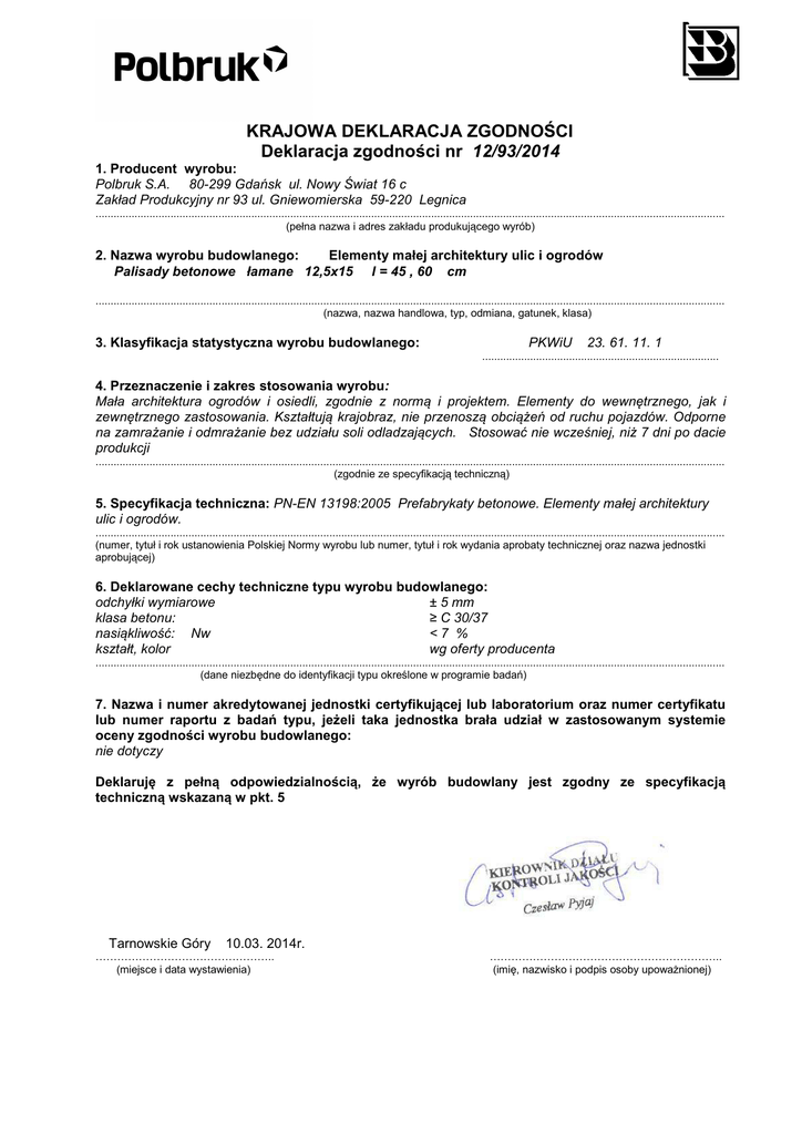 KRAJOWA DEKLARACJA ZGODNOŚCI Deklaracja zgodności nr 12/93/2014 1. Producent wyrobu: Polbruk S.A. 80-299 Gdańsk ul. Nowy Świat 16 c Zakład Produkcyjny nr 93 ul. Gniewomierska 59-220 Legnica .................................................................................................................................................................................................................. (pełna nazwa i adres zakładu produkującego wyrób) 2. Nazwa wyrobu budowlanego: Elementy małej architektury ulic i ogrodów Palisady betonowe łamane 12,5x15 l = 45 , 60 cm .................................................................................................................................................................................................................. (nazwa, nazwa handlowa, typ, odmiana, gatunek, klasa) 3. Klasyfikacja statystyczna wyrobu budowlanego: PKWiU 23. 61. 11. 1 ............................................................................... 4. Przeznaczenie i zakres stosowania wyrobu: Mała architektura ogrodów i osiedli, zgodnie z normą i projektem. Elementy do wewnętrznego, jak i zewnętrznego zastosowania. Kształtują krajobraz, nie przenoszą obciążeń od ruchu pojazdów. Odporne na zamrażanie i odmrażanie bez udziału soli odladzających. Stosować nie wcześniej, niż 7 dni po dacie produkcji .................................................................................................................................................................................................................. (zgodnie ze specyfikacją techniczną) 5. Specyfikacja techniczna: PN-EN 13198:2005 Prefabrykaty betonowe. Elementy małej architektury ulic i ogrodów. .................................................................................................................................................................................................................. (numer, tytuł i rok ustanowienia Polskiej Normy wyrobu lub numer, tytuł i rok wydania aprobaty technicznej oraz nazwa jednostki aprobującej) 6. Deklarowane cechy techniczne typu wyrobu budowlanego: odchyłki wymiarowe ± 5 mm klasa betonu: ≥ C 30/37 nasiąkliwość: Nw <7 % kształt, kolor wg oferty producenta .................................................................................................................................................................................................................. (dane niezbędne do identyfikacji typu określone w programie badań) 7. Nazwa i numer akredytowanej jednostki certyfikującej lub laboratorium oraz numer certyfikatu lub numer raportu z badań typu, jeżeli taka jednostka brała udział w zastosowanym systemie oceny zgodności wyrobu budowlanego: nie dotyczy Deklaruję z pełną odpowiedzialnością, że wyrób budowlany jest zgodny ze specyfikacją techniczną wskazaną w pkt. 5 Tarnowskie Góry 10.03. 2014r. ………………………………………….. (miejsce i data wystawienia) ……………………………………………………….. (imię, nazwisko i podpis osoby upoważnionej)