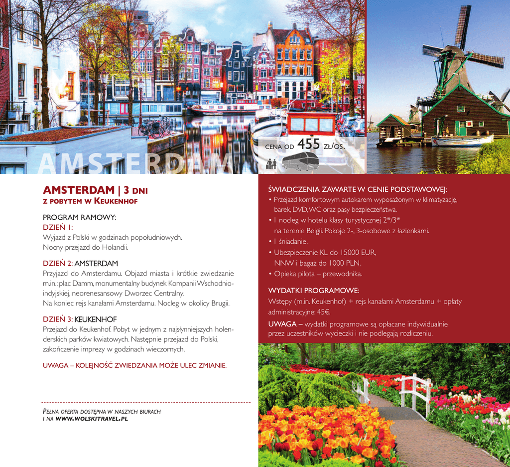 CENA OD AMSTERDAM | 3 DNI Z POBYTEM W KEUKENHOF PROGRAM RAMOWY: DZIEŃ 1: Wyjazd z Polski w godzinach popołudniowych. Nocny przejazd do Holandii. DZIEŃ 2: AMSTERDAM Przyjazd do Amsterdamu. Objazd miasta i krótkie zwiedzanie m.in.: plac Damm, monumentalny budynek Kompanii Wschodnioindyjskiej, neorenesansowy Dworzec Centralny. Na koniec rejs kanałami Amsterdamu. Nocleg w okolicy Brugii. DZIEŃ 3: KEUKENHOF Przejazd do Keukenhof. Pobyt w jednym z najsłynniejszych holenderskich parków kwiatowych. Następnie przejazd do Polski, zakończenie imprezy w godzinach wieczornych. UWAGA – KOLEJNOŚĆ ZWIEDZANIA MOŻE ULEC ZMIANIE. PEŁNA OFERTA DOSTĘPNA W NASZYCH BIURACH I NA WWW.WOLSKITRAVEL.PL 455 ZŁ/OS . ŚWIADCZENIA ZAWARTE W CENIE PODSTAWOWEJ: • Przejazd komfortowym autokarem wyposażonym w klimatyzację, barek, DVD, WC oraz pasy bezpieczeństwa. • 1 nocleg w hotelu klasy turystycznej 2*/3* na terenie Belgii. Pokoje 2-, 3-osobowe z łazienkami. • 1 śniadanie. • Ubezpieczenie KL do 15000 EUR, NNW i bagaż do 1000 PLN. • Opieka pilota – przewodnika. WYDATKI PROGRAMOWE: Wstępy (m.in. Keukenhof) + rejs kanałami Amsterdamu + opłaty administracyjne: 45€. UWAGA – wydatki programowe są opłacane indywidualnie przez uczestników wycieczki i nie podlegają rozliczeniu.