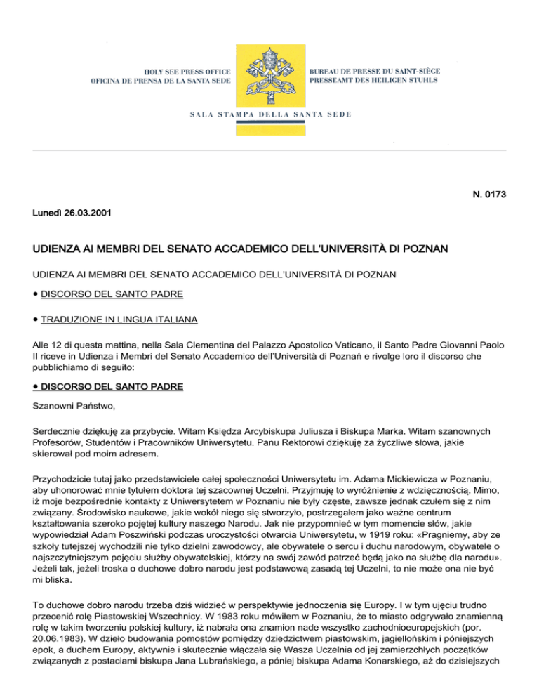 N. 0173 Lunedì 26.03.2001 UDIENZA AI MEMBRI DEL SENATO ACCADEMICO DELL’UNIVERSITÀ DI POZNAN UDIENZA AI MEMBRI DEL SENATO ACCADEMICO DELL’UNIVERSITÀ DI POZNAN ● DISCORSO DEL SANTO PADRE ● TRADUZIONE IN LINGUA ITALIANA Alle 12 di questa mattina, nella Sala Clementina del Palazzo Apostolico Vaticano, il Santo Padre Giovanni Paolo II riceve in Udienza i Membri del Senato Accademico dell’Università di Poznań e rivolge loro il discorso che pubblichiamo di seguito: ● DISCORSO DEL SANTO PADRE Szanowni Państwo, Serdecznie dziękuję za przybycie. Witam Księdza Arcybiskupa Juliusza i Biskupa Marka. Witam szanownych Profesorów, Studentów i Pracowników Uniwersytetu. Panu Rektorowi dziękuję za życzliwe słowa, jakie skierował pod moim adresem. Przychodzicie tutaj jako przedstawiciele całej społeczności Uniwersytetu im. Adama Mickiewicza w Poznaniu, aby uhonorować mnie tytułem doktora tej szacownej Uczelni. Przyjmuję to wyróżnienie z wdzięcznością. Mimo, iż moje bezpośrednie kontakty z Uniwersytetem w Poznaniu nie były częste, zawsze jednak czułem się z nim związany. Środowisko naukowe, jakie wokół niego się stworzyło, postrzegałem jako ważne centrum kształtowania szeroko pojętej kultury naszego Narodu. Jak nie przypomnieć w tym momencie słów, jakie wypowiedział Adam Poszwiński podczas uroczystości otwarcia Uniwersytetu, w 1919 roku: «Pragniemy, aby ze szkoły tutejszej wychodzili nie tylko dzielni zawodowcy, ale obywatele o sercu i duchu narodowym, obywatele o najszczytniejszym pojęciu służby obywatelskiej, którzy na swój zawód patrzeć będą jako na służbę dla narodu». Jeżeli tak, jeżeli troska o duchowe dobro narodu jest podstawową zasadą tej Uczelni, to nie może ona nie być mi bliska. To duchowe dobro narodu trzeba dziś widzieć w perspektywie jednoczenia się Europy. I w tym ujęciu trudno przecenić rolę Piastowskiej Wszechnicy. W 1983 roku mówiłem w Poznaniu, że to miasto odgrywało znamienną rolę w takim tworzeniu polskiej kultury, iż nabrała ona znamion nade wszystko zachodnioeuropejskich (por. 20.06.1983). W dzieło budowania pomostów pomiędzy dziedzictwem piastowskim, jagiellońskim i póniejszych epok, a duchem Europy, aktywnie i skutecznie włączała się Wasza Uczelnia od jej zamierzchłych początków związanych z postaciami biskupa Jana Lubrańskiego, a póniej biskupa Adama Konarskiego, aż do dzisiejszych 2 czasów. Ufam, że Uniwersytet Poznański również w przyszłości będzie miejscem spotkania pomiędzy utwierdzoną w swojej tożsamości kulturą polską i szanującą ponadczasowe wartości kulturą europejską. I jeszcze jedna myśl. Nie chciałbym, aby wymowa tego doktoratu honoris causa ograniczała się jedynie do mojej osoby. Przyjmuję go, jako znak twórczego współistnienia nauki i religii oraz owocnego współdziałania środowisk naukowych i kościelnych. Wydaje się, iż jest to znak tym bardziej wymowny, że nadanie tego tytułu postulowały wszystkie wydziały Uniwersytetu. Cieszę się, że od niedawna jest pośród nich również Wydział Teologiczny. Niech ta obecność odsłania coraz bardziej duchowy, otwarty na nieskończoność kształt nauki, a równocześnie pomoże odkrywać solidne, naukowe fundamenty wiary. Raz jeszcze dziękuję za życzliwość. Bardzo proszę, aby przekazali Państwo moje serdeczne pozdrowienia Profesorom, Studentom i Pracownikom Uniwersytetu, którzy nie mogli tu przybyć. Wszystkich noszę w moim sercu i wspominam w modlitwie. Proszę Boga, aby obficie błogosławił Państwu i całej wspólnocie Uniwersytetu im. Adama Mickiewicza w Poznaniu. [00484-09.01] [Testo originale: Polacco] ● TRADUZIONE IN LINGUA ITALIANA Illustri Signori e Signore, Vi ringrazio di cuore per essere venuti. Saluto l’Arcivescovo Juliusz e il Vescovo Marek. Do il mio benvenuto agli illustri Professori, agli Studenti e al personale non docente dell’Università. Ringrazio il Signor Rettore per le benevole parole rivoltemi. Siete venuti qui come rappresentanti dell’intera comunità dell’Università "Adam Mickiewicz" di Poznań, per onorarmi con il titolo di dottore della vostra benemerita Università. Accetto con gratitudine tale privilegio. Benché i miei contatti diretti con l’Università di Poznań non siano stati frequenti, sempre mi sentivo unito ad essa. Ritenevo infatti l’ambiente scientifico creatosi intorno ad essa un importante centro di formazione della cultura della nostra Nazione, intesa ampiamente. Come non ricordare in questo istante le parole pronunciate da Adam Poszwiński, durante la cerimonia di apertura dell’Università, nel 1919: "Il nostro desiderio è che da questa scuola escano non soltanto dei bravi professionisti, ma dei cittadini di cuore e di spirito nazionale, cittadini con altissimo senso del servizio civico, che intendano la propria professione come servizio alla nazione"! Se è così, se la sollecitudine per il bene spirituale della nazione è il principio fondamentale di questa Alma Mater, essa non può non essere a me cara. Oggi questo bene spirituale della nazione, va visto nella prospettiva dell’unificazione dell’Europa. E anche in un’impostazione di questo genere è difficile sopravalutare il ruolo dell’Ateneo dei Piast. Nel 1983 dissi a Poznań, che questa città aveva avuto un ruolo significativo nella formazione della cultura polacca in modo da farle acquisire i contrassegni caratteristici soprattutto dell’occidente europeo (cfr. 20.06.1983). La vostra Università, sin dai suoi lontani albori unita alla figura del vescovo Jan Lubrański, e più tardi a quella del vescovo Adam Konarski, fino ai giorni nostri si è inserita attivamente ed efficacemente nell’opera di costruzione di ponti tra il patrimonio della dinastia dei Piast, di quella degli Jagelloni e delle epoche successive, e lo spirito dell’Europa. Spero che anche nel futuro l’Università di Poznań continui ad essere luogo d’incontro tra la 