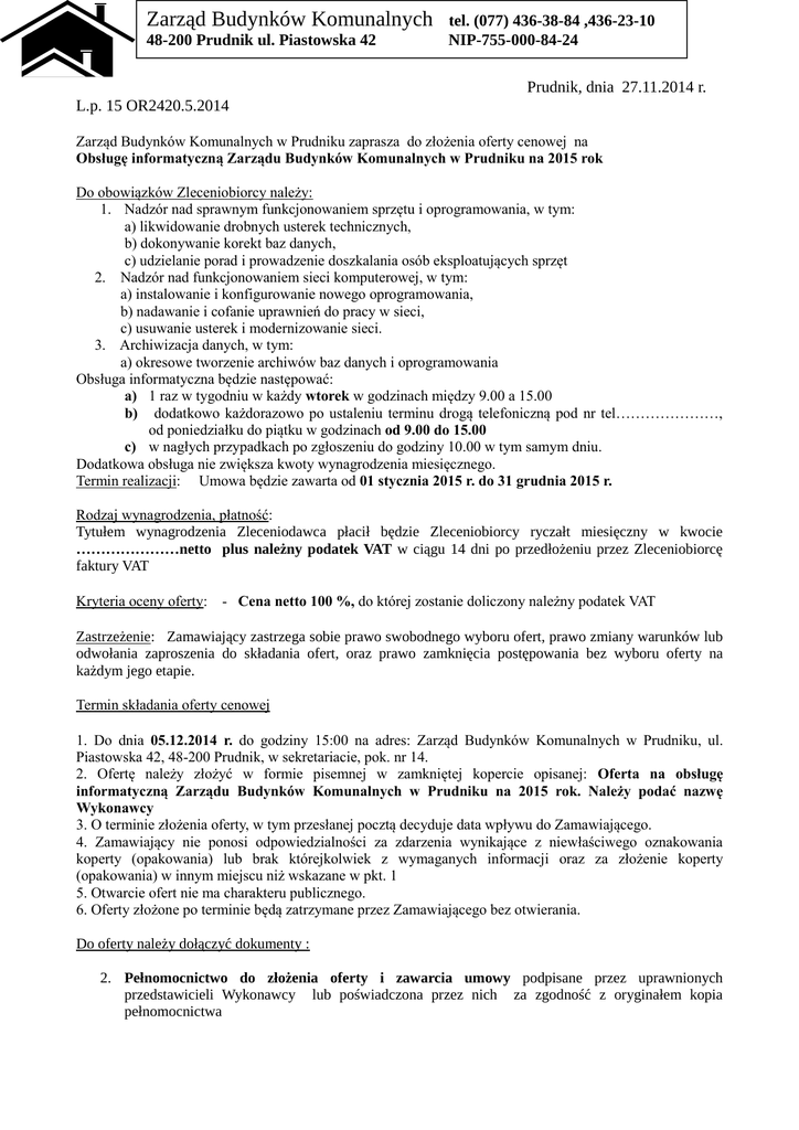 Zarząd Budynków Komunalnych 48-200 Prudnik ul. Piastowska 42 tel. (077) 436-38-84 ,436-23-10 NIP-755-000-84-24 Prudnik, dnia 27.11.2014 r. L.p. 15 OR2420.5.2014 Zarząd Budynków Komunalnych w Prudniku zaprasza do złożenia oferty cenowej na Obsługę informatyczną Zarządu Budynków Komunalnych w Prudniku na 2015 rok Do obowiązków Zleceniobiorcy należy: 1. Nadzór nad sprawnym funkcjonowaniem sprzętu i oprogramowania, w tym: a) likwidowanie drobnych usterek technicznych, b) dokonywanie korekt baz danych, c) udzielanie porad i prowadzenie doszkalania osób eksploatujących sprzęt 2. Nadzór nad funkcjonowaniem sieci komputerowej, w tym: a) instalowanie i konfigurowanie nowego oprogramowania, b) nadawanie i cofanie uprawnień do pracy w sieci, c) usuwanie usterek i modernizowanie sieci. 3. Archiwizacja danych, w tym: a) okresowe tworzenie archiwów baz danych i oprogramowania Obsługa informatyczna będzie następować: a) 1 raz w tygodniu w każdy wtorek w godzinach między 9.00 a 15.00 b) dodatkowo każdorazowo po ustaleniu terminu drogą telefoniczną pod nr tel…………………, od poniedziałku do piątku w godzinach od 9.00 do 15.00 c) w nagłych przypadkach po zgłoszeniu do godziny 10.00 w tym samym dniu. Dodatkowa obsługa nie zwiększa kwoty wynagrodzenia miesięcznego. Termin realizacji: Umowa będzie zawarta od 01 stycznia 2015 r. do 31 grudnia 2015 r. Rodzaj wynagrodzenia, płatność: Tytułem wynagrodzenia Zleceniodawca płacił będzie Zleceniobiorcy ryczałt miesięczny w kwocie …………………netto plus należny podatek VAT w ciągu 14 dni po przedłożeniu przez Zleceniobiorcę faktury VAT Kryteria oceny oferty: - Cena netto 100 %, do której zostanie doliczony należny podatek VAT Zastrzeżenie: Zamawiający zastrzega sobie prawo swobodnego wyboru ofert, prawo zmiany warunków lub odwołania zaproszenia do składania ofert, oraz prawo zamknięcia postępowania bez wyboru oferty na każdym jego etapie. Termin składania oferty cenowej 1. Do dnia 05.12.2014 r. do godziny 15:00 na adres: Zarząd Budynków Komunalnych w Prudniku, ul. Piastowska 42, 48-200 Prudnik, w sekretariacie, pok. nr 14. 2. Ofertę należy złożyć w formie pisemnej w zamkniętej kopercie opisanej: Oferta na obsługę informatyczną Zarządu Budynków Komunalnych w Prudniku na 2015 rok. Należy podać nazwę Wykonawcy 3. O terminie złożenia oferty, w tym przesłanej pocztą decyduje data wpływu do Zamawiającego. 4. Zamawiający nie ponosi odpowiedzialności za zdarzenia wynikające z niewłaściwego oznakowania koperty (opakowania) lub brak którejkolwiek z wymaganych informacji oraz za złożenie koperty (opakowania) w innym miejscu niż wskazane w pkt. 1 5. Otwarcie ofert nie ma charakteru publicznego. 6. Oferty złożone po terminie będą zatrzymane przez Zamawiającego bez otwierania. Do oferty należy dołączyć dokumenty : 2. Pełnomocnictwo do złożenia oferty i zawarcia umowy podpisane przez uprawnionych przedstawicieli Wykonawcy lub poświadczona przez nich za zgodność z oryginałem kopia pełnomocnictwa Zamawiający zawiadomi Wykonawców, którzy złożyli oferty, o złożonych ofertach i wyborze najkorzystniejszej oferty, umieszczając informację na stronie www.zbkprudnik.pl oraz na tablicy ogłoszeń w siedzibie ZBK w terminie 30 dni po upływie terminu złożenia ofert. W tym okresie Wykonawcy pozostają związani ofertą. Jeżeli Wykonawca, którego oferta została wybrana, uchyli się od zawarcia umowy, Zamawiający może wybrać ofertę najkorzystniejszą spośród pozostałych ofert. Osoba do kontaktu: W zakresie przedmiotu zamówienia Pani Anna Wyrzykowska tel. 77 436 38 84 wew. 31 Do niniejszego postępowania nie ma zastosowania ustawa prawo zamówień publicznych. ….................................................... Kierownik Zamawiającego mgr inż. Zdzisław Pikuła OFERTA CENOWA Ja/My, niżej podpisany/ni działając w imieniu i na rzecz : (pełna nazwa Wykonawca'cy) (adres siedziby Wykonawcy) ……………………………………………………………………………………………………………………… ……………………………………………………………………………………………………………………… REGON.............................................nr NIP………………………………………………………. nr konta bankowego:................................................................................................................... nr tel........................................................nr faksu...................................................................... e-mail........................................................................................................................................ w odpowiedzi na zaproszenie do złożenia oferty cenowej na Obsługę informatyczną Zarządu Budynków Komunalnych w Prudniku na 2015 rok oferujemy wykonanie usługi za: 1. Cena netto miesięcznego wynagrodzenia wynosi………………………………..zł podatek VAT....................%.........................zł wartość brutto...............................................zł 2. Usługa będzie wykonywana w okresie od dnia 01.01.2015 roku do 31 grudnia 2015 roku. ……………………………………………. podpis