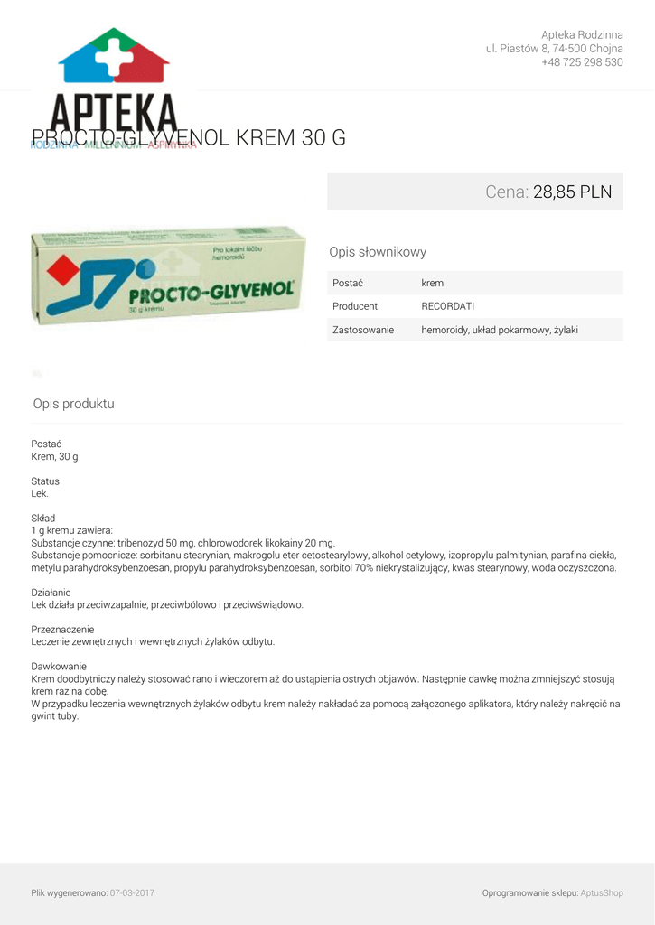 Apteka Rodzinna ul. Piastów 8, 74-500 Chojna +48 725 298 530 PROCTO-GLYVENOL KREM 30 G Cena: 28,85 PLN Opis słownikowy Postać krem Producent RECORDATI Zastosowanie hemoroidy, układ pokarmowy, żylaki Opis produktu Postać Krem, 30 g Status Lek. Skład 1 g kremu zawiera: Substancje czynne: tribenozyd 50 mg, chlorowodorek likokainy 20 mg. Substancje pomocnicze: sorbitanu stearynian, makrogolu eter cetostearylowy, alkohol cetylowy, izopropylu palmitynian, parafina ciekła, metylu parahydroksybenzoesan, propylu parahydroksybenzoesan, sorbitol 70% niekrystalizujący, kwas stearynowy, woda oczyszczona. Działanie Lek działa przeciwzapalnie, przeciwbólowo i przeciwświądowo. Przeznaczenie Leczenie zewnętrznych i wewnętrznych żylaków odbytu. Dawkowanie Krem doodbytniczy należy stosować rano i wieczorem aż do ustąpienia ostrych objawów. Następnie dawkę można zmniejszyć stosują krem raz na dobę. W przypadku leczenia wewnętrznych żylaków odbytu krem należy nakładać za pomocą załączonego aplikatora, który należy nakręcić na gwint tuby. Plik wygenerowano: 07-03-2017 Powered by TCPDF (www.tcpdf.org) Oprogramowanie sklepu: AptusShop
