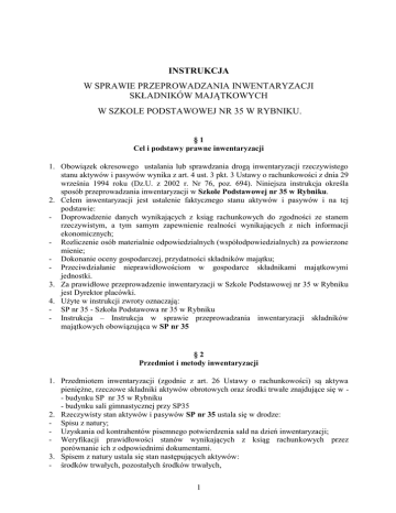 INSTRUKCJA W SPRAWIE PRZEPROWADZANIA INWENTARYZACJI SKŁADNIKÓW MAJĄTKOWYCH W SZKOLE PODSTAWOWEJ NR 35 W RYBNIKU. §1 Cel i podstawy prawne inwentaryzacji 1. Obowiązek okresowego ustalania lub sprawdzania drogą inwentaryzacji rzeczywistego stanu aktywów i pasywów wynika z art. 4 ust. 3 pkt. 3 Ustawy o rachunkowości z dnia 29 września 1994 roku (Dz.U. z 2002 r. Nr 76, poz. 694). Niniejsza instrukcja określa sposób przeprowadzania inwentaryzacji w Szkole Podstawowej nr 35 w Rybniku. 2. Celem inwentaryzacji jest ustalenie faktycznego stanu aktywów i pasywów i na tej podstawie: - Doprowadzenie danych wynikających z ksiąg rachunkowych do zgodności ze stanem rzeczywistym, a tym samym zapewnienie realności wynikających z nich informacji ekonomicznych; - Rozliczenie osób materialnie odpowiedzialnych (współodpowiedzialnych) za powierzone mienie; - Dokonanie oceny gospodarczej, przydatności składników majątku; - Przeciwdziałanie nieprawidłowościom w gospodarce składnikami majątkowymi jednostki. 3. Za prawidłowe przeprowadzenie inwentaryzacji w Szkole Podstawowej nr 35 w Rybniku jest Dyrektor placówki. 4. Użyte w instrukcji zwroty oznaczają: - SP nr 35 - Szkoła Podstawowa nr 35 w Rybniku - Instrukcja – Instrukcja w sprawie przeprowadzania inwentaryzacji składników majątkowych obowiązująca w SP nr 35 §2 Przedmiot i metody inwentaryzacji 1. Przedmiotem inwentaryzacji (zgodnie z art. 26 Ustawy o rachunkowości) są aktywa pieniężne, rzeczowe składniki aktywów obrotowych oraz środki trwałe znajdujące się w - budynku SP nr 35 w Rybniku - budynku sali gimnastycznej przy SP35 2. Rzeczywisty stan aktywów i pasywów SP nr 35 ustala się w drodze: - Spisu z natury; - Uzyskania od kontrahentów pisemnego potwierdzenia sald na dzień inwentaryzacji; - Weryfikacji prawidłowości stanów wynikających z ksiąg rachunkowych przez porównanie ich z odpowiednimi dokumentami. 3. Spisem z natury ustala się stan następujących aktywów: - środków trwałych, pozostałych środków trwałych, 1 materiałów, półfabrykatów, produktów gotowych i towarów, księgozbiorów bibliotecznych, środków pieniężnych i innych środków pieniężnych w kasie. W drodze uzyskania od kontrahentów pisemnego potwierdzenia sald ustala się stan następujących aktywów i pasywów: - środków pieniężnych na rachunkach bankowych, pożyczek, - pozostałych rozrachunków z odbiorcami i dostawcami. 5. Inwentaryzacją w drodze weryfikacji stanu ewidencyjnego obejmuje się: - wartości niematerialne i prawne, - księgozbiory biblioteczne – na koniec każdego roku w latach nie objętych spisem z natury, - rozrachunków z ZUS, Urzędem Skarbowym, - inne składniki, jeżeli przeprowadzenie spisu z natury lub uzgodnienie salda z przyczyn uzasadnionych nie było możliwe. 4. §3 Rodzaje i terminy inwentaryzacji 1. Ustala się następujące rodzaje inwentaryzacji: - Pełna inwentaryzacja okresowa – polegająca na ustaleniu stanu rzeczywistego na dzień inwentaryzacji wszystkich składników aktywów i pasywów; - Wyrywkowa inwentaryzacja okresowa – polegająca na ustaleniu stanu rzeczywistego części składników aktywów i pasywów objętych spisem. 2. Oprócz sytuacji wymienionych w punkcie 1 inwentaryzację składników majątkowych przeprowadza się w następujących przypadkach: - na dzień zmiany osoby materialnie odpowiedzialnej, - na dzień dokonania zmian organizacyjnych, - na dzień, w którym wystąpiły wypadki losowe lub inne przyczyny, w wyniku których nastąpiło naruszenie stanu składników majątkowych (np. pożar, włamanie). 3. Inwentaryzację, o której mowa w niniejszej instrukcji, sporządza się w następujących terminach: a)w drodze spisu z natury: na ostatni dzień roku obrotowego: - środki pieniężne w kasie i na rachunkach bankowych - zobowiązania z tytułu dostaw i usług - zobowiązania publicznoprawne - należności z tytułu dostaw i usług - należności publicznoprawne ostatni kwartał roku obrotowego do 15 pierwszego m-ca roku następnego co 4 lata - środki trwałe znajdujące się na terenie strzeżonym - wartości niematerialne i prawne raz w roku w dowolnym momencie w trakcie roku: - zapas towarów i materiałów objętych ewidencją wartościową raz w ciągu dwóch lat: - materiały ,towary, produkty gotowe i półprodukty znajdujące się na terenie strzeżonym i objęte ewidencją ilościowo- wartościową. b)w drodze uzgodnienia sald z kontrahentami – na 30.11. każdego roku kalendarzowego c) w drodze weryfikacji stanu ewidencyjnego – na koniec roku obrotowego 2 §4 Zadania poszczególnych osób w przygotowaniu i przeprowadzeniu inwentaryzacji 1.Kierownik jednostki – zgodnie z art. 4 ust.5 UOR, ponosi pełną odpowiedzialność za przeprowadzenie inwentaryzacji drogą spisu z natury. Do jego zadań należy przede wszystkim podejmowanie ostatecznych decyzji w sprawach związanych z inwentaryzacją, m.in.: - zarządza o przeprowadzeniu i terminach inwentaryzacji - powołuje Przewodniczącego Komisji Inwentaryzacyjnej ( stosownie do załącznika nr 1) - podejmuje decyzje o zatwierdzeniu wyników i rozliczeniu inwentaryzacji lub też o jej unieważnieniu, w tym także protokołu Komisji Inwentaryzacyjnej 2. Główny księgowy- jest przede wszystkim odpowiedzialny za rozliczenie inwentaryzacji i wprowadzenie wyników do ksiąg rachunkowych jednostki. Do jego zadań należy m.in.: - zaproponowanie kierownikowi jednostki kandydata na Przewodniczącego Komisji Inwentaryzacyjnej - uzgodnienie stanów ilościowych wykazanych w księgowości oraz w polach spisowych, a także wartości składników - porównanie stanów wynikających z inwentaryzacji ze stanami wynikającymi z ewidencji księgowej - rozliczenie różnic inwentaryzacyjnych w księgach rachunkowych jednostki zgodnie z zatwierdzonym przez kierownika jednostki protokołem . 3.Przewodniczący Komisji Inwentaryzacyjnej – ponosi odpowiedzialność przed kierownikiem jednostk