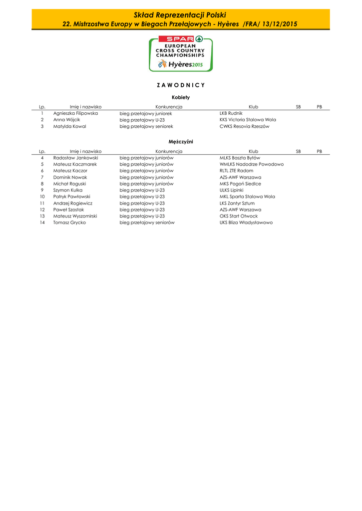 Skład Reprezentacji Polski 22. Mistrzostwa Europy w Biegach Przełajowych - Hyères /FRA/ 13/12/2015 ZAWODNICY Kobiety Lp. 1 2 3 Imię i nazwisko Agnieszka Filipowska Anna Wójcik Matylda Kowal Konkurencja bieg przełajowy juniorek bieg przełajowy U-23 bieg przełajowy seniorek Klub LKB Rudnik KKS Victoria Stalowa Wola CWKS Resovia Rzeszów SB PB Klub MLKS Baszta Bytów WMLKS Nadodrze Powodowo RLTL ZTE Radom AZS-AWF Warszawa MKS Pogoń Siedlce ULKS Lipinki MKL Sparta Stalowa Wola LKS Zantyr Sztum AZS-AWF Warszawa OKS Start Otwock UKS Bliza Władysławowo SB PB Mężczyźni Lp. 4 5 6 7 8 9 10 11 12 13 14 Imię i nazwisko Radosław Jankowski Mateusz Kaczmarek Mateusz Kaczor Dominik Nowak Michał Roguski Szymon Kulka Patryk Pawłowski Andrzej Rogiewicz Paweł Szostak Mateusz Wyszomirski Tomasz Grycko Konkurencja bieg przełajowy juniorów bieg przełajowy juniorów bieg przełajowy juniorów bieg przełajowy juniorów bieg przełajowy juniorów bieg przełajowy U-23 bieg przełajowy U-23 bieg przełajowy U-23 bieg przełajowy U-23 bieg przełajowy U-23 bieg przełajowy seniorów