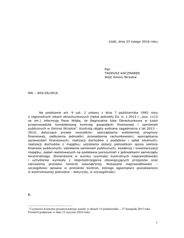 Łódź, dnia 23 lutego 2016 roku Pan TADEUSZ KACZMAREK Wójt Gminy Strzelce WK – 602/26/2016 Na podstawie art. 9 ust. 2 ustawy z dnia 7 października 1992 roku o regionalnych izbach obrachunkowych (tekst jednolity Dz. U. z 2012 r., poz. 1113 ze zm.) informuję Pana Wójta, że Regionalna Izba Obrachunkowa w Łodzi przeprowadziła kompleksową kontrolę gospodarki finansowej i zamówień publicznych w Gminie Strzelce1. Kontrolą objęto wybrane zagadnienia z lat 2013 – 2015, dotyczące przede wszystkim: sporządzania wieloletniej prognozy finansowej; zadłużenia jednostki; prowadzenia rachunkowości; sporządzania sprawozdań finansowych; realizacji dochodów z podatków i opłat lokalnych; realizacji dochodów z majątku; udzielania dotacji jednostkom spoza sektora finansów publicznych; udzielania zamówień publicznych; ewidencji i inwentaryzacji majątku; zadań realizowanych na podstawie porozumień z jednostkami samorządu terytorialnego. Stwierdzone w wyniku czynności kontrolnych nieprawidłowości i uchybienia wynikały z nieprzestrzegania obowiązujących przepisów oraz naruszenia procedur kontroli wewnętrznej. Wykazane nieprawidłowości – szczegółowo opisane w protokole kontroli, którego egzemplarz pozostawiono w kontrolowanej jednostce - dotyczyły, w szczególności: I. 1 Czynności kontrolne przeprowadzone zostały w dniach 15 października – 27 listopada 2015 roku. Protokół podpisano w dniu 15 stycznia 2016 roku. 1 W zakresie ewidencji księgowej i sprawozdawczości 1. W sprawozdaniu zbiorczym Rb-27S - z wykonania planu dochodów budżetowych jednostki samorządu terytorialnego, za okres od początku roku do dnia 31 grudnia 2014 roku, wykazane dochody odpowiadały kwocie wynikającej z ewidencji księgowej konta 901 – dochody budżetu, w wysokości 10.817.435,07 zł powiększonej o kwotę wynikającą z ewidencji księgowej konta 138 – rachunek środków europejskich, w wysokości 267.392,22 zł. W związku z powyższym należy wskazać, że konto 138 rachunek środków europejskich, przewidziane zostało w załączniku nr 3 do rozporządzenia Ministra Finansów z dnia 5 lipca 2010 roku w sprawie szczególnych zasad rachunkowości oraz planów kont dla budżetu państwa, budżetów jednostek samorządu terytorialnego, jednostek budżetowych, samorządowych zakładów budżetowych, państwowych funduszy celowych oraz państwowych jednostek budżetowych mających siedzibę poza granicami Rzeczypospolitej Polskiej (tekst jednolity Dz. U. z 2013 roku, poz. 289) plan kont dla jednostek budżetowych i samorządowych zakładów budżetowych, natomiast jego prowadzenia nie przewiduje załącznik nr 2 do wskazanego rozporządzenia, czyli plan kont dla budżetów jednostek samorządu terytorialnego. Zgodnie z przepisami ww. rozporządzenia - na stronie Ma konta 901 ujmuje się, m.in., dochody budżetu pochodzące ze źródeł zagranicznych niepodlegające zwrotowi, w korespondencji z kontem 133 oraz pochodzące z budżetu Unii Europejskiej, w korespondencji z kontem 133. 2. Nieprawidłowo zaksięgowano wpływ subwencji oświatowej na styczeń 2014 roku, jako dochód otrzymany i wykonany w roku 2014, oraz błędnie nie wykazano wpływu subwencji oświatowej na styczeń 2015 roku w dochodach otrzymanych i wykonanych w 2014 roku. Powyższe naruszało przepis § 9 ust. 1 i ust. 2 rozporządzenia Ministra Finansów z dnia 16 stycznia 2014 roku w sprawie sprawozdawczości budżetowej (Dz. U. z 2014 r., poz. 119 ze zm.) oraz § 3 ust. 4 pkt 3 Instrukcji sporządzania sprawozdań budżetowych w zakresie budżetów jednostek samorządu terytorialnego, stanowiącej załącznik nr 39 do ww. rozporządzenia, zgodnie z którym - w kolumnie "Dochody otrzymane" wykazuje się kwoty subwencji ogólnej i dotacji celowych, które wpłynęły na rachunek bankowy jednostek samorządu terytorialnego w okresie sprawozdawczym. 3. Operacje związane z wypłatą diet ewidencjonowano na kontach: Wn 405 Ma 130-1, co było sprzeczne z zasadami określonymi w przepisach rozporządzenia Ministra Finansów w sprawie szczególnych zasad rachunkowości oraz planów kont dla budżetu państwa, budżetów jednostek samorządu terytorialnego, jednostek budżetowych, samorządowych zakładów budżetowych, państwowych funduszy celowych oraz państwowych jednostek budżetowych mających siedzibę poza granicami Rzeczypospolitej Polskiej, zgodnie z którymi - powyższa operacja powinna być odnotowana na koncie 240 – pozostałe rozrachunki. 2 4. W sprawozdaniu Rb-28S za 2014 rok nie zostały wykazane zobowiązania wynikające z dodatkowego wynagrodzenia rocznego za 2014 rok. Zgodnie z art. 6 ust. 1 ustawy z dnia 29 września 1994 roku o rachunkowości (tekst jednolity Dz. U. z 2013 r., poz. 330 ze zm.) - w księgach rachunkowych jednostki budżetowej należy ująć wszystkie osiągnięte, przypadające na jej rzecz przychody i obciążające ją koszty związane z tymi przychodami dotyczące danego roku obrotowego, niezależnie od terminu ich zapłaty. Wobec czego, należne pracownikom dodatkowe wynagrodzenie roczne, w kwocie brutto obciąża ciężar kosztów działalności operacyjnej jednostki – wykazuje się je w sprawozdaniu za rok obrotowy, w którym pracownicy nabyli prawo do tego wynagrodzenia. Bez znaczenia jest fakt, że jest ono naliczane i wypłacane w roku następnym (dotyczy to także naliczonych od tych wynagrodzeń składek na ubezpieczenia społeczne w części finansowanej przez pracodawcę). 5. W bilansie organu (z wykonania budżetu), sporządzonym na dzień 31 grudnia 2014 roku na podstawie ewidencji księgowej (zestawienia obrotów i sald kont budżetu) za rok 2014, w pozycji pozostałe środki pieniężne wykazano środki na rachunku wydatków niewygasających. Kwota ta powinna zostać ujęta w pozycji środki pieniężne budżetu, zgodnie z zasadą, iż w pozycji środki pieniężne budżetu należy ujmować te środki, których dysponentem pozostaje Gmina (organ). Zgodnie