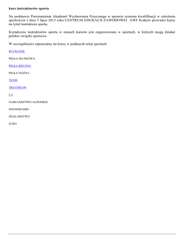 kurs instruktorów sportu Na podstawie Porozumienia Akademii Wychowania Fizycznego w sprawie systemu kwalifikacji w szkoleniu sportowym z dnia 5 lipca 2013 roku CENTRUM EDUKACJI ZAWODOWEJ AWF Kraków prowadzi kursy na tytuł instruktora sportu. Kształcenie instruktorów sportu w ramach kursów jest organizowane w sportach, w których mogą działać polskie związki sportowe. W szczególności zapraszamy na kursy w podanych niżej sportach: PŁYWANIE PIŁKA SIATKOWA PIŁKA RĘCZNA PIŁKA NOŻNA TENIS TRIATHLON LA NARCIARSTWO ALPEJSKIE SNOWBOARD ŻEGLARSTWO JUDO Informacje ogólne 1. kurs obejmuje 180 godzin zajęć programowych – program kursu jest realizowany przez kadrę trenerską i zawiera 60 godzin zajęć w zakresie podstaw teoretycznych, 90 godzin dyscypliny kierunkowej oraz 30 godzin praktyki instruktorskiej w klubie sportowym 2. wymogi wstępne dla kandydatów na kurs: pełnoletniość, wykształcenie średnie, złożenie kompletu wymaganych dokumentów, w skład którego wchodzą: • Druk zgłoszenia typu A (druk dostępny w zakładce „druki”) • kopia dokumentu potwierdzającego wykształcenie minimum średnie (potwierdzona za zgodność z oryginałem) • kopia dowodu osobistego (potwierdzona za zgodność z oryginałem) • oświadczenie o niekaralności (druk dostępny w zakładce „druki”) • zaświadczenie lekarskie o braku przeciwwskazań do udziału w kursie (może to być także kopia aktualnych badań okresowych potwierdzona za zgodność z oryginałem) • 2 fotografie (format 3,5 x 4,5 cm) • w przypadku uczestnictwa tylko w części specjalistycznej dodatkowo kopia dokumentu potwierdzającego posiadanie zaliczonej części ogólnej kursu • potwierdzenie opłaty za kurs (najpóźniej 14 dni przed planowanym terminem rozpoczęcia kursu) 3. instruktor sportu Akademii Wychowania Fizycznego jest przygotowany do prowadzenia samodzielnej działalności szkoleniowo – treningowej w sporcie szkolnym oraz do działalności pomocniczej pod nadzorem trenera sportu w pozostałych obszarach sportu wyczynowego 4. wzór legitymacji instruktora (Porozumienie Akademii Wychowania Fizycznego w sprawie systemu kwalifikacji w szkoleniu sportowym z dnia 5 lipca 2013 roku ) część ogólna kursu instruktora sportu CEL: głównym celem tej części kursu jest teoretyczne przygotowanie kandydatów do prowadzenia zajęć w charakterze instruktorów sportu UCZESTNICY: wszyscy uczestnicy kursów instruktora sportu WARUNKI REKRUTACJI: złożenie druku zgłoszenia typu A oraz wszystkich niezbędnych dokumentów do Centrum Edukacji Zawodowej. TRYB KURSU: sesje sobotnio - niedzielne CZAS TRWANIA: 3-4 sesje LICZBA GODZIN: 60 godz. WYBRANE TREŚCI PROGRAMOWE: Zespoły dydaktyczne Biologiczny Psychospołeczny PPP Organizacyjno wdrożeniowy Ogółem Lp. Przedmioty 1. 2. 3. 4. 5. 6. 7. 8. Anatomia Fizjologia i biochemia człowieka Biomechanika Pedagogika Psychologia Socjologia Pierwsza pomoc Podstawowe zagadnienia z organizacji, zarządzania, marketingu i prawa w sporcie. Teoria sportu Teoria treningu sportowego Fizjologia wysiłku Cz. teoretyczna instruktor sportu AWF 9. 10. 11. Budżet godzin 13 12 3 Egzamin/ zaliczenie Z Z Z/O Z Z/O Z Z Z 32 Z E Z/O 60 FORMA ZALICZENIA: egzamin TERMIN ZAJĘĆ: ustalony po zgłoszeniu się min 30 osób DOKUMENT KOŃCOWY: zaświadczenie o ukończeniu części ogólnej kursu instruktorów sportu