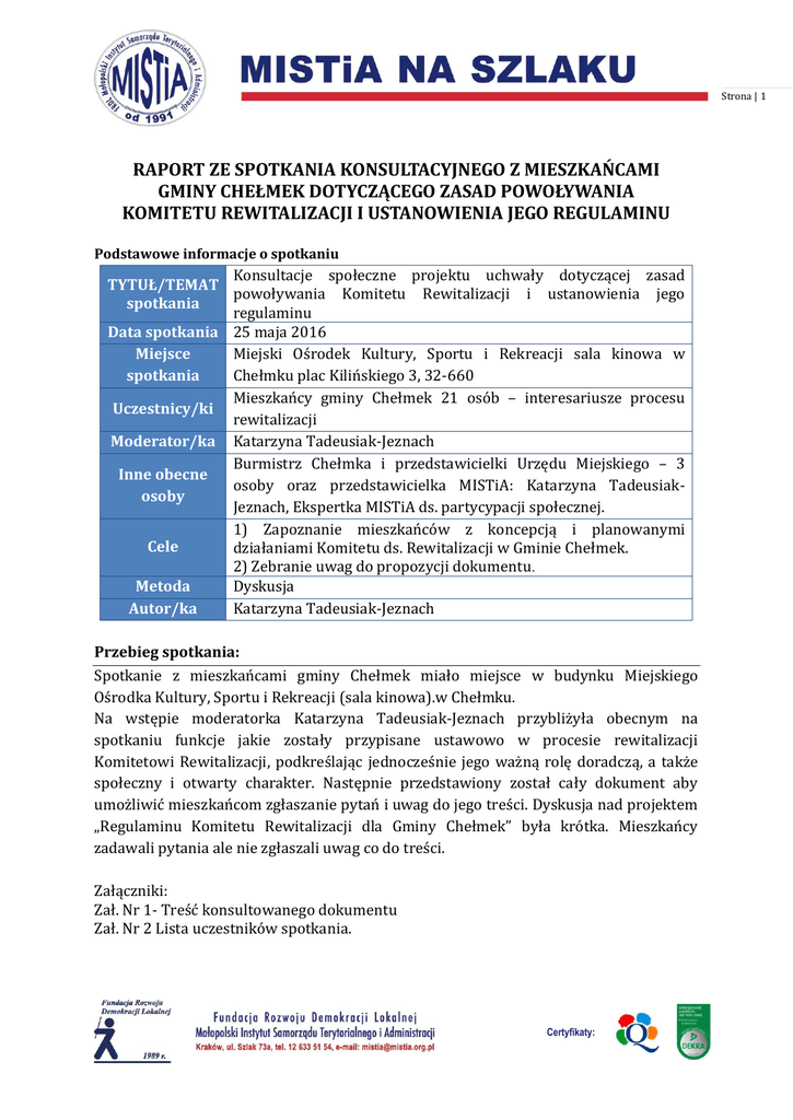 Strona | 1 RAPORT ZE SPOTKANIA KONSULTACYJNEGO Z MIESZKAŃCAMI GMINY CHEŁMEK DOTYCZĄCEGO ZASAD POWOŁYWANIA KOMITETU REWITALIZACJI I USTANOWIENIA JEGO REGULAMINU Podstawowe informacje o spotkaniu Konsultacje społeczne projektu uchwały dotyczącej zasad TYTUŁ/TEMAT powoływania Komitetu Rewitalizacji i ustanowienia jego spotkania regulaminu Data spotkania 25 maja 2016 Miejsce Miejski Ośrodek Kultury, Sportu i Rekreacji sala kinowa w spotkania Chełmku plac Kilińskiego 3, 32-660 Mieszkańcy gminy Chełmek 21 osób – interesariusze procesu Uczestnicy/ki rewitalizacji Moderator/ka Katarzyna Tadeusiak-Jeznach Burmistrz Chełmka i przedstawicielki Urzędu Miejskiego – 3 Inne obecne osoby oraz przedstawicielka MISTiA: Katarzyna Tadeusiakosoby Jeznach, Ekspertka MISTiA ds. partycypacji społecznej. 1) Zapoznanie mieszkańców z koncepcją i planowanymi Cele działaniami Komitetu ds. Rewitalizacji w Gminie Chełmek. 2) Zebranie uwag do propozycji dokumentu. Metoda Dyskusja Autor/ka Katarzyna Tadeusiak-Jeznach Przebieg spotkania: Spotkanie z mieszkańcami gminy Chełmek miało miejsce w budynku Miejskiego Ośrodka Kultury, Sportu i Rekreacji (sala kinowa).w Chełmku. Na wstępie moderatorka Katarzyna Tadeusiak-Jeznach przybliżyła obecnym na spotkaniu funkcje jakie zostały przypisane ustawowo w procesie rewitalizacji Komitetowi Rewitalizacji, podkreślając jednocześnie jego ważną rolę doradczą, a także społeczny i otwarty charakter. Następnie przedstawiony został cały dokument aby umożliwić mieszkańcom zgłaszanie pytań i uwag do jego treści. Dyskusja nad projektem „Regulaminu Komitetu Rewitalizacji dla Gminy Chełmek” była krótka. Mieszkańcy zadawali pytania ale nie zgłaszali uwag co do treści. Załączniki: Zał. Nr 1- Treść konsultowanego dokumentu Zał. Nr 2 Lista uczestników spotkania. Certyfikaty: