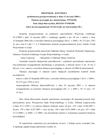 PROTOKÓŁ KONTROLI problemowej przeprowadzonej w dniu 13 stycznia 2009 r. Tłumacz przysięgły jęz. niemieckiego, TP/526/06, Pani Alicja Barczyńska, REGON 471502389. Adres do korespondencji: 93-424 Łódź, ul. Starorudzka 90 e. Kontrolę przeprowadzono na podstawie upoważnienia Wojewody Łódzkiego Nr 2/2009 z dnia 12 stycznia 2009 r. wydanego zgodnie z art. 20 ust. 1 ustawy z dnia 25 listopada 2004 roku o zawodzie tłumacza przysięgłego (Dz.U. z 2004 r. Nr 273 poz. 2702 ze zm.) oraz § 3 pkt. 3 i § 9 Regulaminu kontroli przeprowadzanych przez Łódzki Urząd Wojewódzki w Łodzi. Kontrolę przeprowadził pracownik Oddziału Skarg i Kontroli Wydziału Organizacji, Nadzoru i Kontroli Łódzkiego Urzędu Wojewódzkiego w Łodzi: - Anna Czajeczna - Specjalista w Oddziale Skarg i Kontroli. Tematyka kontroli obejmowała prawidłowość i rzetelność prowadzenia repertorium oraz pobierania wynagrodzenia określonego w przepisach, o których mowa w art. 16 ust. 2 lub ust. 3 ww. ustawy o zawodzie tłumacza przysięgłego w okresie od 2006 do dnia kontroli. Tłumacz przysięgły w zakresie spraw będących przedmiotem kontroli działa na podstawie: − ustawy z dnia 25 listopada 2004 roku o zawodzie tłumacza przysięgłego ( Dz.U. z 2004 r. Nr 273, poz. 2702 ze zm.), − rozporządzenia Ministra Sprawiedliwości z dnia 24 stycznia 2005 r. w sprawie wynagrodzenia za czynności tłumacza przysięgłego (Dz. U. z 2005 r. Nr 15, poz. 131 ze zm.). Pani Alicja Barczyńska okazała repertorium zawierające 49 ponumerowanych kart, potwierdzone przez Wiceprezesa Sądu Wojewódzkiego w Łodzi, Elżbietę Łopaczewską w dniu 25.11.1993 r. (w okresie objętym kontrolą wpisy od poz. 154 z dnia 19.04.2007 r. do poz. 159 z dnia 25.07.2007 r. oraz od poz. 160 z dnia 24.01.2008 r. do poz. 167 z dnia 13.12.2008 r.; w 2006 r. i w 2009 r. nie stwierdzono wpisów o wykonaniu czynności tłumacza przysięgłego). W repertorium numeracja jest prowadzona od poz. 1 kolejno przez wszystkie lata. Z ogólnego oglądu księgi repertorium wynika, że: 1 − w poz. 161/2008 – 163/2008 w rubryce: „rodzaj czynności wykonanej i język tłumaczenia lub odpisu” zapisano: „sprawdzenie przetłum. tekstu” - nie oznaczając języka tłumaczenia, − w poz. 161/2008 – 163/2008 w rubryce: „pobrane wynagrodzenie” zapisano kolejno: „2 x 15 zł = 30 zł”, „45 zł”, „15 zł”, a jednocześnie w rubryce: „uwagi” w tych pozycjach zamieszczono zapis o treści: „Nie pobrano wynagrodzenia”. W toku kontroli zbadano poz. 154, 156 i 159 w 2007 r. oraz poz. 161, 163, 164, 165, 166 i 167 w 2008 r. W zakresie czynności tłumacza przysięgłego dla zleceniodawców wymienionych w art. 15 ustawy o zawodzie tłumacza przysięgłego stwierdzono: − w poz. 159 z dnia 25.07.2007 r. - zleceniodawca: sąd, język, w którym dokument sporządzono: „j. polski”, oznaczenie czynności: „tłumaczenie na język niemiecki”, 1 strona, 1 egzemplarz, pobrane wynagrodzenie: „30”, − w poz. 164 z dnia 11.07.2008 r. - zleceniodawca: sąd, język, w którym dokument sporządzono: „j. polski”, oznaczenie czynności: „tłumaczenie na język niemiecki”, 2 strony, 1 egzemplarz, pobrane wynagrodzenie: „60”, − w poz. 165 z dnia 21.10.2008 r. - zleceniodawca: sąd, język, w którym dokument sporządzono: „j. niem.”, oznaczenie czynności: „tłumaczenie na jęz. polski”, 2 strony, 1 egzemplarz, pobrane wynagrodzenie: „46”, − w poz. 166 z dnia 21.10.2008 r. - zleceniodawca: sąd, język, w którym dokument sporządzono: „j. niemiecki”, oznaczenie czynności: „tłumaczenie na jęz. polski”, 1 stron1, 1 egzemplarz, uwagi o rodzaju treści, o formie i stanie dokumentu: „uzupełniono odręcznie”, pobrane wynagrodzenie: „29”. 2 W zakresie czynności tłumacza przysięgłego dla zleceniodawcy innego niż wymienieni w art. 15 ustawy o zawodzie tłumacza przysięgłego stwierdzono: − w poz. 154 z dnia 19.04.2007 r. język, w którym dokument sporządzono: „j. polski”, oznaczenie czynności: „tłumaczenie na język niemiecki”, 1 strona, 1 egzemplarz, − w poz. 156 z dnia 12.07.2007 r. język, w którym dokument sporządzono: „j. polski”, uwagi o rodzaju treści, o formie i stanie dokumentu: „dokument napisany odręcznie”, oznaczenie czynności: „tłumaczenie na jęz. niem.”, 1 strona, 1 egzemplarz, − w poz. 161 z dnia 26.04.2008 r. język, w którym dokument sporządzono: „j. niem.”, oznaczenie czynności: „sprawdzenie przetłum. tekstu”, 2 strony, 1 egzemplarz, pobrane wynagrodzenie: „2 x 15 zł = 30 zł”, − w poz. 163 z dnia 26.04.2008 r. język, w którym dokument sporządzono: „j. niem.”, oznaczenie czynności: „sprawdzenie przetłum. tekstu”, 1 strona, 1 egzemplarz, pobrane wynagrodzenie: „15 zł”, w rubryce uwagi w wierszach, w których znajdują się wpisy od poz. 161 do poz. 163 zapisano: „Nie pobrano wynagrodzenia”. − w poz. 167 z dnia 13.12.2008 r. język, w którym dokument sporządzono: „j. angielski j. niemiecki”, uwagi o rodzaju treści, o formie i stanie dokumentu: „tylko część dokumentu sporządzona została w jęz. niemieckim”, oznaczenie czynności: „tłumaczenie części dok. sporządzonej w jęz. niem. na jęz. polski”, 1 strona, 1 egzemplarz. Z wyjaśnień ustnych Pani Alicji Barczyńskiej dotyczących wykonywanych czynności, w tym informacji zawartych w repertorium wynika, że: 3 − w poz. 161/2008 – 163/2008 znajdują się wpisy o wykonaniu czynności tłumacza przysięgłego: „sprawdzenie i poświadczenie tłumaczenia z jęz. niemieckiego na jęz. polski”. Pani Alicja Barczyńska wyjaśniła także, iż na poświadczonych tłumaczeniach, które wydaje tłumacz przysięgły, wymieniona jest pozycja, pod którą tłumaczenie jest odnotowane w repertorium oraz zawarte stwierdzenie: − w przypadku tłumaczenia z oryginału: „Potwierdzam zgodność niniejszego tłumaczenia z niemieckim