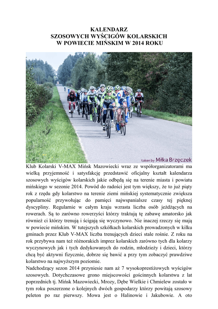 KALENDARZ SZOSOWYCH WYŚCIGÓW KOLARSKICH W POWIECIE MIŃSKIM W 2014 ROKU Klub Kolarski V-MAX Mińsk Mazowiecki wraz ze współorganizatorami ma wielką przyjemność i satysfakcję przedstawić oficjalny kształt kalendarza szosowych wyścigów kolarskich jakie odbędą się na terenie miasta i powiatu mińskiego w sezonie 2014. Powód do radości jest tym większy, że to już piąty rok z rzędu gdy kolarstwo na terenie ziemi mińskiej systematycznie zwiększa popularność przywołując do pamięci najwspanialsze czasy tej pięknej dyscypliny. Regularnie w całym kraju wzrasta liczba osób jeżdżących na rowerach. Są to zarówno rowerzyści którzy traktują tę zabawę amatorsko jak również ci którzy trenują i ścigają się wyczynowo. Nie inaczej rzeczy się mają w powiecie mińskim. W tutejszych szkółkach kolarskich prowadzonych w kilku gminach przez Klub V-MAX liczba trenujących dzieci stale rośnie. Z roku na rok przybywa nam też różnorakich imprez kolarskich zarówno tych dla kolarzy wyczynowych jak i tych dedykowanych do rodzin, młodzieży i dzieci, którzy chcą być aktywni fizycznie, dobrze się bawić a przy tym zobaczyć prawdziwe kolarstwo na najwyższym poziomie. Nadchodzący sezon 2014 przyniesie nam aż 7 wysokoprestiżowych wyścigów szosowych. Dotychczasowe grono miejscowości gościnnych kolarstwu z lat poprzednich tj. Mińsk Mazowiecki, Mrozy, Dębe Wielkie i Chmielew zostało w tym roku poszerzone o kolejnych dwóch gospodarzy którzy powitają szosowy peleton po raz pierwszy. Mowa jest o Halinowie i Jakubowie. A oto fragment kalendarza ogólnopolskiego ze wskazaniem tutejszych wyścigów zatwierdzonych już przez Komisję Masters PZKOL. 10 maja 2014 r. - Super Prestige "Kolarski Klasyk" w Chmielewie k.Mińska Mazowieckiego (Puchar Polski Masters) 11 maja 2014 r. - Super Prestige "Kolarski Klasyk" w Halinowie (Challenge Masters 2014) 7 czerwca 2014 r. - Super Prestige "Kolarski Klasyk" w Mrozach (Challenge Masters 2014) 29 czerwca 2014 r. - Kolarskie Kryterium Uliczne w Dębe Wielkim (Challenge Masters 2014) 3 sierpnia 2014 r. - Super Prestige "Kolarski Klasyk" w Jakubowie (Challenge Masters 2014) 27 wrześnie 2014 r. - "Memoriał Feliksa Rawskiego" - Kolarskie Kryterium Uliczne w Mińsku Mazowieckim (Challenge Masters 2014) 28 wrześnie 2014 r. - Zakończenie Sezonu Kolarskiego na Mazowszu "Kolarski Klasyk" w Chmielewie k.Mińska Mazowieckiego Dużym wyróżnieniem jest fakt umieszczenie wszystkich naszych imprez w Ogólnopolskim Challenge,u Masters PZKOL co oznacza że będziemy u nas podejmować wyjątkowo liczny peleton a poziom sportowy będzie niezwykle wysoki !!! Tym bardziej wszyscy jesteśmy ciekawi jak pojadą nasi zawodnicy z V-MAXu którzy w zeszłym sezonie wypracowali sobie bardzo wysokie noty w ogólnopolskim środowisku kolarskim. "..Faktycznie w ostatnim sezonie rozkręciliśmy się bardziej niż zakładałem. Nasza młodzież brylowała w wyścigach MTB na terenie całego kraju. Małgosia Pyrek zdemolowała rywalki w klasyfikacji generalnej dziewcząt. Adam Borkowski przy doskonałym wsparciu kolegów z Teamu sięgnął po zwycięstwo w klasyfikacji OPEN w generalce Ogólnopolskiego Cyklu "Super Prestige".. Chłopcy z "Elity" V-MAXU kilkakrotnie tez pokazali że potrafią skutecznie walczyć z krajowym i zagranicznym peletonem zawodowym. Teraz znów będzie trzeba pokazać się jak najlepiej - szczególnie na własnym podwórku, przed własną publicznością.. Na szczęście nie brakuje nam woli walki. W kolarstwie nie ma na to miejsca. Postaramy się solidnie namieszać a rywalom już dzisiaj obiecujemy - nie będzie łatwo.." Jacek Tomkiewicz - trener Wszystkie informacje i regulaminy dostępne są na stronie K.K.V-MAX: www.vmaxkolarze.pl oraz na FB.