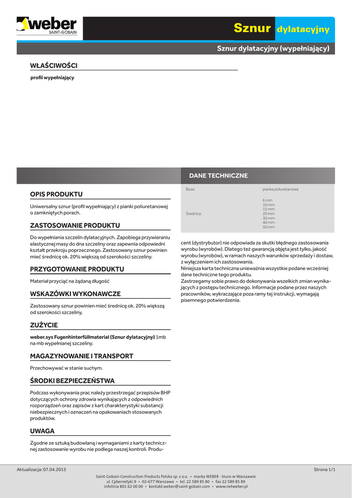 Sznur dylatacyjny Sznur dylatacyjny (wypełniający) WŁAŚCIWOŚCI profil wypełniający DANE TECHNICZNE OPIS PRODUKTU Uniwersalny sznur (profil wypełniający) z pianki poliuretanowej o zamkniętych porach. Baza: pianka poliuretanowa Średnica: 6 mm 10 mm 15 mm 20 mm 30 mm 40 mm 50 mm ZASTOSOWANIE PRODUKTU Do wypełniania szczelin dylatacyjnych. Zapobiega przywieraniu elastycznej masy do dna szczeliny oraz zapewnia odpowiedni kształt przekroju poprzecznego. Zastosowany sznur powinien mieć średnicę ok. 20% większą od szerokości szczeliny. PRZYGOTOWANIE PRODUKTU Materiał przyciąć na żądaną długość WSKAZÓWKI WYKONAWCZE Zastosowany sznur powinien mieć średnicę ok. 20% większą od szerokości szczeliny. cent (dystrybutor) nie odpowiada za skutki błędnego zastosowania wyrobu (wyrobów). Dlatego też gwarancją objęta jest tylko, jakość wyrobu (wyrobów), w ramach naszych warunków sprzedaży i dostaw, z wyłączeniem ich zastosowania. Niniejsza karta techniczna unieważnia wszystkie podane wcześniej dane techniczne tego produktu. Zastrzegamy sobie prawo do dokonywania wszelkich zmian wynikających z postępu technicznego. Informacje podane przez naszych pracowników, wykraczające poza ramy tej instrukcji, wymagają pisemnego potwierdzenia. ZUŻYCIE weber.sys Fugenhinterfüllmaterial (Sznur dylatacyjny) 1mb na mb wypełnianej szczeliny. MAGAZYNOWANIE I TRANSPORT Przechowywać w stanie suchym. ŚRODKI BEZPIECZEŃSTWA Podczas wykonywania prac należy przestrzegać przepisów BHP dotyczących ochrony zdrowia wynikających z odpowiednich rozporządzeń oraz zapisów z kart charakterystyki substancji niebezpiecznych i oznaczeń na opakowaniach stosowanych produktów. UWAGA Zgodne ze sztuką budowlaną i wymaganiami z karty technicznej zastosowanie wyrobu nie podlega naszej kontroli. Produ- Aktualizacja: 07.04.2015 Strona 1/1 Saint-Gobain Construction Products Polska sp. z o.o. • marka WEBER - biuro w Warszawie ul. Cybernetyki 9 • 02-677 Warszawa • tel. 22 589 85 80 • fax 22 589 85 89 infolinia 801 62 00 00 • [email protected] • www.netweber.pl