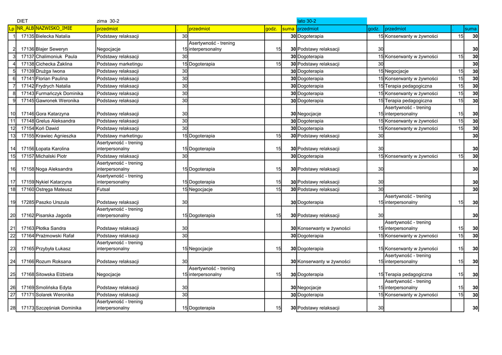DIET Lp NR_ALB NAZWISKO_IMIE 1 UMU 17135 Bielecka Natalia zima 30-2 przedmiot godz . przedmiot Podstawy relaksacji 30 lato 30-2 godz. suma przedmiot godz. przedmiot 30 Dogoterapia 15 Konserwanty w żywności 30 Podstawy relaksacji 30 30 Dogoterapia 15 Konserwanty w żywności godz . suma 15 30 15 30 2 17136 Blajer Seweryn Negocjacje Asertywność - trening 15 interpersonalny 3 17137 Chalimoniuk Paula Podstawy relaksacji 30 4 17138 Cichecka Żaklina Podstawy marketingu 15 Dogoterapia 30 Podstawy relaksacji 30 5 17139 Drużga Iwona Podstawy relaksacji 30 30 Dogoterapia 15 Negocjacje 15 30 6 17141 Florian Paulina Podstawy relaksacji 30 30 Dogoterapia 15 Konserwanty w żywności 15 30 7 17142 Frydrych Natalia Podstawy relaksacji 30 30 Dogoterapia 15 Terapia pedagogiczna 15 30 8 17143 Furmańczyk Dominika Podstawy relaksacji 30 30 Dogoterapia 15 Konserwanty w żywności 15 30 9 17145 Gawronek Weronika Podstawy relaksacji 30 30 Dogoterapia 15 30 15 15 30 30 10 17146 Gora Katarzyna Podstawy relaksacji 30 30 Negocjacje 15 Terapia pedagogiczna Asertywność - trening 15 interpersonalny 15 30 11 17148 Grelus Aleksandra Podstawy relaksacji 30 30 Dogoterapia 15 Konserwanty w żywności 15 30 15 30 12 17154 Koń Dawid Podstawy relaksacji 30 13 17155 Krawiec Agnieszka 15 Dogoterapia 15 14 17156 Łopata Karolina Podstawy marketingu Asertywność - trening interpersonalny 15 Dogoterapia 15 15 17157 Michalski Piotr 16 17158 Noga Aleksandra 17 18 30 15 Konserwanty w żywności 15 30 Podstawy relaksacji 30 30 15 Dogoterapia 15 30 Podstawy relaksacji 30 30 15 Negocjacje 15 30 Podstawy relaksacji 30 30 30 Dogoterapia Asertywność - trening 15 interpersonalny 30 Podstawy relaksacji 30 17159 Nykiel Katarzyna 17160 Ostręga Mateusz Futsal 20 17162 Pisarska Jagoda Podstawy relaksacji Asertywność - trening interpersonalny 30 30 Podstawy relaksacji 15 Dogoterapia 17285 Paszko Urszula 15 Konserwanty w żywności 30 30 Dogoterapia Podstawy relaksacji Asertywność - trening interpersonalny Asertywność - trening interpersonalny 19 30 Dogoterapia 30 Podstawy relaksacji 30 30 15 Dogoterapia 15 30 15 15 30 30 30 21 17163 Płotka Sandra Podstawy relaksacji 30 30 Konserwanty w żywności Asertywność - trening 15 interpersonalny 15 30 22 17164 Prażmowski Rafał 30 30 Dogoterapia 15 Konserwanty w żywności 15 30 23 17165 Przybyła Łukasz Podstawy relaksacji Asertywność - trening interpersonalny 15 Negocjacje 30 Dogoterapia 15 30 24 17166 Rozum Roksana Podstawy relaksacji 30 15 Konserwanty w żywności Asertywność - trening 15 interpersonalny 15 30 Negocjacje Asertywność - trening 15 interpersonalny 15 30 15 30 15 30 25 17168 Sitowska Elżbieta 15 30 Konserwanty w żywności 26 17169 Smolińska Edyta Podstawy relaksacji 30 30 Negocjacje 15 Terapia pedagogiczna Asertywność - trening 15 interpersonalny 27 17171 Solarek Weronika 30 30 Dogoterapia 15 Konserwanty w żywności 28 17173 Szczęśniak Dominika Podstawy relaksacji Asertywność - trening interpersonalny 30 Podstawy relaksacji 30 15 Dogoterapia 15 15 30 Dogoterapia 30 29 17174 Śmieżewska Karolina Asertywność - trening interpersonalny 30 17176 Trojanowski Marek Negocjacje 31 17177 Tysler Tomasz Negocjacje 32 17178 Warszewska Anna Negocjacje 15 Dogoterapia Asertywność - trening 15 interpersonalny Asertywność - trening 15 interpersonalny Asertywność - trening 15 interpersonalny 33 17179 Witkowska Paulina Podstawy relaksacji 30 15 30 Podstawy relaksacji 30 15 30 Dogoterapia 15 Konserwanty w żywności 15 30 Podstawy relaksacji 30 15 30 15 30 30 30 Dogoterapia 15 Terapia pedagogiczna 15 30 30 Dogoterapia 15 30 34 17286 Wolak Magdalena Podstawy relaksacji 30 30 Konserwanty w żywności 15 Terapia pedagogiczna Asertywność - trening 15 interpersonalny 15 30 35 17180 Wrzall Magdalena Sprzęt i programy multimedialne 30 30 Dogoterapia 15 Negocjacje 15 30 36 17181 Wybraniec Małgorzata Podstawy relaksacji 30 30 Dogoterapia 15 Konserwanty w żywności 15 30