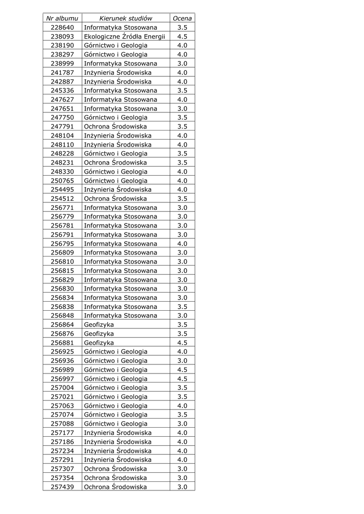 Nr albumu 228640 238093 238190 238297 238999 241787 242887 245336 247627 247651 247750 247791 248104 248110 248228 248231 248330 250765 254495 254512 256771 256779 256781 256791 256795 256809 256810 256815 256829 256830 256834 256838 256848 256864 256876 256881 256925 256936 256989 256997 257004 257021 257063 257074 257088 257177 257186 257234 257291 257307 257354 257439 Kierunek studiów Informatyka Stosowana Ekologiczne Źródła Energii Górnictwo i Geologia Górnictwo i Geologia Informatyka Stosowana Inżynieria Środowiska Inżynieria Środowiska Informatyka Stosowana Informatyka Stosowana Informatyka Stosowana Górnictwo i Geologia Ochrona Środowiska Inżynieria Środowiska Inżynieria Środowiska Górnictwo i Geologia Ochrona Środowiska Górnictwo i Geologia Górnictwo i Geologia Inżynieria Środowiska Ochrona Środowiska Informatyka Stosowana Informatyka Stosowana Informatyka Stosowana Informatyka Stosowana Informatyka Stosowana Informatyka Stosowana Informatyka Stosowana Informatyka Stosowana Informatyka Stosowana Informatyka Stosowana Informatyka Stosowana Informatyka Stosowana Informatyka Stosowana Geofizyka Geofizyka Geofizyka Górnictwo i Geologia Górnictwo i Geologia Górnictwo i Geologia Górnictwo i Geologia Górnictwo i Geologia Górnictwo i Geologia Górnictwo i Geologia Górnictwo i Geologia Górnictwo i Geologia Inżynieria Środowiska Inżynieria Środowiska Inżynieria Środowiska Inżynieria Środowiska Ochrona Środowiska Ochrona Środowiska Ochrona Środowiska Ocena 3.5 4.5 4.0 4.0 3.0 4.0 4.0 3.5 4.0 3.0 3.5 3.5 4.0 4.0 3.5 3.5 4.0 4.0 4.0 3.5 3.0 3.0 3.0 3.0 4.0 3.0 3.0 3.0 3.0 3.0 3.0 3.5 3.0 3.5 3.5 4.5 4.0 3.0 4.5 4.5 3.5 3.5 4.0 3.5 3.0 4.0 4.0 4.0 4.0 3.0 3.0 3.0 257442 257482 257495 257533 257539 257545 257550 257553 257556 257657 258529 258552 258773 258805 258934 260505 260569 260615 260854 264258 265371 266232 267982 267983 267990 267992 267994 267996 267997 268000 268016 268023 268024 268025 268027 268028 268032 268036 268037 268038 268039 268042 268045 268046 268048 268049 268050 268054 268055 268056 268058 268059 268062 Ochrona Środowiska Górnictwo i Geologia Górnictwo i Geologia Ekologiczne Źródła Energii Ekologiczne Źródła Energii Ekologiczne Źródła Energii Ekologiczne Źródła Energii Ekologiczne Źródła Energii Ekologiczne Źródła Energii Ekologiczne Źródła Energii Geofizyka Informatyka Stosowana Inżynieria Środowiska Inżynieria Środowiska Inżynieria Środowiska Informatyka Stosowana Informatyka Stosowana Ekologiczne Źródła Energii Ekologiczne Źródła Energii Ochrona Środowiska Ekologiczne Źródła Energii Informatyka Stosowana Informatyka Stosowana Informatyka Stosowana Informatyka Stosowana Informatyka Stosowana Informatyka Stosowana Informatyka Stosowana Informatyka Stosowana Informatyka Stosowana Informatyka Stosowana Geofizyka Geofizyka Geofizyka Geofizyka Geofizyka Geofizyka Geofizyka Geofizyka Geofizyka Geofizyka Geofizyka Geofizyka Geofizyka Geofizyka Geofizyka Geofizyka Geofizyka Geofizyka Geofizyka Geofizyka Geofizyka Geofizyka 3.5 3.5 4.5 4.0 3.0 4.0 3.5 4.0 4.5 4.0 3.5 4.0 4.0 4.0 4.0 3.5 3.0 4.5 4.0 3.0 4.5 3.0 3.0 4.0 3.5 3.5 4.0 3.0 3.0 3.5 3.5 4.5 4.0 4.0 4.0 3.0 3.5 4.0 4.0 3.5 4.0 4.0 3.5 3.5 4.0 4.0 3.0 3.5 3.5 4.0 3.0 3.5 3.5 268063 268064 268065 268066 268067 268068 268070 268080 268081 268082 268083 268087 268088 268090 268091 268092 268093 268095 268096 268097 268098 268099 268100 268102 268103 268104 268105 268106 268110 268111 268112 268114 268115 268117 268118 268119 268120 268122 268123 268124 268125 268126 268127 268128 268130 268131 268132 268133 268138 268139 268140 268142 268143 Geofizyka Geofizyka Geofizyka Geofizyka Geofizyka Geofizyka Geofizyka Górnictwo i Geologia Górnictwo i Geologia Górnictwo i Geologia Górnictwo i Geologia Górnictwo i Geologia Górnictwo i Geologia Górnictwo i Geologia Górnictwo i Geologia Górnictwo i Geologia Górnictwo i Geologia Górnictwo i Geologia Górnictwo i Geologia Górnictwo i Geologia Górnictwo i Geologia Górnictwo i Geologia Górnictwo i Geologia Górnictwo i Geologia Górnictwo i Geologia Górnictwo i Geologia Górnictwo i Geologia Górnictwo i Geologia Górnictwo i Geologia Ekologiczne Źródła Energii Górnictwo i Geologia Górnictwo i Geologia Górnictwo i Geologia Górnictwo i Geologia Górnictwo i Geologia Górnictwo i Geologia Górnictwo i Geologia Górnictwo i Geologia Górnictwo i Geologia Górnictwo i Geologia Górnictwo i Geologia Górnictwo i Geologia Górnictwo i Geologia Górnictwo i Geologia Górnictwo i Geologia Górnictwo i Geologia Górnictwo i Geologia Górnictwo i Geologia Górnictwo i Geologia Górnictwo i Geologia Górnictwo i Geologia Górnictwo i Geologia Górnictwo i Geologia 4.0 4.0 4.0 4.5 3.5 4.5 4.0 3.5 4.0 4.5 3.5 3.5 4.5 4.5 4.5 4.5 3.5 4.0 4.5 3.5 3.0 4.0 4.0 4.0 4.5 3.5 4.0 4.0 4.5 4.5 4.5 4.0 3.5 4.0 4.5 3.5 4.0 3.5 4.5 4.0 4.0 4.5 4.0 4.0 4.0 4.0 4.5 4.0 4.0 4.0 4.5 4.5 4.0 268145 268146 268148 268149 268150 268152 268153 268154 268155 268157 268159 268160 268162 268163 268164 268165 268166 268167 268168 268169 268170 268172 268173 268174 268175 268176 268181 268182 268183 268184 268187 268188 268190 268192 268193 268194 268195 268196 268197 268199 268201 268202 268203 268205 268206 268207 268211 268212 268213 268214 268215 268216 268217 Górnictwo Górnictwo Górnictwo Górnictwo Górnictwo Górnictwo Górnictwo Górnictwo Górnictwo Górnictwo Górnictwo Górnictwo Górnictwo Górnictwo Górnictwo Górnictwo Górnictwo Górnictwo Górnictwo Górnictwo Górnictwo Górnictwo Górnictwo Górnictwo Górnictwo Górnictwo Górnictwo Górnictwo Górnictwo Górnictwo Górnictwo Górnictwo Górnictwo Górnictwo Górnictwo Górnictwo Górnictwo Górnictwo Górnictwo Górnictwo Górnictwo Górnictwo Górnictwo Górnictwo Górnictwo Górnictwo Górnictwo Górnictwo Górnictwo Górnictwo Górnictwo Górnictwo Górnictwo i i i i i i i i i i i i i i i i i i i i i i i i i i i i i i i i i i i i i i i i i i i i i 