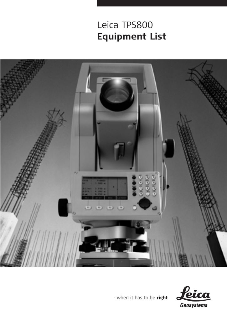 Leica TPS800 Equipment List TPS800 Equipment List TPS800 Instruments 741504 741503 741502 Total Stations TC805, 5” (1.5 mgon) TC803, 3” (1.0 mgon) TC802, 2” (0.6 mgon) 741507 741506 741505 Total Stations for reflectorless measurement TCR805power, 5” (1.5 mgon) TCR803power, 3” (1.0 mgon) TCR802power, 2” (0.6 mgon) 748605 748606 748607 TCR805ultra, 5” (1.5 mgon) TCR803ultra, 3” (1.0 mgon) TCR802ultra, 2” (0.6 mgon) Tribrachs 726839 Professional (1) Tribrach GDF121 PRO, without optical plummet, pale green Tribrach GDF122 PRO, with optical plummet, pale green Basic (2) Tribrach GDF111-1, w/o opt. Plummet, green Choice (3) CTB101 Tribrach, without optical plummet, black. 667718 722045 Tribrach Accessories GHM007 Instruments height meter. GHT196 Distance holder for height meter. 667304 667307 748888 Options for TPS800 Instruments Tripods Second Keyboard 741495 667161 741554 GTS21, 2nd keyboard, for TPS800 instruments, for telescope position 2,fitted. 296632 667301 726831 Electronic Guide Light (EGL) EGL3 Guide Light (for TPS400/700/800) Software Software Licence for applications “COGO” & “Road” 332200 Professional (1) Tripod GST20, PRO, wooden, with accessories Tripod GST120-9, wooden Choice (3) Tripod, CTP101, wooden Tripod Accessories GST4, tripod-star for setting up tripods on hard and slippery surfaces. Power Source Certificates 723945 723946 366358 366359 559655 663177 Producer Inspection Certificate M, Distances with infrared and reflectorless EDM Producer Inspection Certificate M, Angle and Distances with infrared and reflectorless EDM Producer Certificate O Producer Inspection Certificate M, (for angle & distance) Producer Inspection Certificate M (for angle) Producer Inspection Certificate M (for distance) 667318 667123 727367 409678 730484 731453 Accessory Sets 439038 TPS400/700/800 Standard accessory Set, consisting of: 1 Tribrach (GDF111-1), 2 Batteries (GEB111), 1 Charger (GKL112), 1 Data-Transfer-Cable Lemo 0/USB(GEV189), 1 Miniprism Set (GMP111), 1 Instruments height meter (GHM007), 1 Distance holder (GHT196). TPS400/700/800 Advanced accessory Set, consisting of: 1 Tribrach (GDF121),2 Batteries (GEB121), 1 Charger PRO (GKL221 + 2x GDI222), 1 Data-Transfer-Cable Lemo 0/USB(GEV189), 1 Miniprism Set (GMP111), 1 Instruments height meter (GHM007), 1 Distance holder (GHT196). 712156 Batteries Internal: GEB111 plug-in Camcorder battery, NiMh, 6V, 2,1 Ah, rechargeable, for TPS400/TPS800 GEB121 plug-in Camcorder battery, NiMh, 6V, 4,2 Ah, rechargeable, TPS400/TPS800 External: GEB171, External battery, NiMH, 12V/9Ah Power Cables Battery cable GEV52, 1.8 m, for connecting instrum.to external battery GEB171 GEV71, Car battery cable, 4m, connects 409678 to 12V car Battery Adapter GAD39 Chargers 734753 733271 733322 734389 Basic Series Charger, GKL112, BASIC, for Ni-Mh batteries GEB121/111, car adapter cable, net adapter included. Professional Series Charger, GKL221, PRO. To be used with up to two charging adapters GDI222, Charger cable and net adapter included. Adapter, GDI222, for GKL221 for charging Ni-Mh batteries of type GEB121, GEB111, charger cable included for GEB171 Car adapter for the GKL221 charger, GDC221, Allows the use of the GKL221 with a cigarette lighter; 12V24V DC/DC Converter. Data Transfer 725566 563625 Data Transfer Cable, GEV102, RS232 /Lemo 0, 2m, 9pin female, for connecting Instrument to PC, laptop 734700 Data Transfer Cable, GEV189, USB/Lemo 0, 2m, for connecting Instrument to PC, laptop etc. 667398 Data transfer cable, GEV147, Lemo 0/HR10, for connecting electronic field bock etc. 8216666 Bluetooth® Kit (includes Bluetooth® module, charger, rain cover and tripod hook. Suitable for all Leica Instruments.) 751234 USB-Bluetooth® Stick connects to PC for wireless communication with Art. Nr. 8216666 667313 667316 362820 362823 743503 Optical accessories Survey Poles 385500 403427 667309 667310 748967 742349 742329 555720 667319 Professional (1) Reflector pole, GLS11, PRO, telescopic, with circular cm/ft graduation, extends to 2,15m Mini reflector pole, GLS14, PRO, (prism/target 20cm over point), with circular bubble. Reflector pole, GLS111, BASIC, with bull's-eye bubble cm/ft graduation, extends to 2.60m, with red/white 0.20m graduations Reflector pole GLS112,BASIC, with bull's-eye bubble, cm/ft graduation, extends to 3.65m, with red/white 0.20m graduations Choice (3) Reflector Pole CPP105, with circular bubble for Flat-/mini-Prism, Snaplock at 1.5 and 2.0m Hidden Point Poles: Hidden Point Pole Set (1xGMP111, 1x GMP112) Hidden Point Pole extention, GMP112, for GMP111, includes Mini Prism with holder and 30 cm adapter pole. Struts: Dual-strut support GSR2 for GLS11/GLS11K Dual-strut support GSR111, for all GLS Reflectors 734514 743504 377802 641617 362830 639985 641618 641662 641663 641615 642534 644327 Mini Prisms Professional (1) GMP101, Mini prism, incl. bubble, target plate and spike, in bag, also suitable for GLS11 and GRT44 (same height as GPH1, additive constant +17.5mm) GMP102, Mini prism with target plate for GLS11 and GRT44 (same height as GPH1, additive constant 17.5mm) Basic (2) Mini prism set, GMP111, BASIC, Mini Prism GMP111-0 for zero prism constant. GRZ101, 360° Mini prism with pole and level assembly. Prism constant +30mm. Pole of 4 parts with length of 30cm each and with 2 pole tips. Level assembly freely attachable at the pole. Diagonal eyepiece, GFZ3 for telescope GV013 solar filter FOK53 Eyepiece, additional eyepiece (modification in a workshop necessary) Miscellaneous Accessories 667451 744501 404246 727589 GVP609, Container, for 2 Circular prisms GPR111/121, 2 Laser plummets and 2 tribrachs. Back strap(2), GZD66 for new container Tripod Pouch with plumb bob Soft Bag for prism station, CTC102 CD-ROM 725602 Instrument CD – Builder/TPS400/700/800 Series LEICA Geo Office 742616 734712 734113 734114 Standard Prisms Professional (1) Circular prism GPR121 PRO, with holder and target plate Single Circular Prism, GPR1 360° Ref