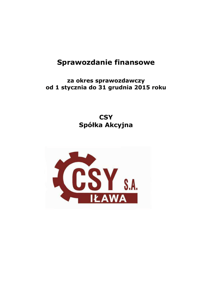 Sprawozdanie finansowe za okres sprawozdawczy od 1 stycznia do 31 grudnia 2015 roku CSY Spółka Akcyjna Sprawozdanie finansowe CSY S.A. za 2015 rok Dla Akcjonariuszy CSY S.A. W związku ze sporządzeniem rocznego jednostkowego sprawozdania finansowego za okres sprawozdawczy od 1 stycznia do 31 grudnia 2015 roku przekazujemy Państwu to sprawozdanie, które zostało sporządzone w sposób zapewniający prawidłowy i rzetelny obraz sytuacji majątkowej i finansowej Spółki na koniec grudnia 2015 roku oraz wyniku finansowego za 12 miesięcy 2015 roku. Elementy sprawozdania w następującej kolejności: finansowego zostały przedstawione w niniejszym dokumencie Sprawozdanie z sytuacji finansowej na dzień 31 grudnia 2015 roku wykazujące po stronie aktywów i pasywów kwotę 40 493 tys. zł Rachunek zysków i strat za okres od 1 stycznia do 31 grudnia 2015 roku wariant kalkulacyjny wykazujący stratę netto w kwocie 3 003 tys. zł Sprawozdanie z całkowitych dochodów od 1 stycznia do 31 grudnia 2015 roku wykazujące całkowity dochód w kwocie -3 003 tys. zł Sprawozdanie z przepływów pieniężnych kwotę 376 tys. zł wykazujące zwiększenie stanu środków pieniężnych o Sprawozdanie ze zmian w kapitale własnym za okres obrotowy od 1 stycznia do 31 grudnia 2015 roku wykazujące zwiększenie stanu kapitału własnego o 18 597 tys. zł Sprawozdanie wg segmentów operacyjnych Dodatkowe noty i objaśnienia Iława, dnia 28 kwietnia 2016 rok Osoba, której powierzono prowadzenie ksiąg rachunkowych Wiesława Wałdowska-Trzciałkowska Prezes Zarządu Grzegorz Wrona Wiceprezes Zarządu Mariusz Matusik 2 Sprawozdanie finansowe CSY S.A. za 2015 rok A. SPRAWOZDANIE Z SYTUACJI FINANSOWEJ na dzień 31 grudnia 2015 roku oraz 31 grudnia 2014 roku Wyszczególnienie NOTA Aktywa trwałe 31.12.2015 31.12.2014 12 278 14 848 Inne wartości niematerialne 21 39 Rzeczowe aktywa trwałe 22 6 025 6 155 Należności długoterminowe 23 0 3 588 Udziały i akcje 24 5 000 4 971 Aktywa z tytułu podatku odroczonego 25 1 214 134 Aktywa obrotowe 11 619 4 926 Zapasy 26 2 628 1 681 Należności z tytułu dostaw i usług 27 3 235 2 568 27.6 4 946 152 34 123 Należności pozostałe Należności budżetowe Należności z tytułu podatku dochodowego Środki pieniężne i ich ekwiwalenty 28 763 387 Rozliczenia międzyokresowe 29 13 15 Krótkoterminowe aktywa finansowe 30 Aktywa finansowe wyceniane w wartości godziwej poprzez wynik finansowy 31 AKTYWA OGÓŁEM Kapitał własny 32 Kapitał akcyjny Kapitał z aktualizacji wyceny Kapitał zapasowy 960 16 596 599 40 493 21 333 32 236 13 639 32 400 10 800 334 334 2 505 1816 - 3 003 689 Zysk (strata) z lat ubiegłych Zyski (strata) netto Zobowiązania długoterminowe 4 548 3 699 Kredyty bankowe 33 1 710 1942 Zobowiązania z tytułu leasingu finansowego 34 374 346 Inne zobowiązania finansowe 34 509 Zobowiązania pozostałe 504 Rezerwa z tytułu podatku odroczonego 38 477 Rezerwy na inne zobowiązania 39 87 63 Rozliczenia międzyokresowe 40 887 276 Zobowiązania krótkoterminowe 1072 3 709 3 995 Kredyty bankowe 33 1 141 1 804 Zobowiązania z tytułu leasingu finansowego 34 313 234 Zobowiązania faktoringowe 34 118 Zobowiązania z tytułu dostaw i usług 35 1 285 826 Zobowiązania pozostałe 36 303 771 Zobowiązanie budżetowe 36 387 316 Zobowiązania z tytułu podatku dochodowego 19 Rezerwy na zobowiązania 10 10 133 34 40 493 21 333 Rozliczenia międzyokresowe 40 Zobowiązania dotyczące aktywów przeznaczonych do zbycia ZOBOWIĄZANIA I REZERWY NA ZOBOWIĄZANIA OGÓŁEM 3 Sprawozdanie finansowe CSY S.A. za 2015 rok C. RACHUNEK Z ZYSKÓW I STRAT za okres 1 stycznia do dnia 31 grudnia 2015 roku oraz za okres 1 stycznia do dnia 31 grudnia 2014 roku Wyszczególnienie NOTA 01.01.2015 31.12.2015 01.01.2014 31.12.2014 18 627 15 652 17 005 14 956 Działalność kontynuowana Przychody ze sprzedaży 41 Przychody ze sprzedaży produktów i usług Przychody ze sprzedaży ze sprzedaży towarów i materiałów 1 622 696 17 153 14 651 Koszt wytworzenia sprzedanych produktów 12 540 11 343 Wartość sprzedanych towarów i materiałów 1 466 656 933 707 Koszty działalności operacyjnej 42 Koszty sprzedaży Koszty zarządu 2 214 1 945 Zysk (strata) na sprzedaży 1 474 1 001 253 Pozostałe przychody operacyjne 43 348 Pozostałe koszty operacyjne 44 276 78 1 546 1 176 Zysk (strata) na działalności operacyjnej Przychody finansowe 45 8 78 Koszty finansowe 46 5 875 377 - 4 321 877 Zysk (strata) brutto Podatek dochodowy/ odroczony - 1 318 188 - 3 003 689 C. Zysk (strata) netto za okres sprawozdawczy -3 003 689 Średnia ważona liczba akcji zwykłych (w tys.) Podstawowy / rozwodniony Zysk (strata) netto za okres sprawozdawczy na 1 akcję 11 569 10 800 -0,26 0,06 Zysk (strata) netto z działalności kontynuowanej 47 Działalność zaniechana Zysk (strata) netto z działalności zaniechanej 4 Sprawozdanie finansowe CSY S.A. za 2015 rok D. SPRAWOZDANIE Z CAŁKOWITYCH DOCHODÓW za okres 1 stycznia do dnia 31 grudnia 2015 roku oraz za okres 1 stycznia do dnia 31 grudnia 2014 roku 01.01.2015 31.12.2015 01.01.2014 31.12.2014 - 3 003 689 Całkowite dochody ogółem -3 003 689 Średnia ważona liczba akcji zwykłych (w tys.) Podstawowy / rozwodniony Zysk (strata) netto za okres sprawozdawczy na 1 akcję 11 569 10 800 -0,26 0,06 Wyszczególnienie Zysk (strata) netto za okres sprawozdawczy Inne całkowite dochody Różnice kursowe z przeliczenia jednostek zagranicznych Skutki wyceny aktywów finansowych dostępnych do sprzedaży Rachunkowość zabezpieczeń Skutki aktualizacji majątku trwałego Zyski i straty aktuarialne Udział w innych całkowitych dochodach jednostek stowarzyszonych Podatek dochodowy dotyczący innych całkowitych dochodów Inne całkowite dochody (netto) 5 Sprawozdanie finansowe CSY S.A. za 2015 rok E. SPRAWOZDANIE Z PRZEPŁYWÓW PIENIĘŻNYCH za okres zakończony dnia 31 grudnia 2015 oraz za okres zakończony dnia 31 grudnia 2014 roku Wyszczególnienie 01.01.2015 31.12.2015 01.01.2014 31.