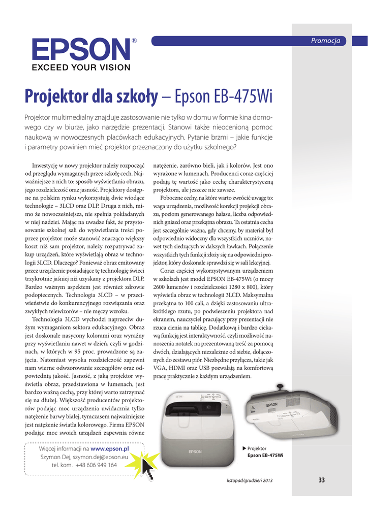 Promocja Projektor dla szkoły – Epson EB-475Wi Projektor multimedialny znajduje zastosowanie nie tylko w domu w formie kina domowego czy w biurze, jako narzędzie prezentacji. Stanowi także nieocenioną pomoc naukową w nowoczesnych placówkach edukacyjnych. Pytanie brzmi – jakie funkcje i parametry powinien mieć projektor przeznaczony do użytku szkolnego? Inwestycję w nowy projektor należy rozpocząć od przeglądu wymaganych przez szkołę cech. Najważniejsze z nich to: sposób wyświetlania obrazu, jego rozdzielczość oraz jasność. Projektory dostępne na polskim rynku wykorzystują dwie wiodące technologie – 3LCD oraz DLP. Druga z nich, mimo że nowocześniejsza, nie spełnia pokładanych w niej nadziei. Mając na uwadze fakt, że przystosowanie szkolnej sali do wyświetlania treści poprzez projektor może stanowić znacząco większy koszt niż sam projektor, należy rozpatrywać zakup urządzeń, które wyświetlają obraz w technologii 3LCD. Dlaczego? Ponieważ obraz emitowany przez urządzenie posiadające tę technologię świeci trzykrotnie jaśniej niż uzyskany z projektora DLP. Bardzo ważnym aspektem jest również zdrowie podopiecznych. Technologia 3LCD – w przeciwieństwie do konkurencyjnego rozwiązania oraz zwykłych telewizorów – nie męczy wzroku. Technologia 3LCD wychodzi naprzeciw dużym wymaganiom sektora edukacyjnego. Obraz jest doskonale nasycony kolorami oraz wyraźny przy wyświetlaniu nawet w dzień, czyli w godzinach, w których w 95 proc. prowadzone są zajęcia. Natomiast wysoka rozdzielczość zapewni nam wierne odwzorowanie szczegółów oraz odpowiednią jakość. Jasność, z jaką projektor wyświetla obraz, przedstawiona w lumenach, jest bardzo ważną cechą, przy której warto zatrzymać się na dłużej. Większość producentów projektorów podając moc urządzenia uwidacznia tylko natężenie barwy białej, tymczasem najważniejsze jest natężenie światła kolorowego. Firma EPSON podając moc swoich urządzeń zapewnia równe Więcej informacji na www.epson.pl Szymon Dej, [email protected] tel. kom. +48 606 949 164 natężenie, zarówno bieli, jak i kolorów. Jest ono wyrażone w lumenach. Producenci coraz częściej podają tę wartość jako cechę charakterystyczną projektora, ale jeszcze nie zawsze. Poboczne cechy, na które warto zwrócić uwagę to: waga urządzenia, możliwość korekcji projekcji obrazu, poziom generowanego hałasu, liczba odpowiednich gniazd oraz przekątna obrazu. Ta ostatnia cecha jest szczególnie ważna, gdy chcemy, by materiał był odpowiednio widoczny dla wszystkich uczniów, nawet tych siedzących w dalszych ławkach. Połączenie wszystkich tych funkcji złoży się na odpowiedni projektor, który doskonale sprawdzi się w sali lekcyjnej. Coraz częściej wykorzystywanym urządzeniem w szkołach jest model EPSON EB-475Wi (o mocy 2600 lumenów i rozdzielczości 1280 x 800), który wyświetla obraz w technologii 3LCD. Maksymalna przekątna to 100 cali, a dzięki zastosowaniu ultrakrótkiego rzutu, po podwieszeniu projektora nad ekranem, nauczyciel pracujący przy prezentacji nie rzuca cienia na tablicę. Dodatkową i bardzo ciekawą funkcją jest interaktywność, czyli możliwość nanoszenia notatek na prezentowaną treść za pomocą dwóch, działających niezależnie od siebie, dołączonych do zestawu piór. Niezbędne przyłącza, takie jak VGA, HDMI oraz USB pozwalają na komfortową pracę praktycznie z każdym urządzeniem. ądzeniem. X Projektor Epson EB-475Wi listopad/grudzień 2013 33