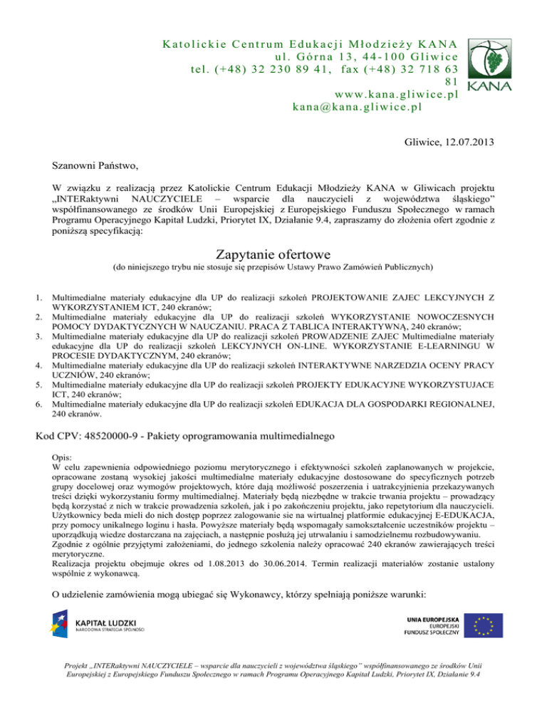 Katolickie Centrum Edukacji Młodzieży KANA ul. Górna 13, 44-100 Gliwice t e l . ( + 4 8 ) 3 2 2 3 0 89 4 1 , f a x ( + 4 8 ) 3 2 7 1 8 6 3 81 www.kana.gliwice.pl k a n a @k a n a . g l i w i c e . p l Gliwice, 12.07.2013 Szanowni Państwo, W związku z realizacją przez Katolickie Centrum Edukacji Młodzieży KANA w Gliwicach projektu „INTERaktywni NAUCZYCIELE – wsparcie dla nauczycieli z województwa śląskiego” współfinansowanego ze środków Unii Europejskiej z Europejskiego Funduszu Społecznego w ramach Programu Operacyjnego Kapitał Ludzki, Priorytet IX, Działanie 9.4, zapraszamy do złożenia ofert zgodnie z poniższą specyfikacją: Zapytanie ofertowe (do niniejszego trybu nie stosuje się przepisów Ustawy Prawo Zamówień Publicznych) 1. 2. 3. 4. 5. 6. Multimedialne materiały edukacyjne dla UP do realizacji szkoleń PROJEKTOWANIE ZAJEC LEKCYJNYCH Z WYKORZYSTANIEM ICT, 240 ekranów; Multimedialne materiały edukacyjne dla UP do realizacji szkoleń WYKORZYSTANIE NOWOCZESNYCH POMOCY DYDAKTYCZNYCH W NAUCZANIU. PRACA Z TABLICA INTERAKTYWNĄ, 240 ekranów; Multimedialne materiały edukacyjne dla UP do realizacji szkoleń PROWADZENIE ZAJEC Multimedialne materiały edukacyjne dla UP do realizacji szkoleń LEKCYJNYCH ON-LINE. WYKORZYSTANIE E-LEARNINGU W PROCESIE DYDAKTYCZNYM, 240 ekranów; Multimedialne materiały edukacyjne dla UP do realizacji szkoleń INTERAKTYWNE NARZEDZIA OCENY PRACY UCZNIÓW, 240 ekranów; Multimedialne materiały edukacyjne dla UP do realizacji szkoleń PROJEKTY EDUKACYJNE WYKORZYSTUJACE ICT, 240 ekranów; Multimedialne materiały edukacyjne dla UP do realizacji szkoleń EDUKACJA DLA GOSPODARKI REGIONALNEJ, 240 ekranów. Kod CPV: 48520000-9 - Pakiety oprogramowania multimedialnego Opis: W celu zapewnienia odpowiedniego poziomu merytorycznego i efektywności szkoleń zaplanowanych w projekcie, opracowane zostaną wysokiej jakości multimedialne materiały edukacyjne dostosowane do specyficznych potrzeb grupy docelowej oraz wymogów projektowych, które dają możliwość poszerzenia i uatrakcyjnienia przekazywanych treści dzięki wykorzystaniu formy multimedialnej. Materiały będą niezbędne w trakcie trwania projektu – prowadzący będą korzystać z nich w trakcie prowadzenia szkoleń, jak i po zakończeniu projektu, jako repetytorium dla nauczycieli. Użytkownicy beda mieli do nich dostęp poprzez zalogowanie sie na wirtualnej platformie edukacyjnej E-EDUKACJA, przy pomocy unikalnego loginu i hasła. Powyższe materiały będą wspomagały samokształcenie uczestników projektu – uporządkują wiedze dostarczana na zajęciach, a następnie posłużą jej utrwalaniu i samodzielnemu rozbudowywaniu. Zgodnie z ogólnie przyjętymi założeniami, do jednego szkolenia należy opracować 240 ekranów zawierających treści merytoryczne. Realizacja projektu obejmuje okres od 1.08.2013 do 30.06.2014. Termin realizacji materiałów zostanie ustalony wspólnie z wykonawcą. O udzielenie zamówienia mogą ubiegać się Wykonawcy, którzy spełniają poniższe warunki: Projekt „INTERaktywni NAUCZYCIELE – wsparcie dla nauczycieli z województwa śląskiego” współfinansowanego ze środków Unii Europejskiej z Europejskiego Funduszu Społecznego w ramach Programu Operacyjnego Kapitał Ludzki, Priorytet IX, Działanie 9.4 1) Akceptują treść zapytania bez zastrzeżeń – złożenie oferty jest uważane za akceptację treści zapytania. 2) Posiadają uprawnienia do wykonywania określonej działalności lub czynności, jeżeli ustawy nakładają obowiązek posiadania takich uprawnień, w tym: prowadzą działalność gospodarczą w zakresie objętym zamówieniem (dotyczy Wykonawców prowadzących działalność gospodarczą). Warunkiem spełnienia wymagania określonego w pkt. 2 jest dostarczenie dokumentu: odpis z KRS, zaświadczenie o prowadzeniu działalności gospodarczej. 3) Posiadają niezbędną wiedzę i doświadczenie oraz dysponują potencjałem technicznym i osobami zdolnymi do wykonania zamówienia. 4) Znajdują się w sytuacji ekonomicznej i finansowej zapewniającej wykonanie zamówienia. 5) Oferent jest podmiotem niepowiązanym z Zamawiającym w sposób osobowy lub kapitałowy. Przez powiązania kapitałowe lub osobowe rozumie się w szczególności: • uczestniczenie w spółce jako wspólnik lub tworzenie z KANĄ Gliwice spółki cywilnej lub spółki osobowej; • posiadanie co najmniej 10 % udziałów w KANIE Gliwice; • pełnienie funkcji członka organu nadzorczego lub zarządzającego, prokurenta, pełnomocnika; • pozostawanie w związku małżeńskim, w stosunku pokrewieństwa lub powinowactwa w linii prostej, pokrewieństwa lub powinowactwa w linii bocznej do drugiego stopnia lub w stosunku przysposobienia, opieki lub kurateli. Proszę o podanie cen brutto usługi, w PLN z dokładnością do dwóch miejsc po przecinku. Dopuszcza się składanie ofert na dowolną liczbę tematów materiałów edukacyjnych. Termin składania oferty: do dnia 31 lipca 2013. Kryterium wyboru: - 20% cena, - 40% doświadczenie, - 40% metodologia opracowania poszczególnych materiałów. Ocena punktowa to maksymalnie 100 pkt (100%). Ocena składa się z sumy punktów: C (cena, o randze 20%) + D (doświadczenie, jest 40 pkt, nie ma 0 pkt) + M (poprawna metodologia, jest 40 pkt, nie ma 0 pkt). Składnik C (cena) wyliczana jest wg zależności: C = Ranga 20% * Kwota minimalna (najniższa) / Kwota badana (oferowana) W załączeniu przekazuję wzór oferty. Do oferty proszę załączyć: 1. Opis doświadczenia oraz liczbę materiałów edukacyjnych lub warsztatowych lub aplikacji informatycznych. 2. Opis metodologii opracowania materiałów. W razie pytań proszę o kontakt: Waldemar Kuwaczka KANA Gliwice ul. Górna 13 44-100 Gliwice tel. +48 32 230 89 41 e-mail: [email protected] Oferty należy dostarczyć do KANY Gliwice osobiście, pocztą tradycyjną lub za pomocą poczty elektronicznej na powyżej podane adresy. Projekt „INTERaktywni NAUCZYCI