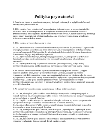 Polityka prywatności 1. Serwis nie zbiera w sposób automatyczny żadnych informacji, z wyjątkiem informacji zawartych w plikach cookies. 2. Pliki cookies (tzw. „ciasteczka”) stanowią dane informatyczne, w szczególności pliki tekstowe, które przechowywane są w urządzeniu końcowym Użytkownika Serwisu i przeznaczone są do korzystania ze stron internetowych Serwisu. Cookies zazwyczaj zawierają nazwę strony internetowej, z której pochodzą, czas przechowywania ich na urządzeniu końcowym oraz unikalny numer. 3. Pliki cookies wykorzystywane są w celu: 1.i.1.a.i.a) dostosowania zawartości stron internetowych Serwisu do preferencji Użytkownika oraz optymalizacji korzystania ze stron internetowych; w szczególności pliki te pozwalają rozpoznać urządzenie Użytkownika Serwisu i odpowiednio wyświetlić stronę internetową, dostosowaną do jego indywidualnych potrzeb; 1.i.1.a.i.b) tworzenia statystyk, które pomagają zrozumieć, w jaki sposób Użytkownicy Serwisu korzystają ze stron internetowych, co umożliwia ulepszanie ich struktury i zawartości; 1.i.1.a.i.c) utrzymanie sesji Użytkownika Serwisu (po zalogowaniu), dzięki której Użytkownik nie musi na każdej podstronie Serwisu ponownie wpisywać loginu i hasła; 4. W ramach Serwisu stosowane są dwa zasadnicze rodzaje plików cookies: „sesyjne” (session cookies) oraz „stałe” (persistent cookies). Cookies „sesyjne” są plikami tymczasowymi, które przechowywane są w urządzeniu końcowym Użytkownika do czasu wylogowania, opuszczenia strony internetowej lub wyłączenia oprogramowania (przeglądarki internetowej). „Stałe” pliki cookies przechowywane są w urządzeniu końcowym Użytkownika przez czas określony w parametrach plików cookies lub do czasu ich usunięcia przez Użytkownika. 5. W ramach Serwisu stosowane są następujące rodzaje plików cookies: 1.i.1.a.i.a) „niezbędne” pliki cookies, umożliwiające korzystanie z usług dostępnych w ramach Serwisu, np. uwierzytelniające pliki cookies wykorzystywane do usług wymagających uwierzytelniania w ramach Serwisu; 1.i.1.a.i.b) pliki cookies służące do zapewnienia bezpieczeństwa, np. wykorzystywane do wykrywania nadużyć w zakresie uwierzytelniania w ramach Serwisu; 1.i.1.a.i.c) „wydajnościowe” pliki cookies, umożliwiające zbieranie informacji o sposobie korzystania ze stron internetowych Serwisu; 1.i.1.a.i.d) „funkcjonalne” pliki cookies, umożliwiające „zapamiętanie” wybranych przez Użytkownika ustawień i personalizację interfejsu Użytkownika, np. w zakresie wybranego języka lub regionu, z którego pochodzi Użytkownik, rozmiaru czcionki, wyglądu strony internetowej itp.; 1.i.1.a.i.e) „reklamowe” pliki cookies, umożliwiające dostarczanie Użytkownikom treści reklamowych bardziej dostosowanych do ich zainteresowań. 6. W wielu przypadkach oprogramowanie służące do przeglądania stron internetowych (przeglądarka internetowa) domyślnie dopuszcza przechowywanie plików cookies w urządzeniu końcowym Użytkownika. Użytkownicy Serwisu mogą dokonać w każdym czasie zmiany ustawień dotyczących plików cookies. Ustawienia te mogą zostać zmienione w szczególności w taki sposób, aby blokować automatyczną obsługę plików cookies w ustawieniach przeglądarki internetowej bądź informować o ich każdorazowym zamieszczeniu w urządzeniu Użytkownika Serwisu. Szczegółowe informacje o możliwości i sposobach obsługi plików cookies dostępne są w ustawieniach oprogramowania (przeglądarki internetowej). 7. Operator Serwisu informuje, że ograniczenia stosowania plików cookies mogą wpłynąć na niektóre funkcjonalności dostępne na stronach internetowych Serwisu. 8. Pliki cookies zamieszczane w urządzeniu końcowym Użytkownika Serwisu i wykorzystywane mogą być również przez współpracujących z operatorem Serwisu reklamodawców oraz partnerów. 9. Więcej informacji na temat plików cookies dostępnych w sekcji „Pomoc” w menu przeglądarki internetowej.