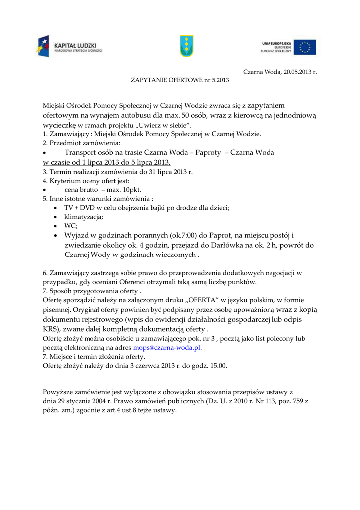 Czarna Woda, 20.05.2013 r. ZAPYTANIE OFERTOWE nr 5.2013 Miejski Ośrodek Pomocy Społecznej w Czarnej Wodzie zwraca się z zapytaniem ofertowym na wynajem autobusu dla max. 50 osób, wraz z kierowcą na jednodniową wycieczkę w ramach projektu „Uwierz w siebie”. 1. Zamawiający : Miejski Ośrodek Pomocy Społecznej w Czarnej Wodzie. 2. Przedmiot zamówienia: Transport osób na trasie Czarna Woda – Paproty – Czarna Woda w czasie od 1 lipca 2013 do 5 lipca 2013. 3. Termin realizacji zamówienia do 31 lipca 2013 r. 4. Kryterium oceny ofert jest: cena brutto – max. 10pkt. 5. Inne istotne warunki zamówienia : TV + DVD w celu obejrzenia bajki po drodze dla dzieci; klimatyzacja; WC; Wyjazd w godzinach porannych (ok.7:00) do Paprot, na miejscu postój i zwiedzanie okolicy ok. 4 godzin, przejazd do Darłówka na ok. 2 h, powrót do Czarnej Wody w godzinach wieczornych . 6. Zamawiający zastrzega sobie prawo do przeprowadzenia dodatkowych negocjacji w przypadku, gdy oceniani Oferenci otrzymali taką samą liczbę punktów. 7. Sposób przygotowania oferty . Ofertę sporządzić należy na załączonym druku „OFERTA” w języku polskim, w formie pisemnej. Oryginał oferty powinien być podpisany przez osobę upoważnioną wraz z kopią dokumentu rejestrowego (wpis do ewidencji działalności gospodarczej lub odpis KRS), zwane dalej kompletną dokumentacją oferty . Ofertę złożyć można osobiście u zamawiającego pok. nr 3 , pocztą jako list polecony lub pocztą elektroniczną na adres [email protected]. 7. Miejsce i termin złożenia oferty. Ofertę złożyć należy do dnia 3 czerwca 2013 r. do godz. 15.00. Powyższe zamówienie jest wyłączone z obowiązku stosowania przepisów ustawy z dnia 29 stycznia 2004 r. Prawo zamówień publicznych (Dz. U. z 2010 r. Nr 113, poz. 759 z późn. zm.) zgodnie z art.4 ust.8 tejże ustawy. OFERTA Wynajem autobusu z kierowcą na jednodniową wycieczkę. …………………….. …………………… Miejscowość data …………………………………. oznaczenie Oferenta /nazwa siedziba i adres, ewentualnie czytelna pieczątka/ oświadczam (-y), iż zadanie opisane w zapytaniu ofertowym MOPS Czarna Woda z dnia ……/..…../……… wykonam (-y) na warunkach zgodnych z treścią przedmiotowego zapytania przy zastosowaniu przedstawionych poniżej kryteriów: CENA Wyposażenie autobusu Załącznik: 1. kopia wpisu do ewidencji działalności gospodarczej lub kopia odpisu KRS,