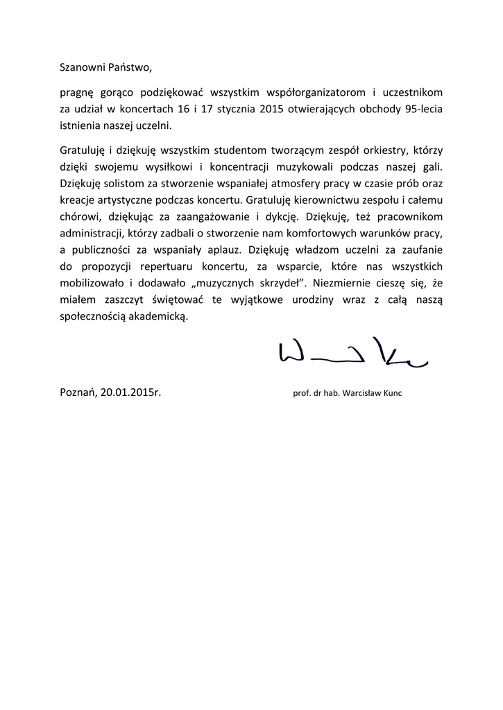 Szanowni Państwo, pragnę gorąco podziękować wszystkim współorganizatorom i uczestnikom za udział w koncertach 16 i 17 stycznia 2015 otwierających obchody 95-lecia istnienia naszej uczelni. Gratuluję i dziękuję wszystkim studentom tworzącym zespół orkiestry, którzy dzięki swojemu wysiłkowi i koncentracji muzykowali podczas naszej gali. Dziękuję solistom za stworzenie wspaniałej atmosfery pracy w czasie prób oraz kreacje artystyczne podczas koncertu. Gratuluję kierownictwu zespołu i całemu chórowi, dziękując za zaangażowanie i dykcję. Dziękuję, też pracownikom administracji, którzy zadbali o stworzenie nam komfortowych warunków pracy, a publiczności za wspaniały aplauz. Dziękuję władzom uczelni za zaufanie do propozycji repertuaru koncertu, za wsparcie, które nas wszystkich mobilizowało i dodawało „muzycznych skrzydeł”. Niezmiernie cieszę się, że miałem zaszczyt świętować te wyjątkowe urodziny wraz z całą naszą społecznością akademicką. Poznań, 20.01.2015r. prof. dr hab. Warcisław Kunc