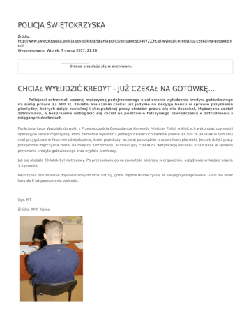 POLICJA ŚWIĘTOKRZYSKA Źródło: http://www.swietokrzyska.policja.gov.pl/kie/dzialania-policji/aktualnosci/4072,Chcial-wyludzic-kredyt-juz-czekal-na-gotowke.h tml Wygenerowano: Wtorek, 7 marca 2017, 21:28 Strona znajduje się w archiwum. CHCIAŁ WYŁUDZIĆ KREDYT - JUŻ CZEKAŁ NA GOTÓWKĘ… Policjanci zatrzymali wczoraj mężczyznę podejrzewanego o usiłowanie wyłudzenia kredytu gotówkowego na sumę prawie 33 500 zł. 33-letni kielczanin czekał już jedynie na decyzję banku w sprawie przyznania pieniędzy, których dzięki rzetelnej i skrupulatnej pracy stróżów prawa się nie doczekał. Mężczyzna został zatrzymany, a bezprawnie wzbogacić się chciał na podstawie fałszywego oświadczenia o zatrudnieniu i osiąganych dochodach. Funkcjonariusze Wydziału do walki z Przestępczością Gospodarczą Komendy Miejskiej Policji w Kielcach wykonując czynności operacyjne ustalili mężczyznę, który zamierzał wyłudzić z jednego z kieleckich banków prawie 33 500 zł. 33-latek w tym celu miał przygotowane fałszywe oświadczenia, które przedłożył wczoraj popołudniu pracownikom placówki. Jednak dzięki pracy policjantów mężczyzna został na miejscu zatrzymany, w chwili gdy czekał na weryfikację wniosku przez bank w sprawie przyznania kredytu gotówkowego oraz wypłatę pieniędzy. Jak się okazało 33-latek był nietrzeźwy. Po przebadaniu go na zawartość alkoholu w organizmie, urządzenie wykazało prawie 1,5 promila. Mężczyzna dziś zostanie doprowadzony do Prokuratury, gdzie będzie tłumaczył się ze swojego postępowania. Grozi mu teraz kara do 8 lat pozbawienia wolności. Opr. MT Źródło: KMP Kielce Ocena: 0/5 (0) Tweetnij