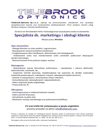 Telebrook Optronics Sp. z o. o. zajmuje się konstruowaniem, wdrażaniem oraz sprzedażą specjalistycznych laserów oraz komponentów światłowodowych. Firma świadczy również usługi doradcze związane z techniką światłowodową. Do biura we Wrocławskim Parku Technologicznym poszukujemy osoby na stanowisko: Specjalista ds. marketingu i obsługi klienta Miejsce pracy: Wrocław Opis stanowiska: - Obsługa klientów na rynku polskim i zagranicznym; - Nawiązywanie nowych kontaktów handlowych; - Przygotowywanie ofert handlowych, dokumentacji, kart katalogowych; - Analizowanie rynku oraz monitorowanie rynku zamówień publicznych dotyczących sprzętu laserowego; - Reprezentowanie firmy podczas targów, wystaw; Wymagania: - Wykształcenie wyższe kierunkowe preferowane – specjalizacja z zakresu elektroniki, elektrotechniki, mechaniki, itp., - Znajomość techniki laserowej, światłowodowej lub systemów do obróbki materiałów (systemów grawerujących, znakujących, tnących, spawających) będzie pomocna, - Łatwość w nawiązywaniu i utrzymywaniu relacji z klientem, - Komunikatywność, obowiązkowość i odpowiedzialność, - Dobra znajomość języka angielskiego, - Prawo jazdy kat. B; Oferujemy: - Interesującą pracę w międzynarodowym zespole, - Dobre warunki finansowe, - Zatrudnienie na pełny etat, - Możliwości rozwoju zawodowego oraz podnoszenia kwalifikacji. CV oraz krótki list motywacyjny w języku angielskim prosimy przesyłać na adres: [email protected]. Prosimy o dopisanie do swojego CV następującej klauzuli: Wyrażam zgodę na przetwarzanie moich danych osobowych zawartych w mojej ofercie pracy dla potrzeb niezbędnych do realizacji procesu rekrutacji zgodnie z ustawą z dnia 29 sierpnia 1997 r. o ochronie danych osobowych (Dz. U. z 2002 r. Nr 101, poz. 926, ze zm.) Zastrzegamy sobie prawo do kontaktu tylko z wybranymi kandydatami. Telebrook Optronics Sp. z o.o. ul. Duńska 9, 54-427 Wrocław. Tel. +48 71 735-19-77. E-mail: [email protected]. www.telebrook.com
