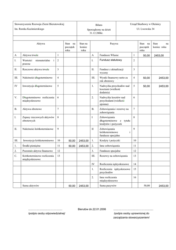 Stowarzyszenie Rozwoju Ziemi Bierutowskiej Im. Romka Kazimierskiego Aktywa A Aktywa trwałe I. Wartości prawne II. Stan na początek roku Bilans Urząd Skarbowy w Oleśnicy Sporządzony na dzień 31.12.2006r. Ul. Lwowska 34 Stan na koniec roku Pasywa Stan na początek roku Stan na koniec roku 1 A Fundusze Własne 1 2 I. Fundusz statutowy 2 Rzeczowe aktywa trwałe 3 II. Fundusz z aktualizacji wyceny 3 III. Należności długoterminowe 4 III. Wynik finansowy netto za rok obrotowy 4 50,00 2453,00 IV Inwestycje długoterminowe 5 1. Nadwyżka przychodów nad kosztami (wielkość dodatnia) 5 50,00 2453,00 V. Długoterminowe rozliczenia międzyokresowe 6 2. Nadwyżka kosztów nad przychodami (wielkość ujemna) 6 B. Aktywa obrotowe 7 B. Zobowiązania i rezerwy na zobowiązania 7 I. Zapasy rzeczowych aktywów obrotowych 8 I Zobowiązania długoterminowe z tytułu kredytów i pożyczek 8 II. Należności krótkoterminowe 9 II Zobowiązania krótkoterminowe fundusze specjalne 9 50,00 2453,00 niematerialne i Inwestycje krótkoterminowe 10 50,00 2453,00 1. Kredyty i pożyczki 10 1. Środki pieniężne 11 50,00 2453,00 2. Inne zobowiązania 11 2. Pozostałe aktywa finansowe 12 3. Fundusze specjalne 12 C. Krótkoterminowe rozliczenia międzyokresowe 13 III. Rezerwy na zobowiązania 13 IV Rozliczenia iędzyokresowe 14 1. Rozliczenia iędzyokresowe przychodów 15 2. Inne rozliczenia międzyokresowe 16 .............................................. /podpis osoby odpowiedzialnej/ 50,00 2453,00 Suma pasywów Bierutów dn.22.01.2006 2453,00 i III. Suma aktywów 50,00 ...................................................... /podpis osoby uprawnionej do zarządzania stowarzyszeniem/ Stowarzyszenie Rozwoju Ziemi Bierutowskiej Im. Romka Kazimierskiego Przychody i zyski Stan na początek roku Koszty i straty A Przychody statusowej I. z Rachunek wyników Urząd Skarbowy w Oleśnicy Sporządzony na dzień 31.12.2006r. Ul. Lwowska 34 Stan na koniec roku Przychody i zyski Koszty i straty działalności 1 50,00 5493,80 E. Pozostałe przychody (niewymienione w póz. A i G) 1 Składki brutto statutem określone 2 50,00 1050,0 0 F. Pozostałe koszty (niewymienione w póz. B, D i H) 2 II. Inne przychody statutem określone 3 4443,80 G. Przychody finansowe 3 B. Koszty realizacji statutowych 4 2914,80 H. Koszty finansowe 4 C. Wynik finansowy na działalności statutowej (wielkość dodatnia lub ujemna) (A-B) 5 2579,00 I. Wynik finansowy brutto na całokształcie działalności (wielkość dodatnia lub ujemna) (CD+E-F+G-H) 5 D. Koszty administracyjne: 6 126,00 J. Zyski i straty nadzwyczajne: 6 1.. Zużycie materiałów i energii 7 I. Zyski nadzwyczajne — wielkość dodatnia 7 2. Usługi obce 8 II. Straty nadzwyczajne wielkość ujemna — 8 3. Podatki i opłaty 9 K. Wynik finansowy ogółem (I+J) 9 4. Wynagrodzenia oraz ubezpieczenia społeczne i inne świadczenia 10 1. Różnica zwiększająca koszty roku następnego (wielkość ujemna) 10 5. Amortyzacja 11 II. Różnica zwiększająca przychody roku następnego (wielkość dodatnia 11 6. Pozostałe 12 zadań .............................................. /podpis osoby odpowiedzialnej/ 126,00 Bierutów dn.22.01.2006 Stan na początek roku Stan na koniec roku 50,00 2453,00 1.035,50 2453,00 50,00 2453,00 ...................................................... /podpis osoby uprawnionej do zarządzania stowarzyszeniem/