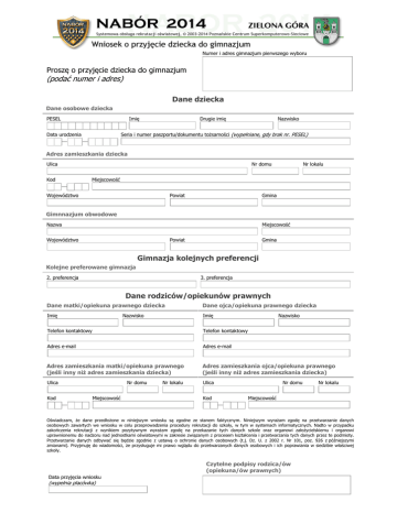 Numer i adres gimnazjum pierwszego wyboru Proszę o przyjęcie dziecka do gimnazjum (podać numer i adres) Dane dziecka Dane osobowe dziecka PESEL Imię Nazwisko Seria i numer paszportu/dokumentu tożsamości (wypełniane, gdy brak nr. PESEL) Data urodzenia — Drugie imię — Adres zamieszkania dziecka Ulica Nr domu Kod Nr lokalu Miejscowość — Województwo Powiat Gmina Gimnnazjum obwodowe Nazwa Miejscowość Województwo Powiat Gmina Gimnazja kolejnych preferencji Kolejne preferowane gimnazja 2. preferencja 3. preferencja Dane rodziców/opiekunów prawnych Dane matki/opiekuna prawnego dziecka Dane ojca/opiekuna prawnego dziecka Imię Imię Nazwisko Nazwisko Telefon kontaktowy Telefon kontaktowy Adres e-mail Adres e-mail Adres zamieszkania matki/opiekuna prawnego (jeśli inny niż adres zamieszkania dziecka) Adres zamieszkania ojca/opiekuna prawnego (jeśli inny niż adres zamieszkania dziecka) Ulica Ulica Nr domu Kod Miejscowość — Nr lokalu Nr domu Kod Nr lokalu Miejscowość — Oświadczam, że dane przedłożone w niniejszym wniosku są zgodne ze stanem faktycznym. Niniejszym wyrażam zgodę na przetwarzanie danych osobowych zawartych we wniosku w celu przeprowadzenia procedury rekrutacji do szkoły, w tym w systemach informatycznych. Nadto w przypadku zakończenia rekrutacji z wynikiem pozytywnym wyrażam zgodę na przekazanie tych danych szkole oraz organowi założycielskiemu i organowi uprawnionemu do nadzoru nad jednostkami oświatowymi w zakresie związanym z procesem kształcenia i przetwarzania tych danych przez te podmioty. Przetwarzanie danych odbywać się będzie zgodnie z ustawą o ochronie danych osobowych (t.j. Dz. U. z 2002 r. Nr 101, poz. 926 z późniejszymi zmianami). Przyjmuję do wiadomości, że przysługuje mi prawo wglądu do przetwarzanych danych osobowych i ich poprawiania w siedzibie właściwej szkoły. Czytelne podpisy rodzica/ów (opiekuna/ów prawnych) Data przyjęcia wniosku (wypełnia placówka)