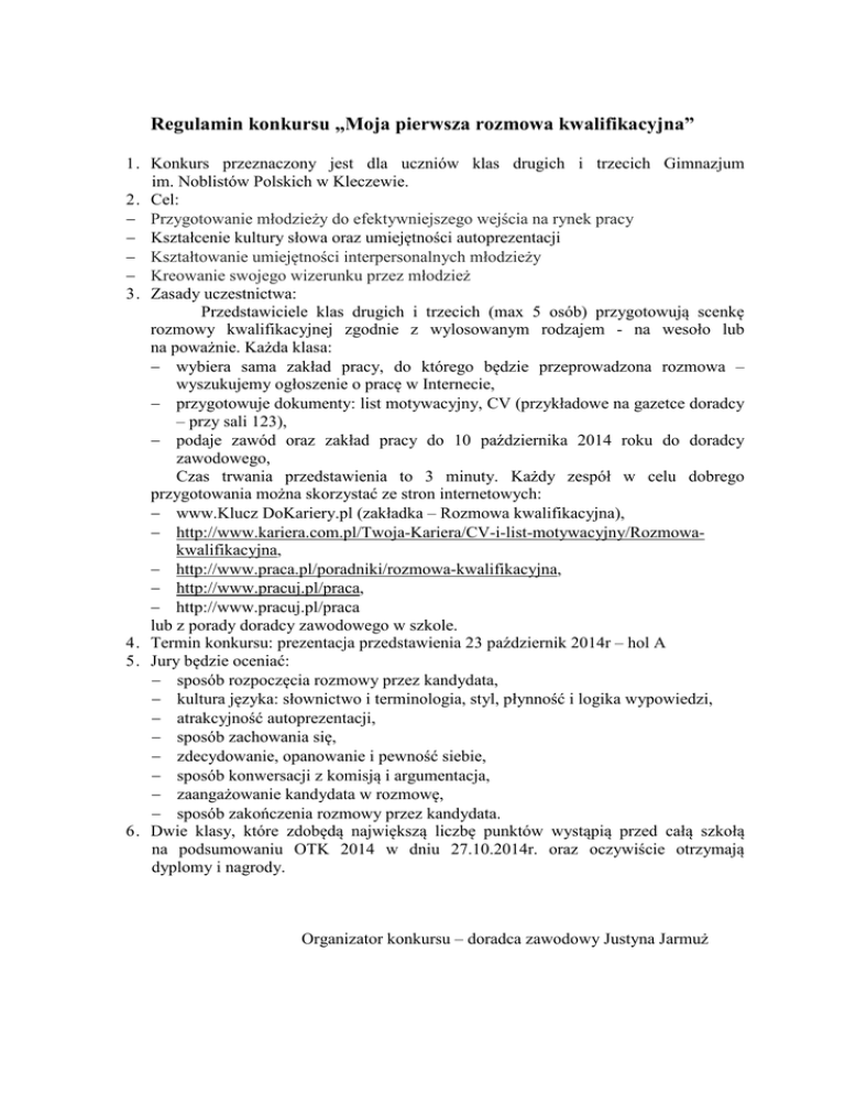 Regulamin konkursu „Moja pierwsza rozmowa kwalifikacyjna” 1. Konkurs przeznaczony jest dla uczniów klas drugich i trzecich Gimnazjum im. Noblistów Polskich w Kleczewie. 2. Cel: − Przygotowanie młodzieży do efektywniejszego wejścia na rynek pracy − Kształcenie kultury słowa oraz umiejętności autoprezentacji − Kształtowanie umiejętności interpersonalnych młodzieży − Kreowanie swojego wizerunku przez młodzież 3. Zasady uczestnictwa: Przedstawiciele klas drugich i trzecich (max 5 osób) przygotowują scenkę rozmowy kwalifikacyjnej zgodnie z wylosowanym rodzajem - na wesoło lub na poważnie. Każda klasa: − wybiera sama zakład pracy, do którego będzie przeprowadzona rozmowa – wyszukujemy ogłoszenie o pracę w Internecie, − przygotowuje dokumenty: list motywacyjny, CV (przykładowe na gazetce doradcy – przy sali 123), − podaje zawód oraz zakład pracy do 10 października 2014 roku do doradcy zawodowego, Czas trwania przedstawienia to 3 minuty. Każdy zespół w celu dobrego przygotowania można skorzystać ze stron internetowych: − www.Klucz DoKariery.pl (zakładka – Rozmowa kwalifikacyjna), − http://www.kariera.com.pl/Twoja-Kariera/CV-i-list-motywacyjny/Rozmowakwalifikacyjna, − http://www.praca.pl/poradniki/rozmowa-kwalifikacyjna, − http://www.pracuj.pl/praca, − http://www.pracuj.pl/praca lub z porady doradcy zawodowego w szkole. 4. Termin konkursu: prezentacja przedstawienia 23 październik 2014r – hol A 5. Jury będzie oceniać: − sposób rozpoczęcia rozmowy przez kandydata, − kultura języka: słownictwo i terminologia, styl, płynność i logika wypowiedzi, − atrakcyjność autoprezentacji, − sposób zachowania się, − zdecydowanie, opanowanie i pewność siebie, − sposób konwersacji z komisją i argumentacja, − zaangażowanie kandydata w rozmowę, − sposób zakończenia rozmowy przez kandydata. 6. Dwie klasy, które zdobędą największą liczbę punktów wystąpią przed całą szkołą na podsumowaniu OTK 2014 w dniu 27.10.2014r. oraz oczywiście otrzymają dyplomy i nagrody. Organizator konkursu – doradca zawodowy Justyna Jarmuż