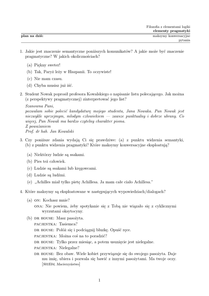 Filozofia z elementami logiki elementy pragmatyki maksymy konwersacyjne pytania plan na dziś: 1. Jakie jest znaczenie semantyczne poniższych komunikatów? A jakie może być znaczenie pragmatyczne? W jakich okolicznościach? (a) Piękny sweter! (b) Tak, Paryż leży w Hiszpanii. To oczywiste! (c) Nie mam czasu. (d) Chyba musisz już iść. 2. Student Nowak poprosił profesora Kowalskiego o napisanie listu polecającego. Jak można (z perspektywy pragmatycznej) zinterpretować jego list? Szanowna Pani, pozwalam sobie polecić kandydaturę mojego studenta, Jana Nowaka. Pan Nowak jest niezwykle uprzejmym, młodym człowiekiem — zawsze punktualny i dobrze ubrany. Co więcej, Pan Nowak ma bardzo czytelny charakter pisma. Z poważaniem Prof. dr hab. Jan Kowalski 3. Czy poniższe zdania wydają Ci się prawdziwe: (a) z punktu widzenia semantyki, (b) z punktu widzenia pragmatyki? Które maksymy konwersacyjne eksploatują? (a) Niektórzy ludzie są ssakami. (b) Pies też człowiek. (c) Ludzie są ssakami lub kręgowcami. (d) Ludzie są ludźmi. (e) „Achilles miał tylko pietę Achillesa. Ja mam całe ciało Achillesa.” 4. Które maksymy są eksploatowane w następujących wypowiedziach/dialogach? (a) on: Kochasz mnie? ona: Nie powiem, żeby spotykanie się z Tobą nie wiązało się z cyklicznymi wyrzutami oksytocyny. (b) dr house: Masz pasożyta. pacjentka: Tasiemca? dr house: Połóż się i podciągnij bluzkę. Opuść ręce. pacjentka: Można coś na to poradzić? dr house: Tylko przez miesiąc, a potem usunięcie jest nielegalne. pacjentka: Nielegalne? dr house: Bez obaw. Wiele kobiet przywiązuje się do swojego pasożyta. Daje mu imię, ubiera i pozwala się bawić z innymi pasożytami. Ma twoje oczy. [S01E04, Macierzyństwo] 1 (c) dr house: Gdzie jest Foreman? wendy: Gdzieś tutaj. dr house: Bardzo mi pomogłaś. wendy: Wie pan, o której dziś skończy? dr house: O którejś. [S03E14, Nieczuła] (d) dr wilson: On każdego roku leczy tysiące ludzi, a ty ilu? 30? dr house: McDonald karmi lepiej niż matka, bo robi więcej hamburgerów? [S02E04, Gruźlica czy nie gruźlica?] 5. Podaj przykład pytania rozstrzygnięcia, prostego pytania rozstrzygnięcia oraz pytania dopełnienia o naturę relacji Małgosi z płcią przeciwną. 6. Podaj przykładowe odpowiedzi bezpośredniej i częściowej dla następujących pytań: (a) Ile jest dwa razy dwa? (b) Kto jest prezydentem Polski? (c) Gdzie jedziesz na wakacje? (d) Czym jest sens życia? 7. Podziel poniższe pytania na trafne i nietrafne. Dla każdego z pytań podaj przykładową presupozycję. (a) Kto prowadzi zajęcia z wprowadzenia do psychologii w sali 209 (Międzychodzka, Poznań), w czwartki od 8:00? (b) Czy Warszawa jest stolicą Polski? (c) Kto jest autorem książki „Kocia kołyska”? (d) Jakie metody badawcze są stosowane w psychologii? (e) O ile lat jesteś starszy od swojej mamy? (f) Kto partnerował Johnny’emu Deppowi w filmie „Sok z żuka”? (g) Ilu mieszkańców ma Poznań? (h) Czy Johnny Depp grał w „Jeźdźcu bez głowy”? 8. Czy każda odpowiedź właściwa na pytanie musi być odpowiedzią prawdziwą? A czy każda odpowiedź prawdziwa musi być właściwa? Podaj przykłady uzasadniające odpowiedzi. 9. Spróbuj znaleźć kontekst, w którym pytanie Czy przestał Pan już bić swój komputer? będzie pytaniem trafnym i taki, w którym będzie ono nietrafne. 2