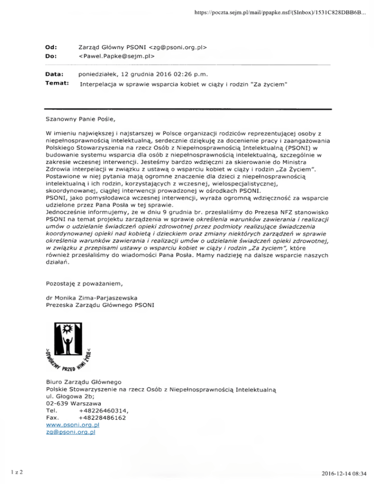 https://poczta.sejm.pl/mail/ppapke.nsf/($Inbox)/1531C828DBB6B... Od: Zarząd Główny PSONI <[email protected]> Do: <[email protected]> Data: poniedziałek, 12 grudnia 2016 02:26 p.m. Temat: Interpelacja w sprawie wsparcia kobiet w ciąży i rodzin "Za życiem" Szanowny Panie Pośle, W imieniu największej i najstarszej w Polsce organizacji rodziców reprezentującej osoby z niepełnosprawnością intelektualną, serdecznie dziękuję za docenienie pracy i zaangażowania Polskiego Stowarzyszenia na rzecz Osób z Niepełnosprawnością Intelektualną (PSONI) w budowanie systemu wsparcia dla osób z niepełnosprawnością intelektualną, szczególnie w zakresie wczesnej interwencji. Jesteśmy bardzo wdzięczni za skierowanie do Ministra Zdrowia interpelacji w związku z ustawą o wsparciu kobiet w ciąży i rodzin „Za Życiem". Postawione w niej pytania mają ogromne znaczenie dla dzieci z niepełnosprawnością intelektualną i ich rodzin, korzystających z wczesnej, wielospecjalistycznej, skoordynowanej, ciągłej interwencji prowadzonej w ośrodkach PSONI. PSONI, jako pomysłodawca wczesnej interwencji, wyraża ogromną wdzięczność za wsparcie udzielone przez Pana Posła w tej sprawie. Jednocześnie informujemy, że w dniu 9 grudnia br. przesłaliśmy do Prezesa NFZ stanowisko PSONI na temat projektu zarządzenia w sprawie określenia warunków zawierania i realizacji umów o udzielanie świadczeń opieki zdrowotnej przez podmioty realizujące świadczenia koordynowanej opieki nad kobietą i dzieckiem oraz zmiany niektórych zarządzeń w sprawie określenia warunków zawierania i realizacji umów o udzielanie świadczeń opieki zdrowotnej, w związku z przepisami ustawy o wsparciu kobiet w ciąży i rodzin „Za życiem", które również przesłaliśmy do wiadomości Pana Posła. Mamy nadzieję na dalsze wsparcie naszych działań. Pozostaję z poważaniem, dr Monika Zima-Parjaszewska Prezeska Zarządu Głównego PSONI Biuro Zarządu Głównego Polskie Stowarzyszenie na rzecz Osób z Niepełnosprawnością Intelektualną ul. Głogowa 2b; 02-639 Warszawa Tel. +48226460314, Fax. +48228486162 www.psoni.ora.pl [email protected] 1z 2 2016-12-14 08:34