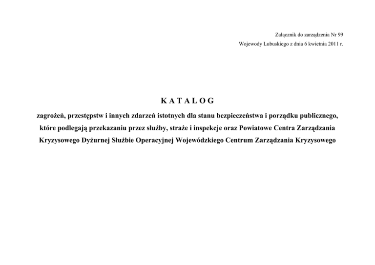 Załącznik do zarządzenia Nr 99 Wojewody Lubuskiego z dnia 6 kwietnia 2011 r. KATALOG zagrożeń, przestępstw i innych zdarzeń istotnych dla stanu bezpieczeństwa i porządku publicznego, które podlegają przekazaniu przez służby, straże i inspekcje oraz Powiatowe Centra Zarządzania Kryzysowego Dyżurnej Służbie Operacyjnej Wojewódzkiego Centrum Zarządzania Kryzysowego I. II. III. IV. V. VI. VII. KOMENDA WOJEWÓDZKA POLICJI Strona ……………………………………………………………………………………………………………….. 2 KOMENDA WOJEWÓDZKA PAŃSTWOWEJ STRAŻY POŻARNEJ Strona ………………………………………………………………………………………………………………... 7 PAŃSTWOWA INSPEKCJA SANITARNA Strona ……………………………………………………………………………………………………………..…. 9 PAŃSTWOWA INSPEKCJA WETERYNARYJNA Strona ………………………………………………………………………………………………………….……... 10 NADODRZAŃSKI ODDZIAŁ STRAŻY GRANICZNEJ Strona ………………………………………………………………………………………………………….…..…. 11 POWIATOWE CENTRA ZARZĄDZANIA KRYZYSOWEGO Strona .............................................................................................................................................................................. 12 CENTRUM POWIADAMIANIA RATUNKOWEGO, LEKARZ KOORDYNATOR RATOWNICTWA MEDYCZNEGO Strona ............................................................................................................................................................................. 13 UWAGI I SŁOWNIK POJĘĆ Strona …………………………………………………………………………………………………………….. .... 14 2 I. KOMENDA WOJEWÓDZKA POLICJI Forma przekazania informacji Lp. 1. 2. 3. 4. 5. Informacja podlegająca przekazaniu Zamach na życie, czynna napaść lub znieważenie Prezydenta RP lub innego organu konstytucyjnego RP albo przedstawiciela obcego państwa, korzystającego z immunitetu. Szpiegostwo lub ujawnienie faktu wskazującego na działanie obcego wywiadu, organizacji ekstremistycznej lub terrorystycznej. Podłożenie ładunku wybuchowego lub zgłoszenie podłożenia ładunku wybuchowego. Pożar: a) w wyniku którego zginął człowiek, b) gdy wstępny szacunek wykazuje straty w mieniu wielkiej wartości, c) materiałów chemicznych, toksycznych, promieniotwórczych, którego skutki zagrażają życiu lub zdrowiu ludzi, d) w obiekcie użyteczności publicznej (administracji rządowej, samorządowej, wymiaru sprawiedliwości, organizacji politycznej, sakralnym) – bez względu na straty. Uprowadzenie statku wodnego lub powietrznego, lądowego środka przewozu publicznego. Meldunek dobowy Informacja telefoniczna Meldunek doraźny X X X Uwagi X X X X X X 3 6. 7. 8. 9. 10. 11. 12. 13. 14. 15. 16. 17. Akt terrorystyczny. Awaria techniczna. Katastrofa naturalna (inna niż pożar). Zabójstwo. Uprowadzenie osoby w celu wymuszenia okupu. Zabór materiałów wybuchowych, promieniotwórczych lub toksycznych bez względu na sposób działania sprawców. Utrata, w inny sposób niż na skutek przestępstwa: materiałów wybuchowych, promieniotwórczych lub toksycznych oraz nielegalne posiadanie, wyrób, handel i przemyt broni palnej, amunicji, urządzeń i materiałów wybuchowych. Kradzież z włamaniem do obiektu: a) naczelnych organów władzy, administracji państwowej, rządowej, samorządowej szczebla co najmniej wojewódzkiego, partii politycznej, prokuratury, sądu, b) przedstawicielstwa dyplomatycznego, urzędu konsularnego, agendy obcego państwa. Przemyt, nielegalne wytwarzanie, wprowadzanie do obrotu, udzielanie lub posiadanie środków odurzających, psychotropowych o wartości rynkowej co najmniej znacznej wartości. Profanacja cmentarzy, miejsc i przedmiotów pamięci narodowej lub kultu religijnego. Protesty społeczne. Zbiorowe zakłócenie porządku publicznego związane z masową imprezą lub zgromadzeniem publicznym. 18. Dezercja z bronią palną. X X X X X X X X X X X X X X X X X X X X 4 19. 20. 21. 22. 23. 24. 25. 26. 27. 28. 29. 30. Bunt lub zbiorowa ucieczka z ośrodka odosobnienia prawnego. Wypadek w ruchu drogowym, kolejowym, wodnym, powietrznym, w którym śmierć poniosła co najmniej jedna osoba. Kolizja powodująca zablokowanie ruchu na głównych szlakach komunikacyjnych. Katastrofa komunikacyjna w ruchu lądowym, wodnym, powietrznym. Wypadek w ruchu drogowym, kolejowym, wodnym, powietrznym z udziałem przedstawiciela władzy administracji publicznej, a także akredytowanego w Polsce przedstawiciela obcego państwa. Nielegalny transport, składowanie lub pozostawienie bez zabezpieczenia materiałów promieniotwórczych, toksycznych. Przestępstwo popełnione z wykorzystaniem elementów umundurowania lub wyposażenia policyjnego. Uruchomienie zorganizowanych działań w ramach akcji lub operacji policyjnych (pościgi, blokady, przeszukiwanie terenu). Wydarzenie z udziałem obywatela obcego państwa, posiadającego immunitet dyplomatyczny lub konsularny. Zamach na obiekt użyteczności publicznej lub mienie resortu spraw wewnętrznych. Czynna napaść na policjanta lub innego funkcjonariusza służby publicznej. Utrata lub udostępnienie broni osobie nieuprawnionej, nieostrożne obchodzenie się z bronią i materiałami wybuchowymi skutkujące ofiarami śmiertelnymi, rannymi lub zniszczeniem mienia co najmniej znacznej wartości. X X X X X X X X X X X X X X X X X X X 5 31. 32. 33. 34. Użycie broni palnej lub środka przymusu bezpośredniego w trakcie służby lub poza nią, w wyniku którego nastąpiła śmierć lub ciężki uszczerbek na zdrowiu. Spowodowanie przez policjanta kolizji lub wypadku drogowego pod wpływem alkoholu. Samobójstwo policjanta
