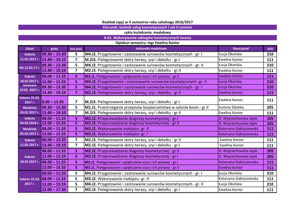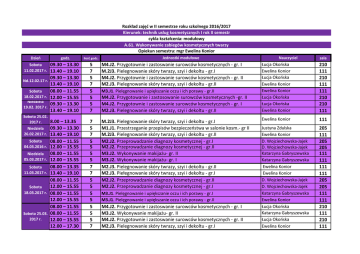 Rozkład zajęć w II semestrze roku szkolnego 2016/2017 Kierunek: technik usług kosmetycznych I rok II semestr cykla kształcenia: modułowy A.61. Wykonywanie zabiegów kosmetycznych twarzy Opiekun semestru: mgr Ewelina Konior Dzień godz. 09.30 – 13.30 13.40 – 19.10 09.30 – 13.30 Nd.12.02.17 r. 13.40 – 19.10 Sobota 08.00 – 11.55 18.02.2017 r. 12.00 – 15.55 Niedziela 09.30 – 13.30 19.02. 2017 r. 13.40 – 19.10 Sobota 11.02.2017 r. Sobota 25.02. 2017 r. Niedziela 26.02.2017 r. Sobota 04.03.2016 r. Niedziela 05.03.2017 r. Sobota 11.03.2017 r. Sobota 18.03.2017 r. Sobota 25.03. 2017 r. 8.00 – 13.35 09.30 – 13.30 13.40 – 19.10 08.00 – 11.55 12.00 – 15.55 08.00 – 11.55 12.00 – 15.55 08.00 – 13.35 13.40 – 19.10 08.00 – 11.55 12.00 – 15.55 08.00 – 11.55 12.00 – 15.55 08.00 – 11.55 08.00 – 11.55 12.00 – 15.55 12.00 – 17.30 ilość godz. 5 7 5 7 5 5 5 7 7 5 7 5 5 5 5 7 7 5 5 5 5 5 5 5 7 Jednostki modułowe M4.J2. Przygotownie i zastoswanie surowców kosmetycznych - gr. I M.2J3. Pielegnowanie skóry twrazy, szyi i dekoltu - gr.I M4.J2. Przygotownie i zastoswanie surowców kosmetycznych - gr. II M2.J3. Pielegnowanie skóry twrazy, szyi i dekoltu - gr.II M3.J1. Pielęgnowanie i upiększanie oczu i ich porawy - gr.II M4.J2. Przygotowanie i zastosowanie surowców kosmetycznych -gr. II M4.J2. Przygotownie i zastoswanie surowców kosmetycznych - gr. I M2.J3. Pielegnowanie skóry twrazy, szyi i dekoltu - gr.II M.2J3. Pielegnowanie skóry twrazy, szyi i dekoltu - gr.I M1.J1. Przestrzeganie przepisów bezpieczeństwa w salonie kosm.- gr II M.2J3. Pielegnowanie skóry twrazy, szyi i dekoltu - gr.II M2.J2. Przeprowadzanie diagnozy kosmetycznej - gr.I M2.J2. Przeprowadzanie diagnozy kosmetycznej - gr.II M3.J2. Wykonywanie makijażu- gr. II M3.J2. Wykonywanie makijażu- gr. I M2.J3. Pielegnowanie skóry twrazy, szyi i dekoltu - gr.II M2.J3. Piełegnowanie skóry twrazy, szyi i dekoltu - gr.I M2.J2. Przeprowadzanie diagnozy kosmetycznej - gr.II M2.J2. Przeprowadzanie diagnozy kosmetycznej - gr.I M3.J1. Pielęgnowanie i upiększanie oczu i ich porawy - gr.I M3.J1. Pielęgnowanie i upiększanie oczu i ich porawy - gr.II M4.J2. Przygotownie i zastoswanie surowców kosmetycznych - gr. I M3.J2. Wykonywanie makijażu- gr. II M4.J2. Przygotownie i zastoswanie surowców kosmetycznych - gr. II M2.J3. Pielegnowanie skóry twrazy, szyi i dekoltu - gr.I Nauczyciel sala Łucja Okońska Ewelina Konior Łucja Okońska Ewelina Konior Ewelina Konior Łucja Okońska Łucja Okońska Ewelina Konior 210 111 210 111 111 210 210 111 Ewelina Konior 111 Justyna Zdulska Ewelina Konior D. Wojciechowska-Jajek D. Wojciechowska-Jajek Katarzyna Gabryszewska Katarzyna Gabryszewska Ewelina Konior Ewelina Konior D. Wojciechowska-Jajek D. Wojciechowska-Jajek Katarzyna Gabryszewska Ewelina Konior Łucja Okońska Katarzyna Gabryszewska Łucja Okońska Ewelina Konior 205 111 205 205 111 111 111 111 205 205 111 111 210 111 210 111 M2.J2. Przeprowadzanie diagnozy kosmetycznej - gr.I M2.J2. Przeprowadzanie diagnozy kosmetycznej - gr.II M4.J2. Przygotowanie i zastosowanie surowców kosmetycznych -gr. II 08.00 – 11.55 12.00 – 15.55 Sobota 01.04.2017 r. 08.00 – 11.55 12.00 – 15.55 08.00 – 11.55 Niedziela 02.04.2017 r. 12.00 – 15.55 5 5 5 5 5 5 08.00 – 11.55 5 12.00 – 15.55 12.00 – 17.30 5 7 M4.J2. Przygotownie i zastoswanie surowców kosmetycznych - gr. I M1.J1. Przestrzeganie przepisów bezpieczeństwa w salonie kosm.- gr I M4.J1. Wykonywanie zabiegów fizykalnych na skórę twarzy, szyi i dekoltu D. Wojciechowska-Jajek gr I M4.J1. Wykonywanie zabiegów fizykalnych na skórę twarzy, szyi i dekoltu D. Wojciechowska-Jajek gr II Ewelina Konior M2.J3. Pielegnowanie skóry twrazy, szyi i dekoltu - gr.I 13.40 – 19.10 7 M2.J3. Pielegnowanie skóry twrazy, szyi i dekoltu - gr.II Ewelina Konior 111 08.00 – 11.55 5 Katarzyna Gabryszewska 111 08.00 – 11.55 5 D. Wojciechowska-Jajek 205 12.00 – 15.55 08.00 – 11.55 12.00 – 15.55 08.00 – 13.35 Niedziela 30.04.2017 r. 13.40 – 19.10 08.00 – 13.35 Niedziela 07.05. 17 r. 13.40 – 19.10 5 5 5 7 7 7 7 D. Wojciechowska-Jajek 205 Justyna Zdulska Justyna Zdulska Ewelina Konior Ewelina Konior Ewelina Konior Ewelina Konior 210 210 111 111 111 111 08.00 – 11.55 5 D. Wojciechowska-Jajek 205 12.00 – 15.55 08.00 – 13.35 Niedziela 14.05. 17 r. 13.40 – 19.10 08.00 – 13.35 Niedziela 5 7 7 7 M3.J2. Wykonywanie makijażu- gr. I M4.J1. Wykonywanie zabiegów fizykalnych na skórę twarzy, szyi i dekoltu gr I M4.J1. Wykonywanie zabiegów fizykalnych na skórę twarzy, szyi i dekoltu gr II M1.J1. Przestrzeganie przepisów bezpieczeństwa w salonie kosm.- gr II M1.J1. Przestrzeganie przepisów bezpieczeństwa w salonie kosm.- gr I M2.J3. Pielegnowanie skóry twrazy, szyi i dekoltu - gr.I M2.J3. Pielegnowanie skóry twrazy, szyi i dekoltu - gr.II M2.J3. Pielegnowanie skóry twrazy, szyi i dekoltu - gr.II M2.J3. Pielegnowanie skóry twrazy, szyi i dekoltu - gr.I M4.J1. Wykonywanie zabiegów fizykalnych na skórę twarzy, szyi i dekoltu gr I M4.J1. Wykonywanie zabiegów fizykalnych na skórę twarzy, szyi i dekoltu gr II M2.J3. Pielegnowanie skóry twrazy, szyi i dekoltu - gr.I M2.J3. Pielegnowanie skóry twrazy, szyi i dekoltu - gr.II M2.J3. Pielegnowanie skóry twrazy, szyi i dekoltu - gr.II D. Wojciechowska-Jajek 205 Ewelina Konior Ewelina Konior Ewelina Konior 111 111 111 Sobota 08.04.2017 r. Niedziela 09.04.2017 r. Sobota 22.04.2017 r. Sobota 29.04. 2017 r. Sobota 13.05. 17 r. 21.05.2017 r. M3.J1. Pielęgnowanie i upiększanie oczu i ich porawy - gr.I D. Wojciechowska-Jajek D. Wojciechowska-Jajek Łucja Okońska Katarzyna Gabryszewska Łucja Okońska Justyna Zdulska 205 205 210 111 210 205 205 205 111 Niedziela 21.05.2017 r. 13.40 – 19.10 08.00 – 13.35 Niedziela 28.05. 17 r. 13.40 – 19.10 Sobota 08.00 – 11.55 03.06.17 r. 12.00 – 15.55 7 7 7 5 5 M2.J3. Pielegnowanie skóry twrazy, szyi i dekoltu - gr.I M2.J3. Pielegnowanie skóry twra