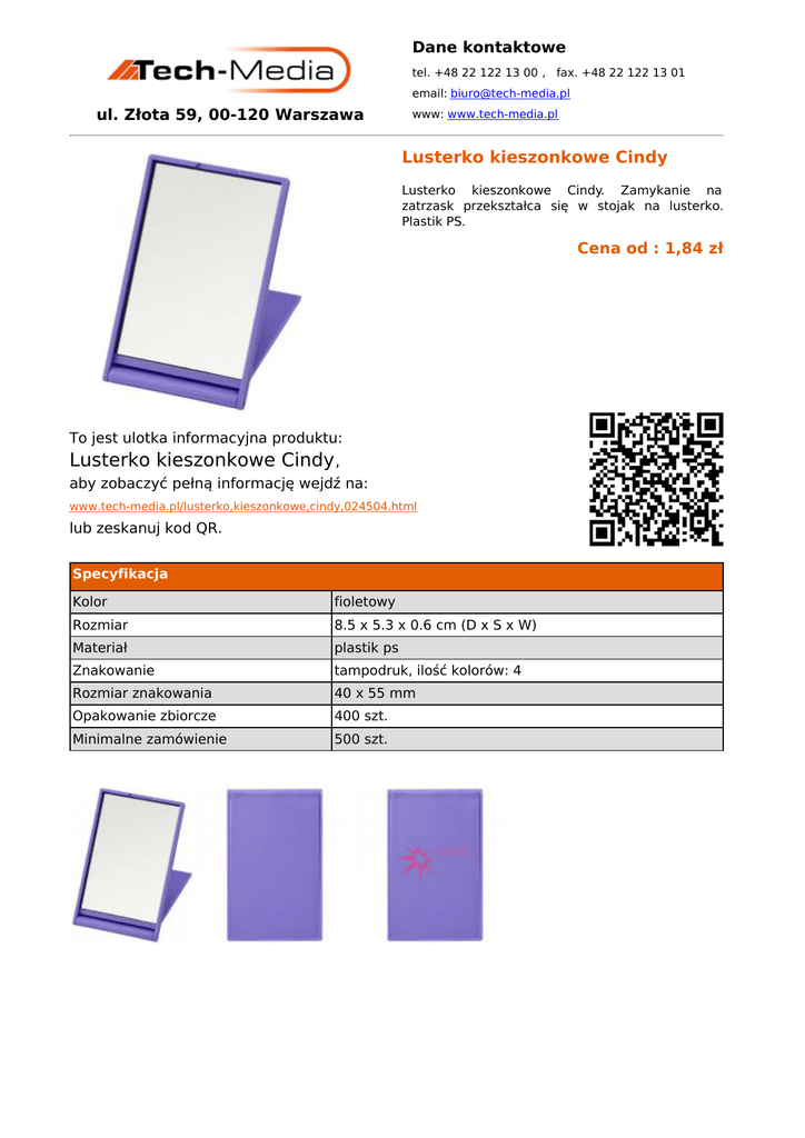 Dane kontaktowe tel. +48 22 122 13 00 , fax. +48 22 122 13 01 email: [email protected] ul. Złota 59, 00-120 Warszawa www: www.tech-media.pl Lusterko kieszonkowe Cindy Lusterko kieszonkowe Cindy. Zamykanie na zatrzask przekształca się w stojak na lusterko. Plastik PS. Cena od : 1,84 zł To jest ulotka informacyjna produktu: Lusterko kieszonkowe Cindy , aby zobaczyć pełną informację wejdź na: www.tech-media.pl/lusterko,kieszonkowe,cindy,024504.html lub zeskanuj kod QR. Specyfikacja Kolor fioletowy Rozmiar 8.5 x 5.3 x 0.6 cm (D x S x W) Materiał plastik ps Znakowanie tampodruk, ilość kolorów: 4 Rozmiar znakowania 40 x 55 mm Opakowanie zbiorcze 400 szt. Minimalne zamówienie 500 szt.