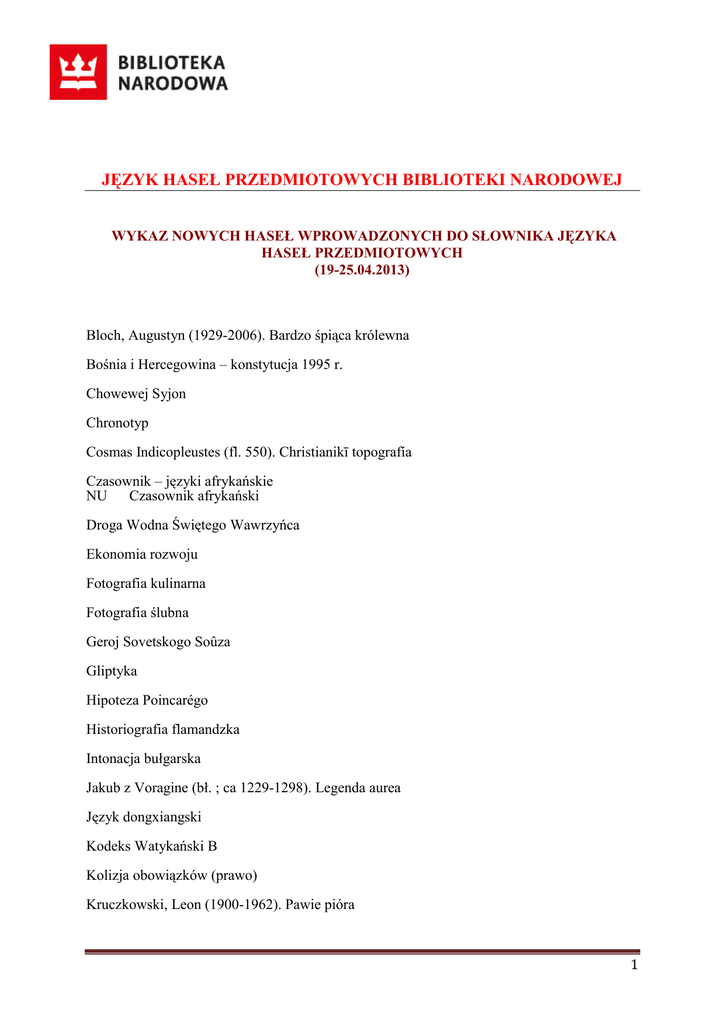 JĘZYK HASEŁ PRZEDMIOTOWYCH BIBLIOTEKI NARODOWEJ WYKAZ NOWYCH HASEŁ WPROWADZONYCH DO SŁOWNIKA JĘZYKA HASEŁ PRZEDMIOTOWYCH (19-25.04.2013) Bloch, Augustyn (1929-2006). Bardzo śpiąca królewna Bośnia i Hercegowina – konstytucja 1995 r. Chowewej Syjon Chronotyp Cosmas Indicopleustes (fl. 550). Christianikī topografía Czasownik – języki afrykańskie NU Czasownik afrykański Droga Wodna Świętego Wawrzyńca Ekonomia rozwoju Fotografia kulinarna Fotografia ślubna Geroj Sovetskogo Soûza Gliptyka Hipoteza Poincarégo Historiografia flamandzka Intonacja bułgarska Jakub z Voragine (bł. ; ca 1229-1298). Legenda aurea Język dongxiangski Kodeks Watykański B Kolizja obowiązków (prawo) Kruczkowski, Leon (1900-1962). Pawie pióra 1 Kulty cargo Lipsius, Justus (1547-1606). Saturnalium Sermonum libri duo, qui de gladiatoribus Listy wietnamskie Monety węgierskie Nagroda Artystyczna Nowy Obraz / Nowe Spojrzenie Nagroda Honorowa Świadek Historii Neuromarketing Nifo, Agostino (ca 1473-ca 1545). De intellectu Non-camera Operacja Perła (1981) Pakt stabilności i wzrostu (1997) Petrus Lombardus (ca 1095-1159). Sententiarum libri quattuor Rzeźba amatorska Rzeźba amatorska polska Rzeźbiarze amatorzy Rzeźbiarze amatorzy polscy Seksmisja (film) Seminaria treningowe Erharda Sempołowska, Stefania (1869-1944). Na ratunek Silingowie Symfonia (głos średni, chór mieszany i orkiestra) Umowa nienazwana Voting advice application Wąkrotka azjatycka Wieńce dożynkowe Zieliński, Sylwester (1781-1853). Ubiór Wojska Polskiego 2